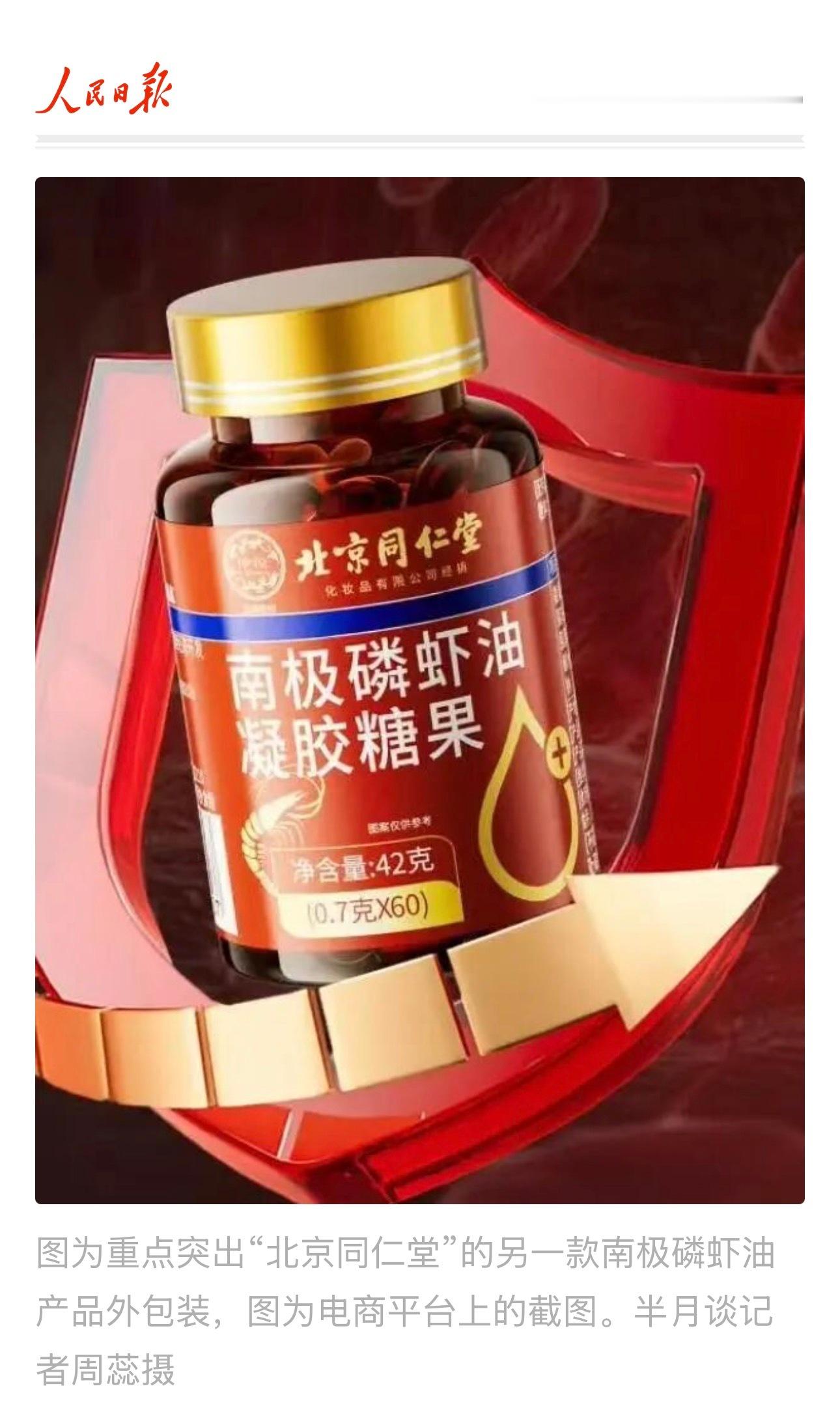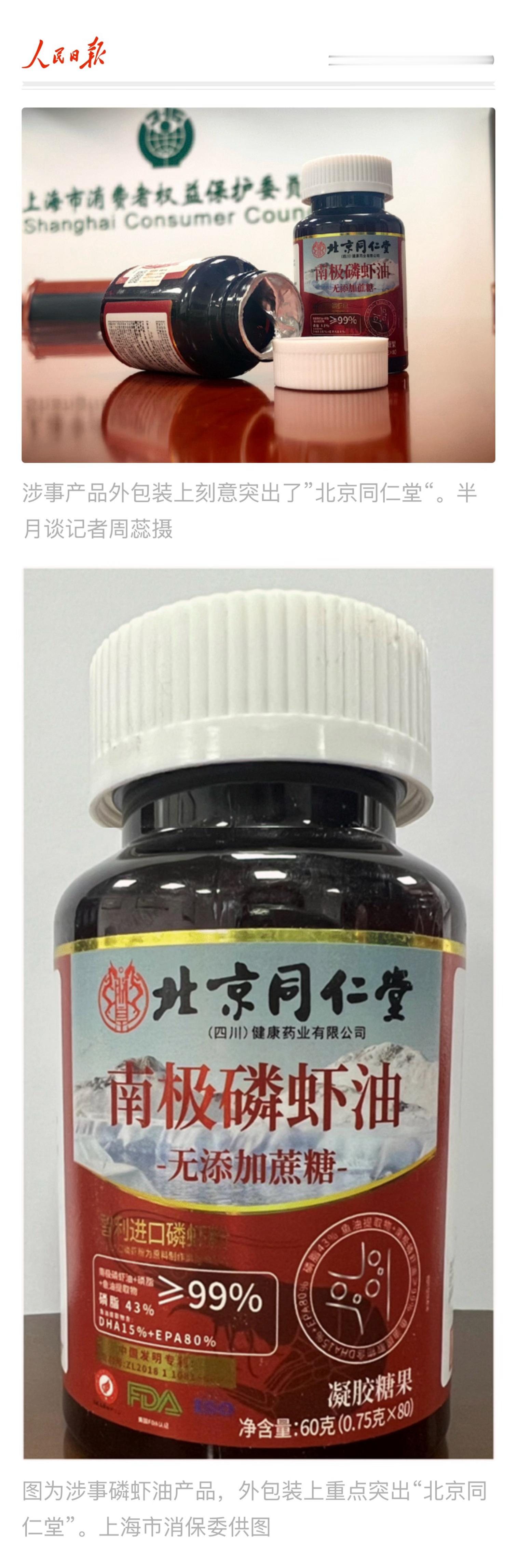 【远看是同仁堂,近看是“擦边球”!三问“同仁堂”磷虾油事件】 (半月谈微信公众号 2025-12-17 12:50 ) 一款号称是“北京同仁堂99%高纯南极磷虾油”产品,实际磷虾油含量竟然为“0”;远看包装是“北京同仁堂”,近看才发现“北京同仁堂”竟然是企业名称的一部分。这样荒唐的产品,为何能“大摇大摆”在电商平台上热销500万件? 一问:宣称99%高纯、实测竟为“0”,假磷虾油产品何以“横行”? 近日,上海市消保委委托中国水产科学研究院东海水产研究所,对市面上热销的15款国内外南极磷虾油产品开展了检测和调查,结果发现,一款标称“北京同仁堂99%高纯南极磷虾油”的产品,实测磷虾油含量竟然为“0”。 在某电商平台上,这款标称“北京同仁堂99%高纯南极磷虾油”的产品,宣称磷脂含量43%,其页面打着“高含量”“智利进口原料”“高度提纯”等宣传用语。该款产品在某电商平台上的页面引用营养健康专家的说法称,南极磷虾油产品是以南极磷虾为原料提取的虾油,含有磷脂成分,且以磷脂酰胆碱为主,“这种结构与人体细胞膜高度相似,能大幅提升营养成分的吸收效率”。 上海营养食品检验站高级工程师陆轶民介绍,以南极磷虾为原料提取的虾油必然含有磷脂成分,因此通过按照GB/T 5537-2008《粮油检验磷脂含量的测定》(第一法)进行检测发现该产品的磷脂含量为“0”,也就意味着这款“北京同仁堂99%高纯南极磷虾油”实际完全不含任何的磷虾油成分,与其宣称“磷脂含量43%”形成明显反差,涉嫌造假。 上海市消保委副秘书长唐健盛介绍,上海市消保委在对生产商“安徽哈博药业有限公司”和经销商“北京同仁堂(四川)健康药业有限公司”进行约谈。约谈中,生产商称,涉事产品由经销商北京同仁堂(四川)健康药业有限公司“定制采购”,采购价格远低于正常水平,承认在生产中未添加其对外宣称的“南极磷虾油”。北京同仁堂(四川)健康药业有限公司则在约谈中声称,“对产品涉嫌造假的行为毫不知情”。 果真如此吗?这款在电商平台上以每瓶60元销售的涉事产品,生产商的出厂价仅为每瓶3元到3.7元不等。在1688平台上,最便宜的磷虾油原料也需要每公斤200多元,业内人士告诉半月谈记者,用于生产软胶囊、凝胶糖果的磷虾油一般来说品质更高,市场价格一般在每公斤350元左右。按照每瓶规格60克、磷虾油添加比例50%计算,仅磷虾油一项的成本就需要至少6元。 “这样的出厂价格难道不反常识吗?”唐健盛说,作为长期从事健康药业经营的企业,北京同仁堂(四川)健康药业有限公司对磷虾油与鱼油的原料成本差异必然具备专业认知,不可能对 “远低于合理成本” 的采购价格毫无疑虑,明显悖于常识的超低价是否默认了 “原料并非真磷虾油” 的事实? 二问:巨大的“同仁堂”字样竟是企业名,“擦边球包装”谁说了算? 仔细观察涉事磷虾油产品,其外包装上的“北京同仁堂”大字异常醒目,页面宣传上也都标称产品品牌为“同仁堂(TRT)”。 这真的是“北京同仁堂”的产品吗?抽丝剥茧后发现,外包装上的“北京同仁堂”竟然是经销商“北京同仁堂(四川)健康药业有限公司”的企业名称中,对“北京同仁堂”五个大字专门突出做了误导性设计而成的“障眼法”。该产品的商标与“同仁堂双龙商标”并不相同,使用的是四川同仁堂健康药业自有商标“朕皇”,也就是说这其实是一款“朕皇”牌南极磷虾油产品。 唐健盛说,涉事包装的核心误导点是“突出含‘北京同仁堂’字样的经销商名称、使用与北京同仁堂核心商标高度相似的双龙图案”,这些元素的指向性极强,就是为了让消费者误认为产品是北京同仁堂直接生产。 在约谈中,北京同仁堂(四川)健康药业有限公司辩称,产品包装上具有误导性的表述均由生产商安徽哈博药业有限公司自行决定,与己无关;同时声称公司不涉及零售业务,涉事产品及公司其他产品在销售过程中出现的品牌混淆、消费误导等行为,均是下线经销商所为,与其无关。 这是真的吗?生产商称,产品包装按照北京同仁堂(四川)健康药业有限公司要求制作,还向上海市消保委出示了一张盖了四川同仁堂公章的“产品包装清样”,与平台上“擦边球包装”如出一辙。根据双方约定,生产商需要根据这一“生产图纸”进行生产。 “若没有北京同仁堂(四川)健康药业有限公司的要求,生产商完全没有必要主动设计此类指向明确的误导性元素,安徽哈博药业将所有定制产品都给了北京同仁堂(四川)健康药业有限公司,不会因包装有误导性而获得额外加工费,反而可能因包装侵权、误导消费者面临监管处罚风险,这种‘无收益却担风险’的行为完全违背企业经营理性。”唐健盛说。 三问:“擦边球式同仁堂宇宙”为何屡禁不绝? “擦边球式”销售的所谓“同仁堂磷虾油”产品是个例吗?半月谈记者在某知名电商平台上查询发现,涉事产品只是冰山一角,一个庞大而混乱的“擦边球式同仁堂宇宙”正在电商平台野蛮生长。 该电商平台销售排名第一是一款标称为“同仁堂南极高纯度磷虾油”产品,显示全网热销500万+、99%好评。有意思的是,这款产品同样采用了擦边球式的包装方法和宣传方式,外包装上是大大的“北京同仁堂”字样,底下用极小的字样写着“化妆品有限公司经销”。 在商品详情页上,该产品标称的规格参数称品牌名为同仁堂(TRT),还在页面上专门