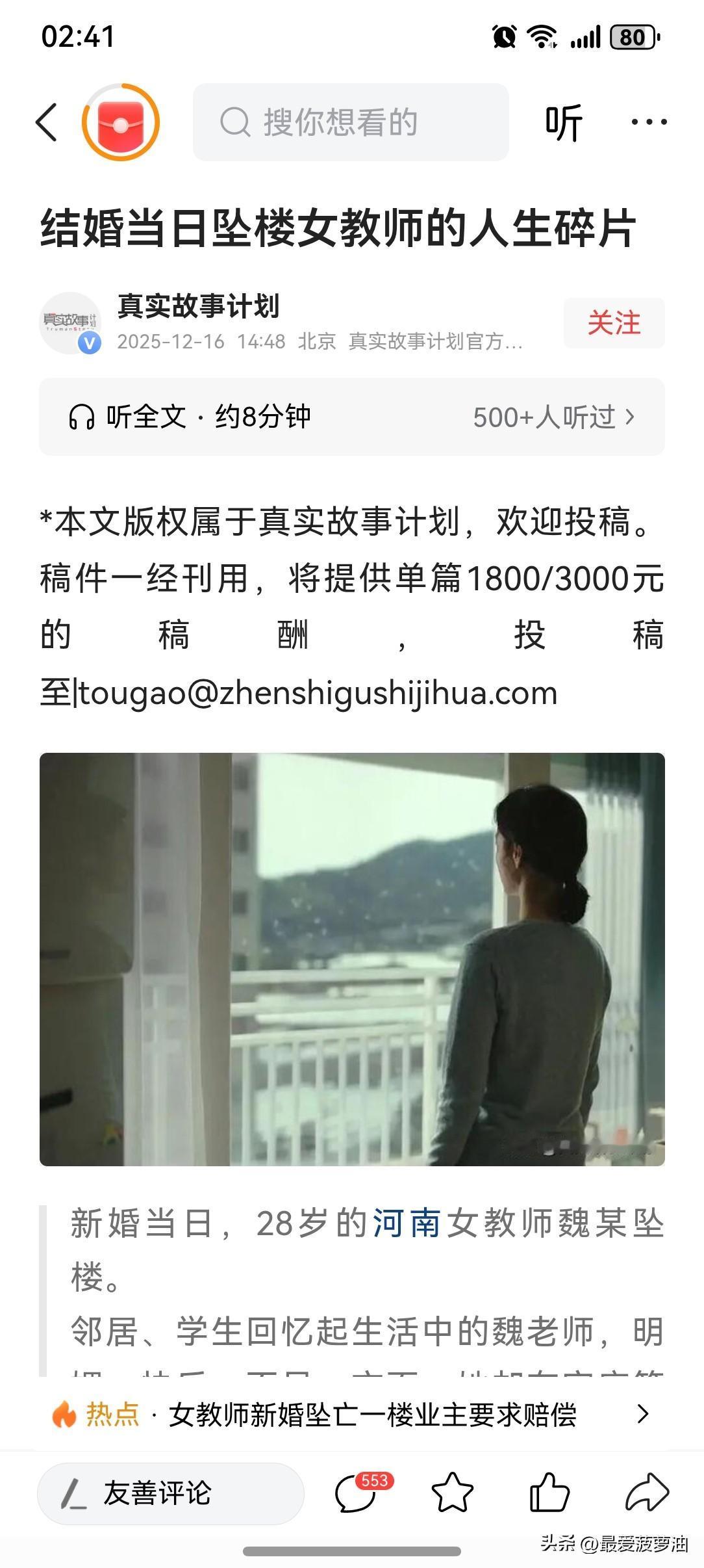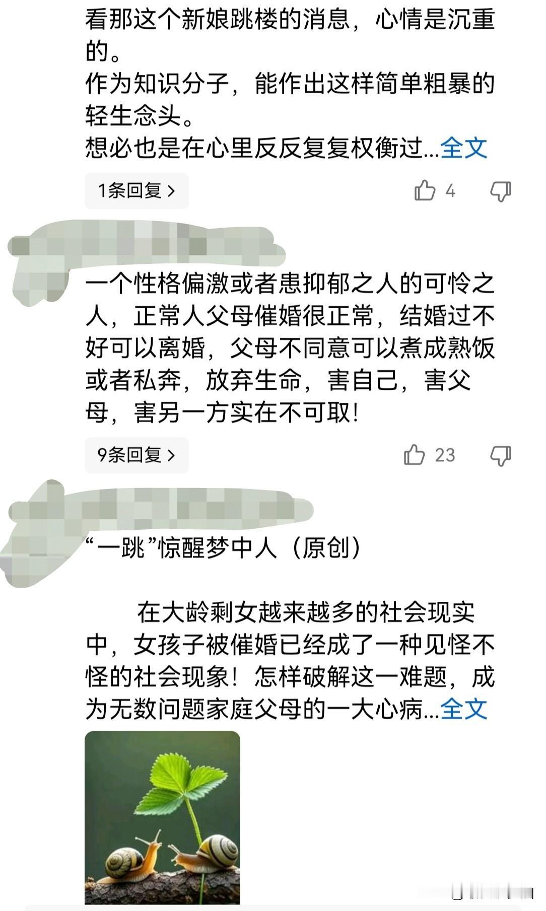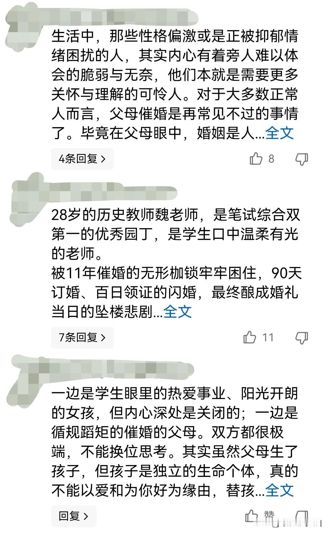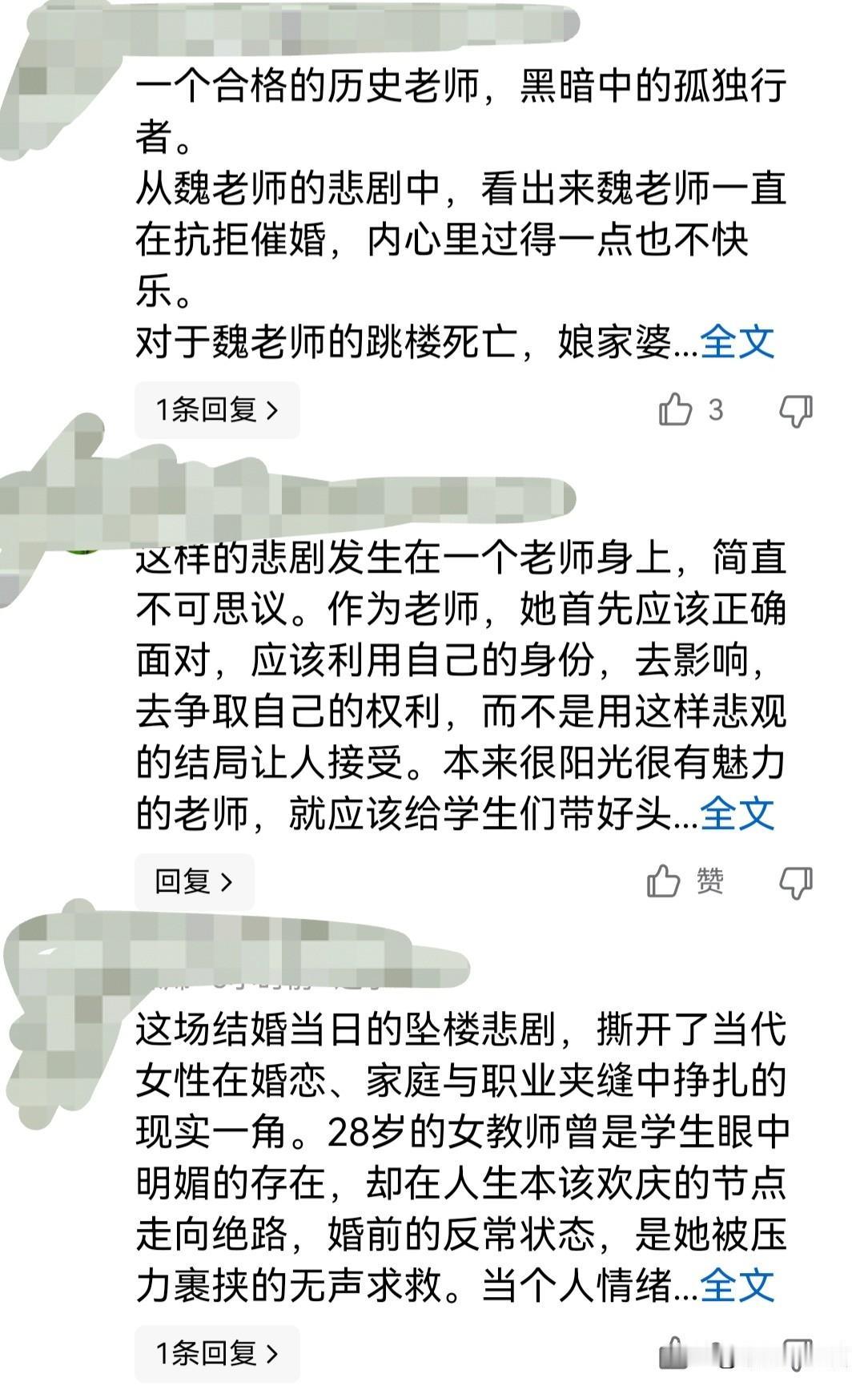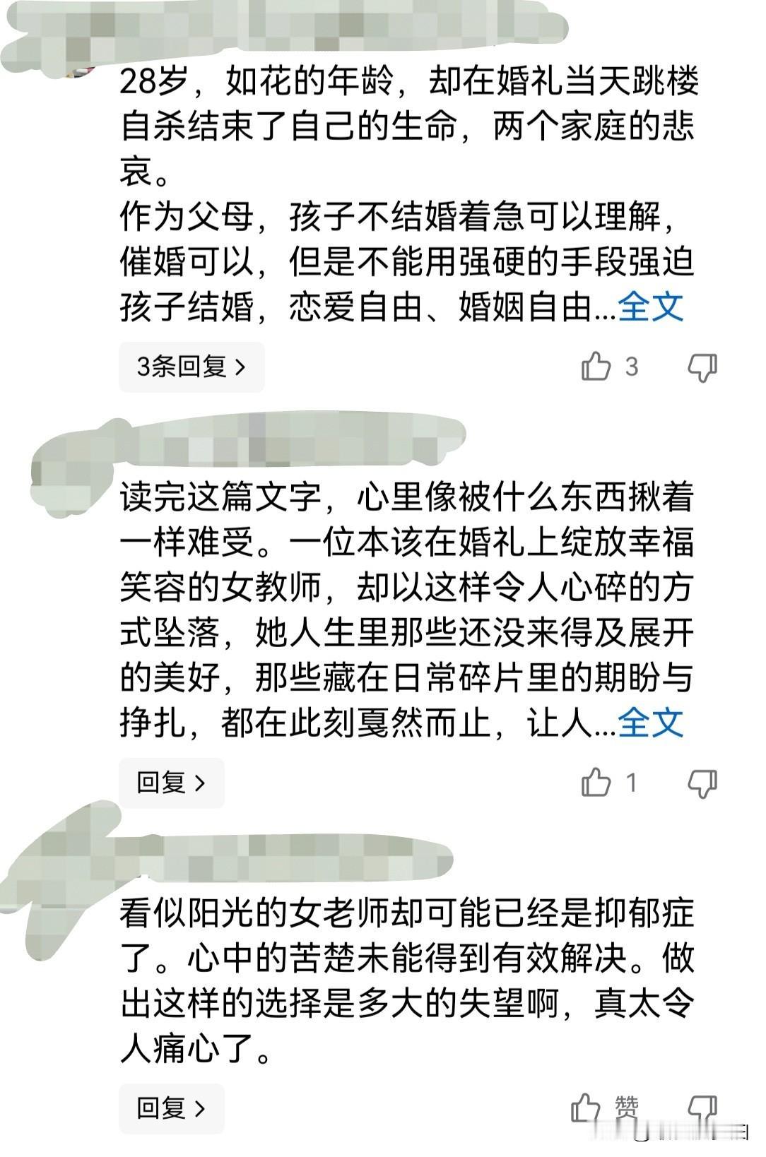 近期,一则关于“新婚当日28岁的河南女教师魏某坠楼”新闻报道在网上引发热议! 网友纷纷发出感叹,表示痛惜! 当我看到这则新闻时,心情也是极其复杂!从最初的震惊到惋惜,最后也只剩下一声叹息! 听闻消息时,最初是感到震惊!不禁感叹生命竟如此脆弱,一条鲜活的生命就此凋零! “年仅28岁”、“公立重点高中”、“历史老师”、“历史组总成绩第一名”…… 以上种种信息可以看到,河南女教师魏某是一名年轻有为的青年,可以说是相当优秀。 如此优秀的青年女教师竟然被逼婚走上了绝路,让人感到无比的惋惜! 在现实生活中,许多人都背负着压力砥砺前行着,谁也不知道压垮自己的最后一根稻草是什么? 类似于坠楼这样的事件,让人看完,也只剩下一声叹息了! 常言道:“人生不如意之事十之八九!”面对人生困境时,我们应该保持“风雪压我两三年,我笑风轻雪如棉”乐观的心态,积极去面对。 无论如何都应该要记住:“生命是最宝贵的财富,没有什么比活着更重要。无论遇到多大的困难,只要活着,就有希望。”