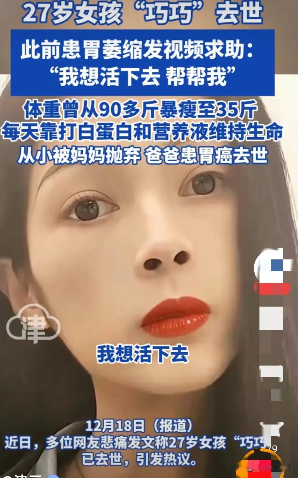 广东女孩巧巧走了,因为抑郁,因为胃萎缩,从90斤瘦到35斤,最后照片不忍直视。 不禁想到一句话:人生看似漫长,真正属于自己快乐的日子其实不多。 巧巧才27岁,原本是个特别漂亮的姑娘,却遭受一连串的打击,从小被妈妈抛弃,后来爸爸又因癌症去世,然后她抑郁成疾,连饭都吃不下,最后被胃萎缩拖垮了。 看到她瘦脱相的照片,还有最后她说:我想活下去,请帮帮我。 心里真的不是滋味。 人啊,这一辈子,真的,千万别太逼自己。 不需要山珍海味,粗茶淡饭,只要能吃得下,吃得香就是福气。也别总想着大富大贵,身上没病,心里没事,就是最大的财富。 巧巧的故事让人心疼,也更提醒我们,照顾好自己的身体和情绪,才是这辈子最要紧的事。[祈祷]