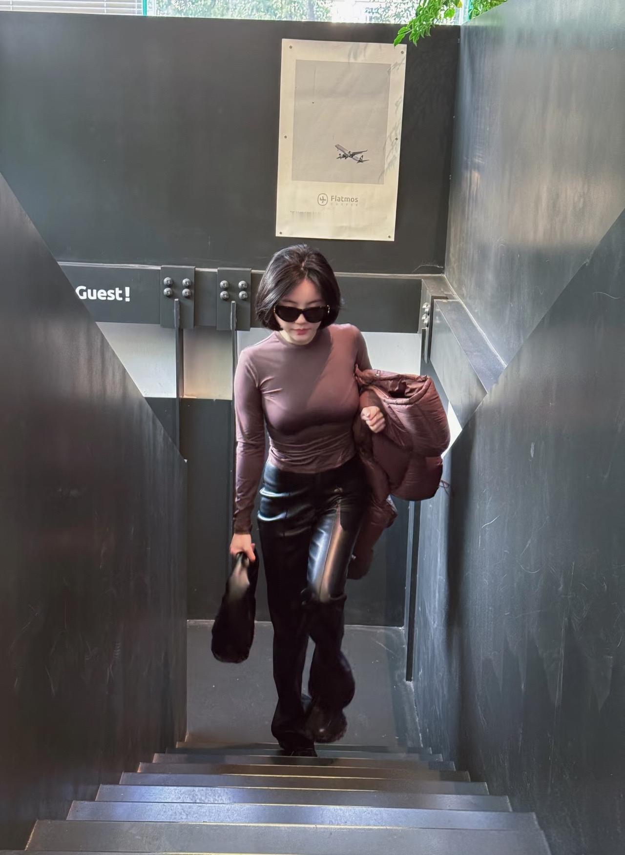 秀智身穿全黑Celine,出席韩国首尔Celine旗舰店活动。皮衣配搭铅笔