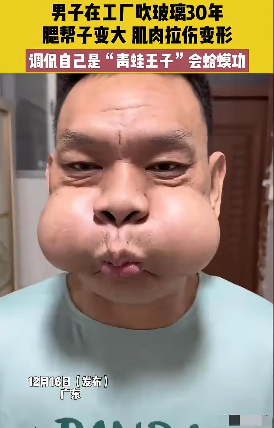 这个真笑不出来!广东一男子在工厂干活干了30年,因为常年都要吹玻璃,导致两个腮帮子变大,只要一吹气,两边就会鼓起来,连他自己都调侃是“青蛙王子”会蛤蟆功。网友:30年练就蛤蟆功,这才是真·工匠精神![月亮] 1300℃熔炉前,每天5000次鼓腮吹气,40℃高温车间里一站就是一整天,30年吹了4500万次才练就毫米级精度。机器替代不了的手感,是他手上的老茧和变形的腮帮换来的。 网友调侃的“青蛙脸”,哪里是什么玩笑,分明是劳动者的勋章。现在年轻人嫌苦不愿学,老手艺面临失传,可正是这些用身体践行热爱的匠人,才让手工制品有了温度。 工匠精神从不是口号,是把一件事做到极致的坚守。你还见过哪些藏在身体上的职业印记?评论区聊聊~