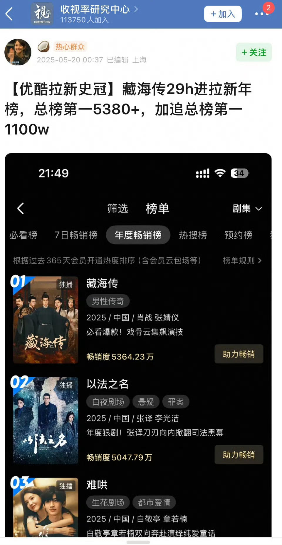 由于成毅粉丝造谣,剧粉又去考古了藏海传开播时的数据贴,结果发现,藏海传数据比之前宣传的还好:【藏海传开播28分钟周榜登顶,2个半小时进年榜33!29小时进入优酷年榜20!】为优酷进入年榜最快的剧!!藏海传是优酷年冠,也是史冠,是公认的大爆剧。 优酷给藏海传开了爆剧致谢专栏,“爆剧,因为有你”