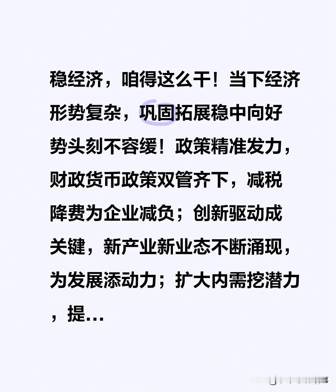 稳经济,该这么做! 当前经济形势复杂,巩固拓展稳中向好态势迫在眉睫。政策精准发力,财政与货币政策协同,减税降费减轻企业负担;创新驱动是关键,新产业新业态频现,增添发展动力;扩大内需挖掘潜力,提升消费投资,释放国内市场能量;优化环境激发活力,“放管服”改革深化,助企业安心发展。各方携手,稳中求进,中国经济巨轮定能在高质量航道破浪前行,驶向辉煌未来!