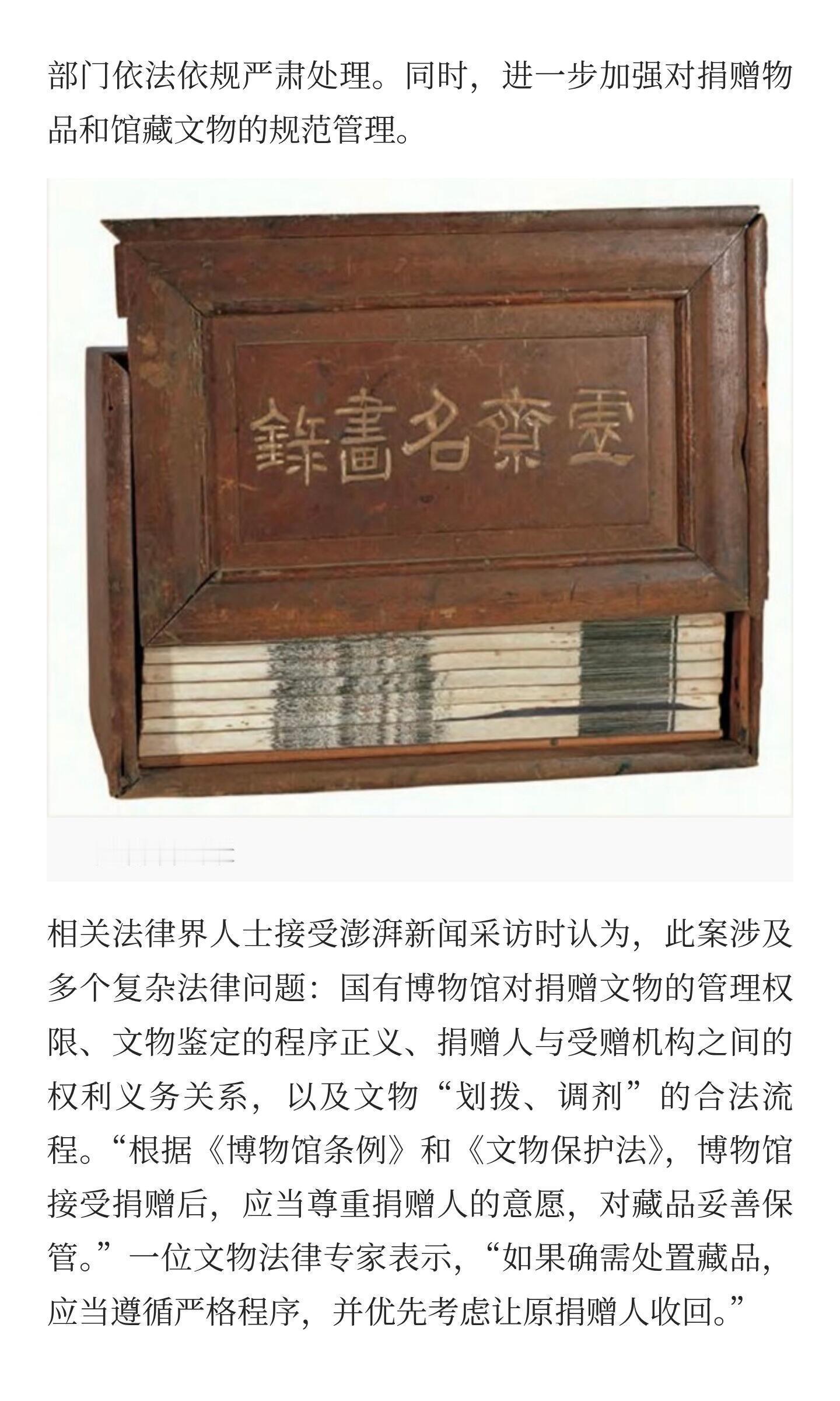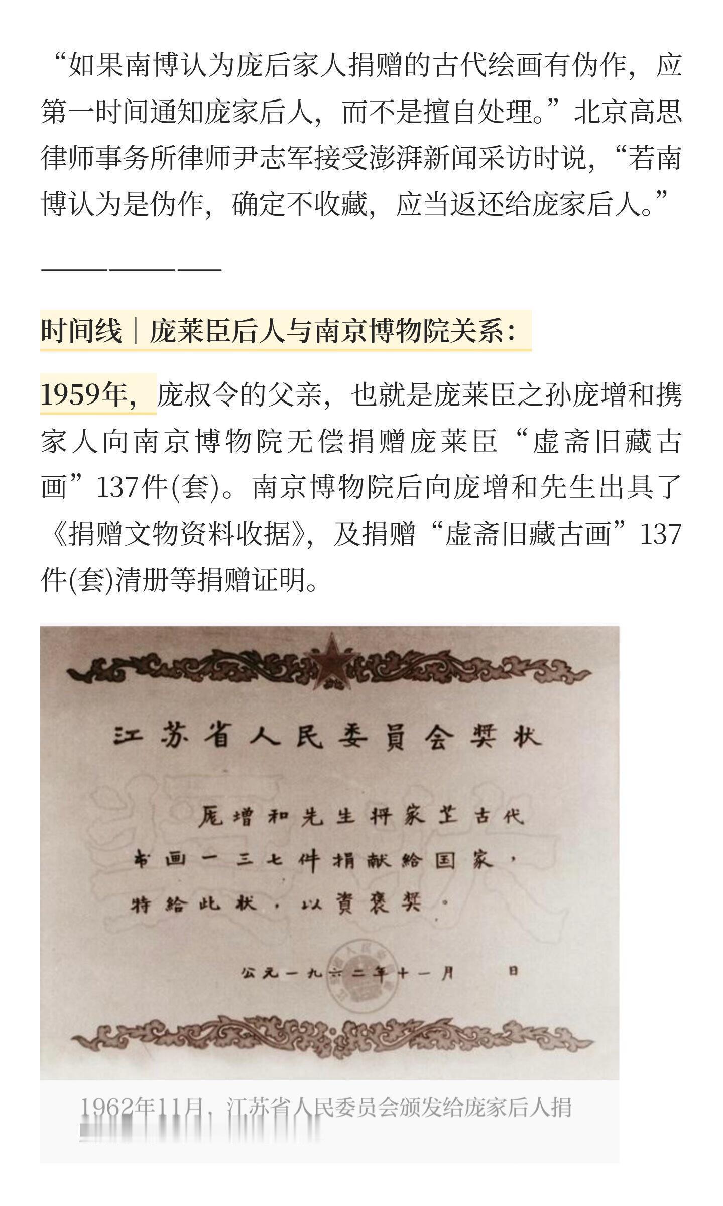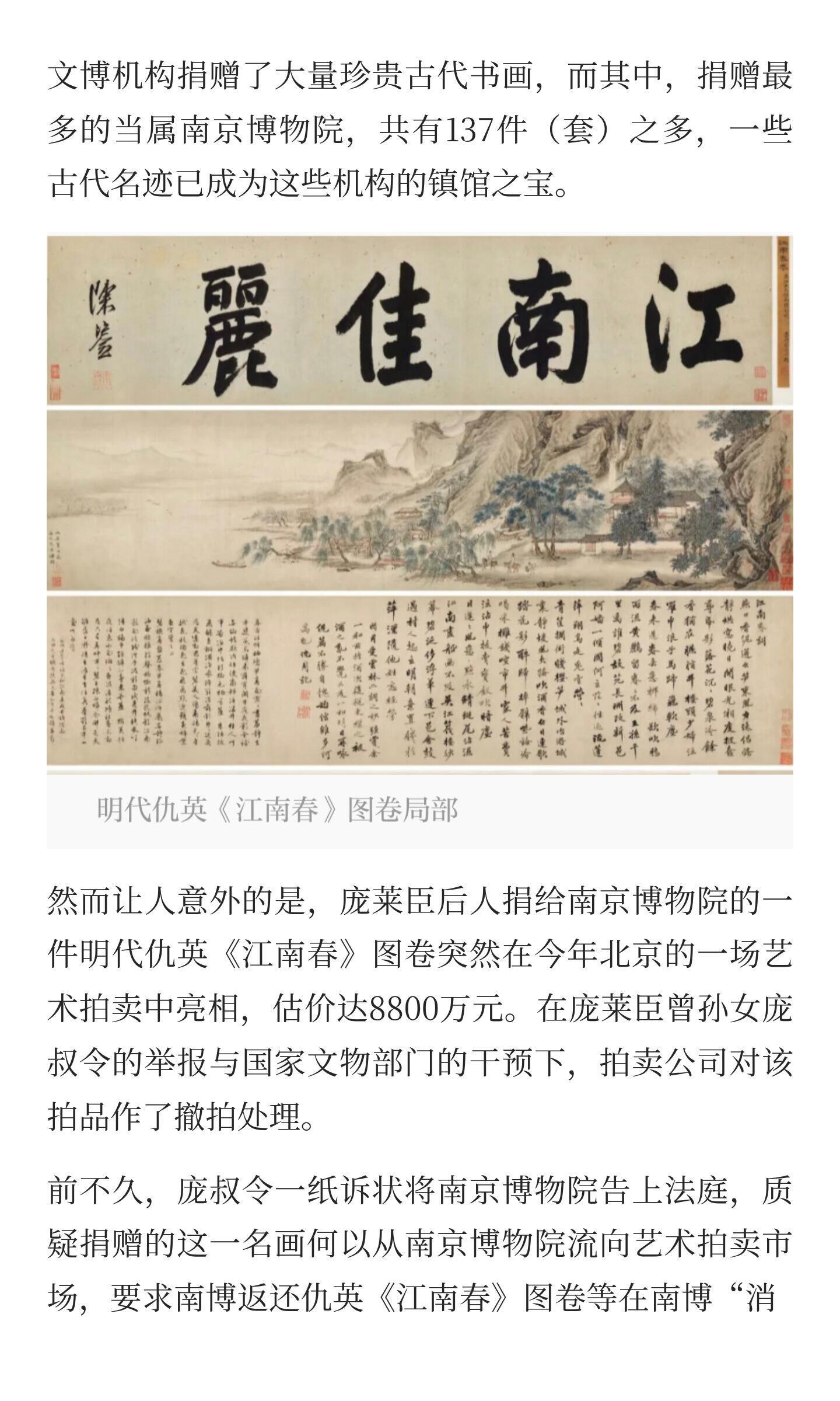 江苏成立专班后,庞家后人要求归还流失画作,澎湃新闻就这件事做了个梳理。南京博物院馆藏庞莱臣后人捐赠的名画现身拍卖市场,引发巨大反响。12月18日,江苏省文化和旅游厅表示,已经关注到此事,已由江苏省文旅厅牵头成立工作专班联合调查处理,"内部正在研究,会有正式对外的口径",最终调查结果将及时对外公布。庞莱臣曾孙女庞叔令表示,非常期待江苏省文旅厅成立工作专班的联合调查处理,相信通过调查处理,她父亲与她的捐赠古画何以流向拍卖市场这一事件最终一定会水落石出,"我要求追回5件消失的画作,归还给庞家,还有要求严查当时为什么会流向市场,将文博界的败类绳之以法,还文博界一个明朗的世界。国家文物局调查博物馆藏画拍卖事件热点观点 国家文物局调查博物馆藏画拍卖事件
