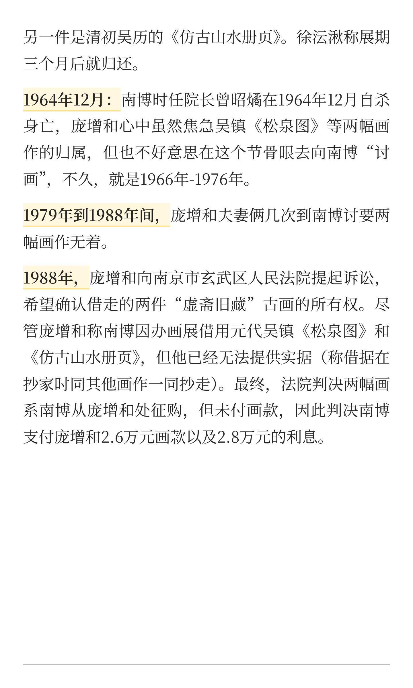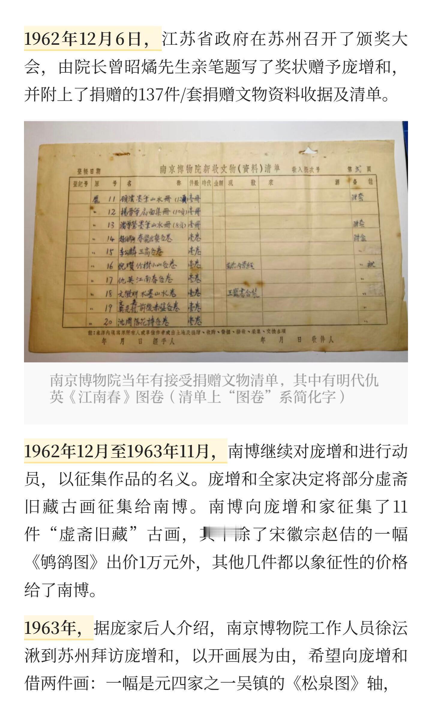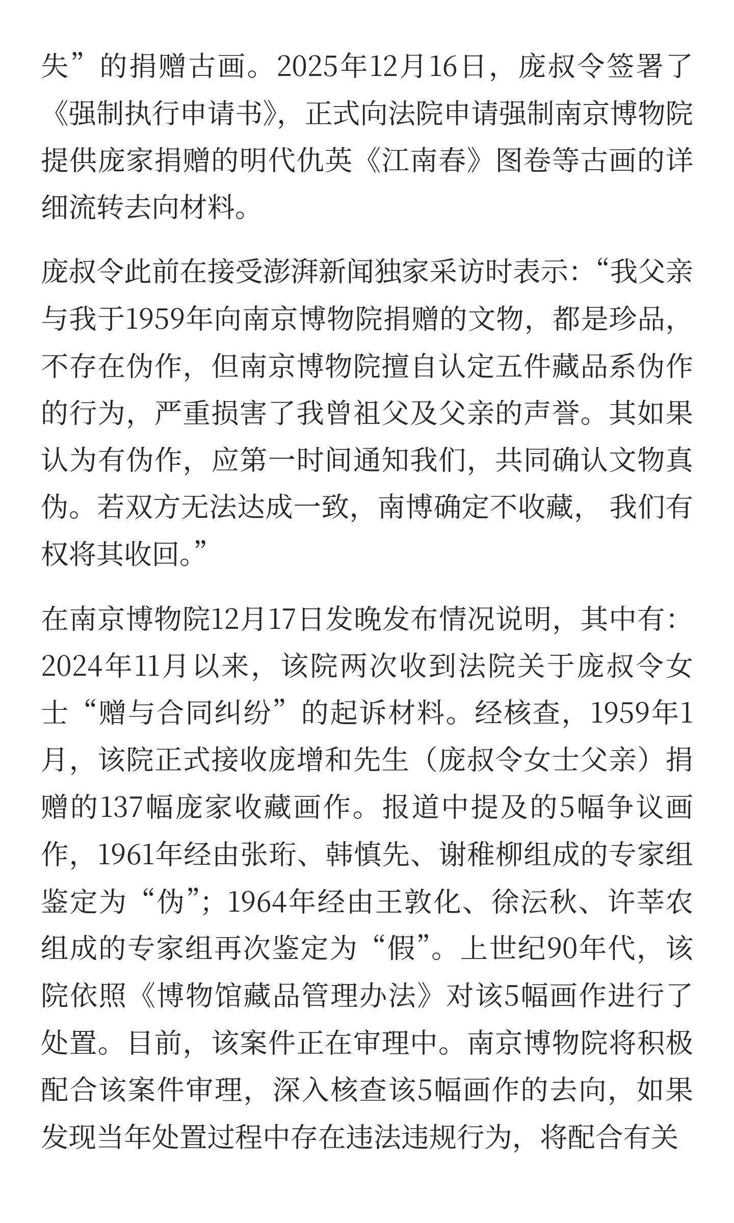 江苏成立专班后,庞家后人要求归还流失画作,澎湃新闻就这件事做了个梳理。南京博物院馆藏庞莱臣后人捐赠的名画现身拍卖市场,引发巨大反响。12月18日,江苏省文化和旅游厅表示,已经关注到此事,已由江苏省文旅厅牵头成立工作专班联合调查处理,"内部正在研究,会有正式对外的口径",最终调查结果将及时对外公布。庞莱臣曾孙女庞叔令表示,非常期待江苏省文旅厅成立工作专班的联合调查处理,相信通过调查处理,她父亲与她的捐赠古画何以流向拍卖市场这一事件最终一定会水落石出,"我要求追回5件消失的画作,归还给庞家,还有要求严查当时为什么会流向市场,将文博界的败类绳之以法,还文博界一个明朗的世界。国家文物局调查博物馆藏画拍卖事件热点观点 国家文物局调查博物馆藏画拍卖事件