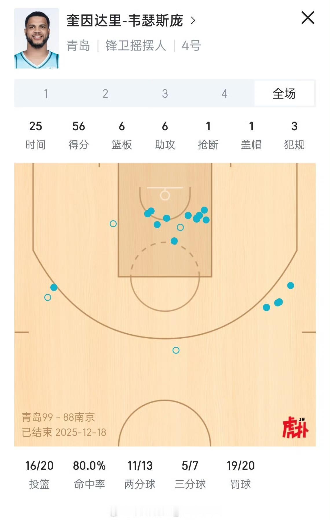 太恐怖了!青岛队外援威瑟斯庞半场只上场11分钟,却砍下了30分!投篮11中9三分球4中3效率极高,整场比赛砍下56分,已经达到了杀神的地步,把南京同曦的防线彻底打败。 强如郭昊文竟然被青岛防了六次失误得分困难,球迷感慨现在版本下的CBA就是外援的天下,就看哪天外援有如神助发挥出色。 本赛季的CBA没有绝对的强队与弱队了,谁赢都有可能,如果说哪个队有独一档的强点,那就是第四节的北京队,因为有赵睿陈盈俊周琦在对单外援的比赛来说占据很大优势。