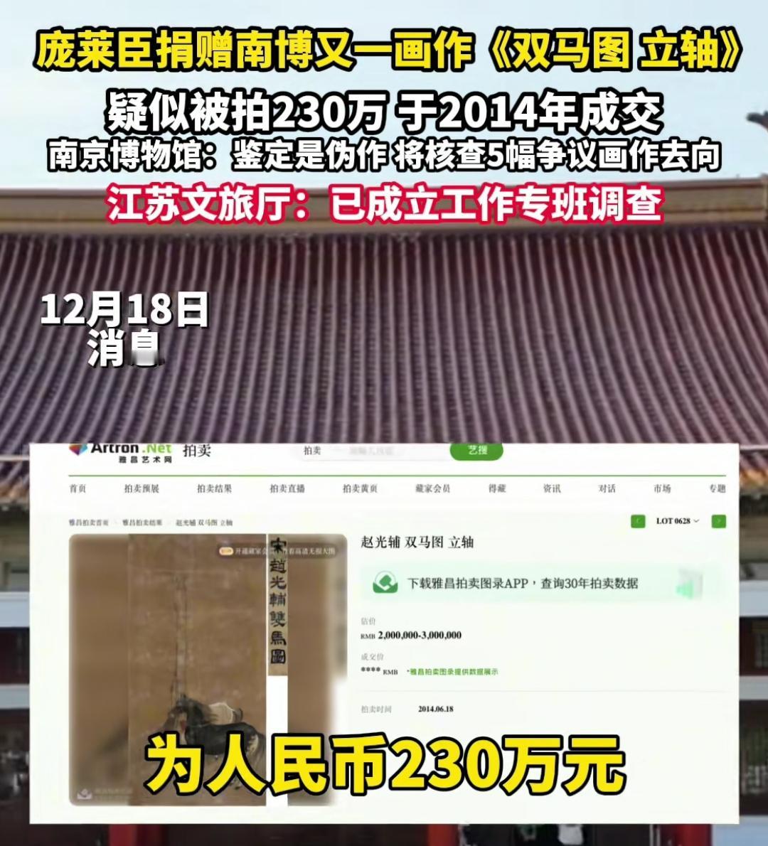 捐赠给南京博物院的又一画作被找到!曾经在2014年于上海拍卖!价格230万元! 根据今天媒体披露的名称以及作者,那么对应的画作就是2014年于上海拍卖的《双马图 立轴》,当时拍卖的成交价格为230万元。 截至目前,仍有三幅画作下落不明,南京博物院也不能给出这五幅画作的具体流向,究竟被谁卖出去了,又被谁给收藏了。 目前南京博物院仍然未公布当时这五部画的处理流程,同样的也没有得到省级以上文物部门的批准相关证明。