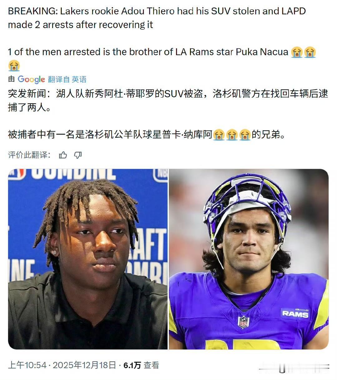 蒂耶罗的汽车被偷了!!!多亏了东契奇送的电动自行车,否则只能坐公交了! 根据洛杉矶警方了解的最新消息透露,湖人队的一年级新生蒂耶罗的SUV汽车被偷走了,目前警方已经根据获得的线索迅速展开调查,不出意外,他们快速的将嫌疑人定位到并逮捕了他们,经过审问发现,其中一人竟然是NFL球员纳库阿的弟弟。 这就有点滑稽了啊,怎么说纳库阿也是一名球星,不差钱吧,他的弟弟怎么会成为一名盗窃犯,不过这也不是稀奇的事情,鲍尔兄弟三个两个也都不差钱,二球不还是偷了东西,看来有个有钱的兄弟并不能解决实际问题。 这下纳库阿应该去湖人拜访一下了吧,同是洛杉矶的球队,只不过一个是篮球队,一个是橄榄球队,替自己的弟弟给这个新秀孩子道个歉,或者买辆新车也可以。 偷谁的不好,你说你还非得偷一个孩子的,多么可怜啊。 那就不能偷一下文森特和可乐杯的吗? 这要是没有东契奇送的电动自行车让人家怎么回家,坐公交车吗? 蒂耶罗 湖人