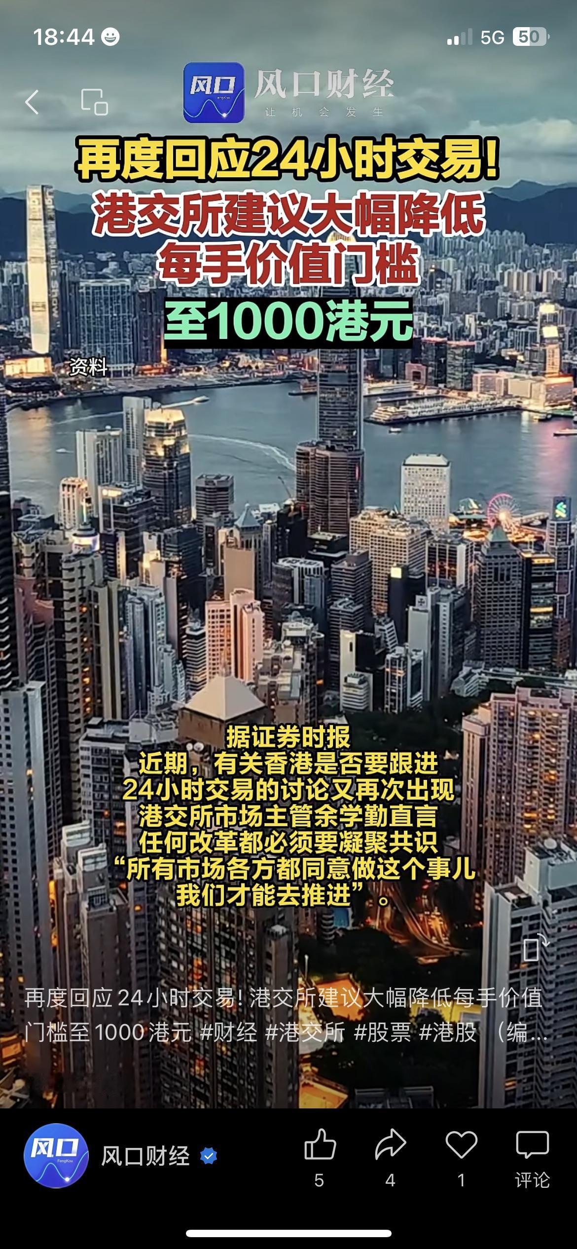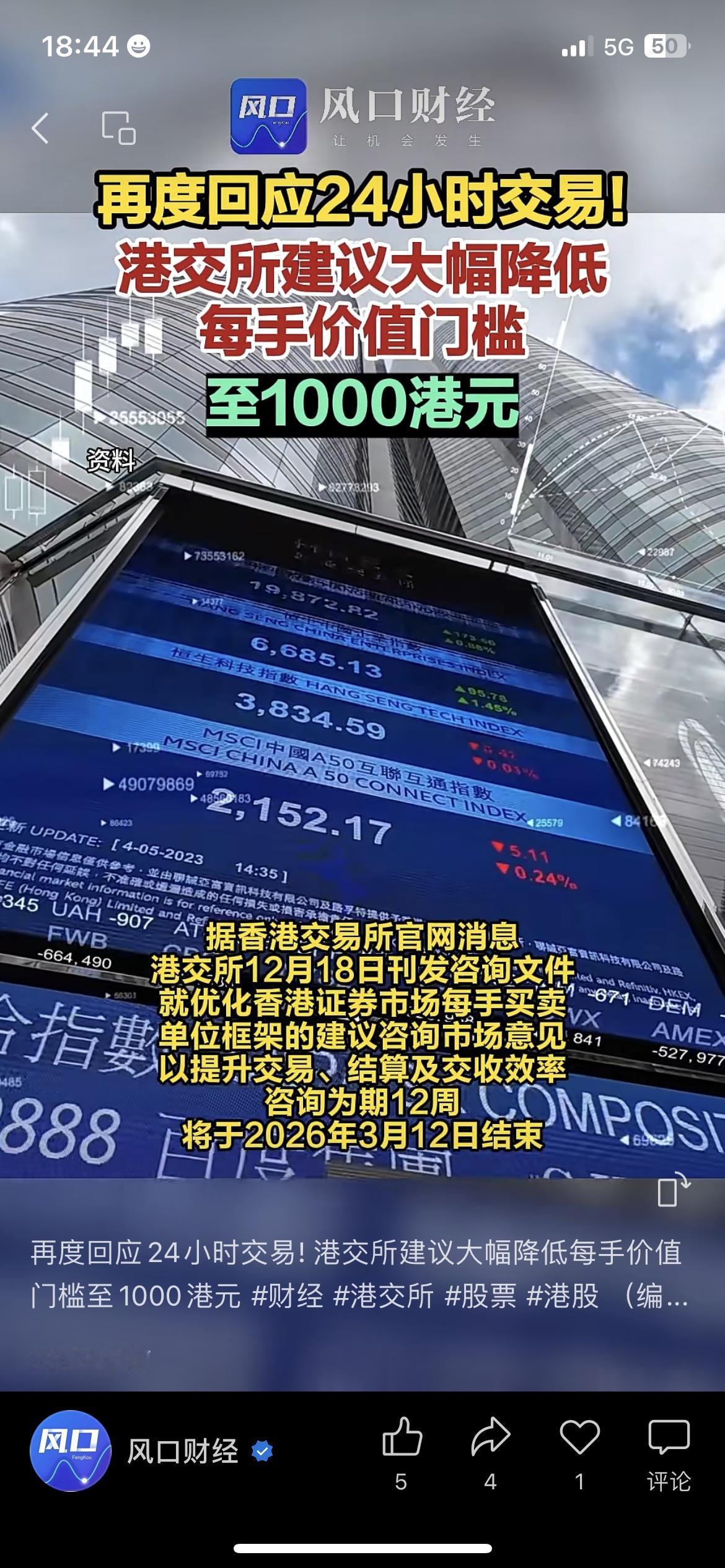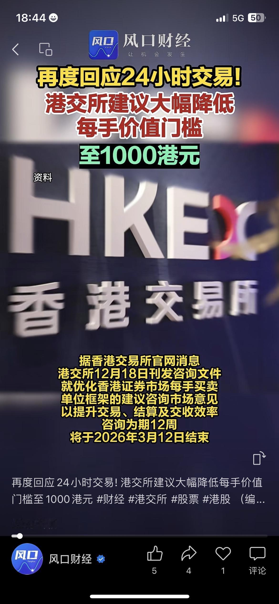 📈港交所放大招!每手门槛拟降至1000港元 股民笑了 港股投资者老陈看到公告,当场拍腿叫好:终于能小额买优质港股,不用再被高门槛拦住了。 港交所12月18日发布咨询文件,建议将每手价值门槛大幅降至1000港元,咨询期持续到2026年3月。 对于24小时交易的讨论,港交所明确改革需凝聚市场共识,不会盲目推进。 中小散户的入场成本大降,港股市场活力大概率会迎来一波新提升。 你觉得降低港股每手门槛会吸引更多散户入场吗?港交所新规