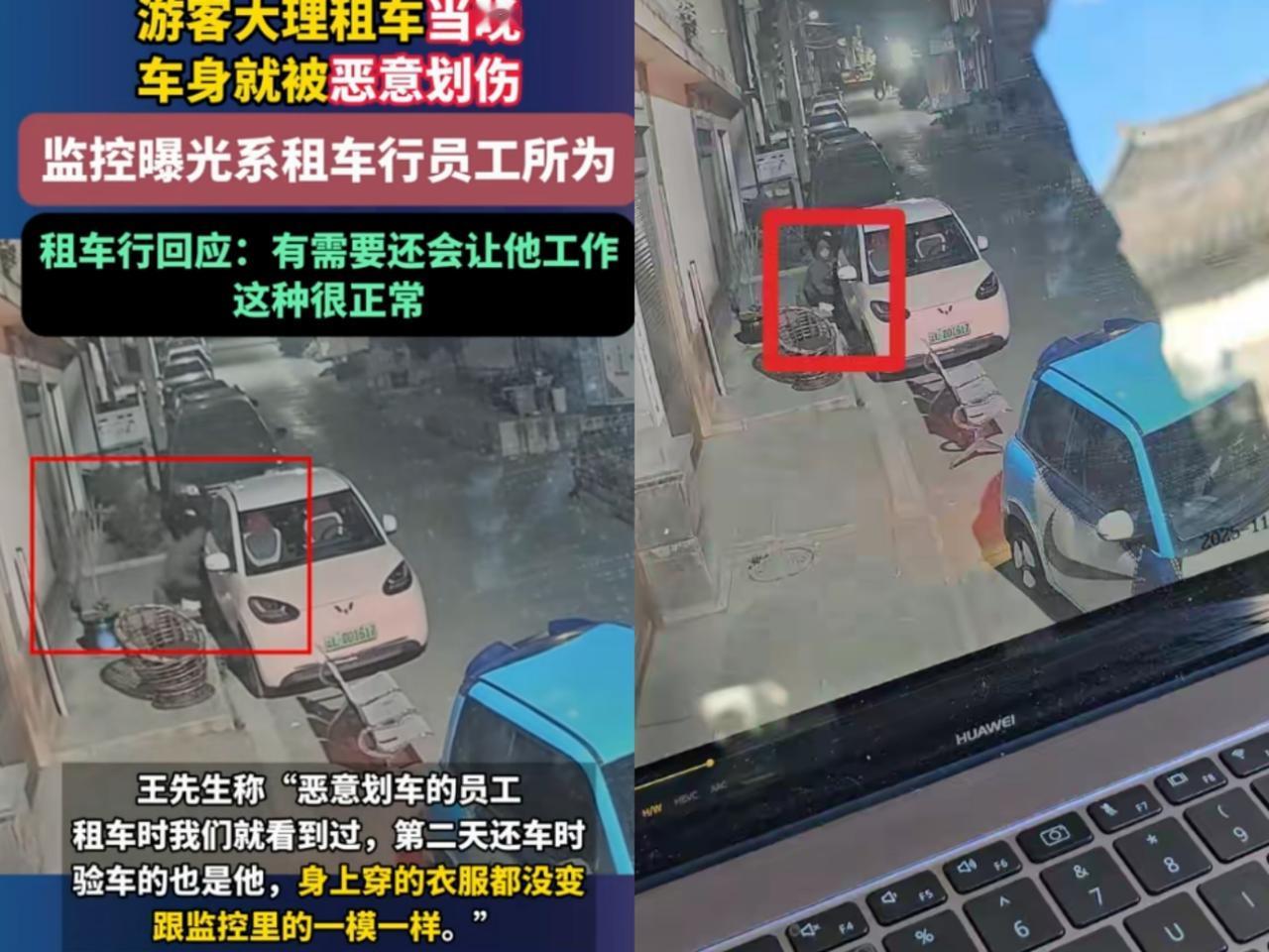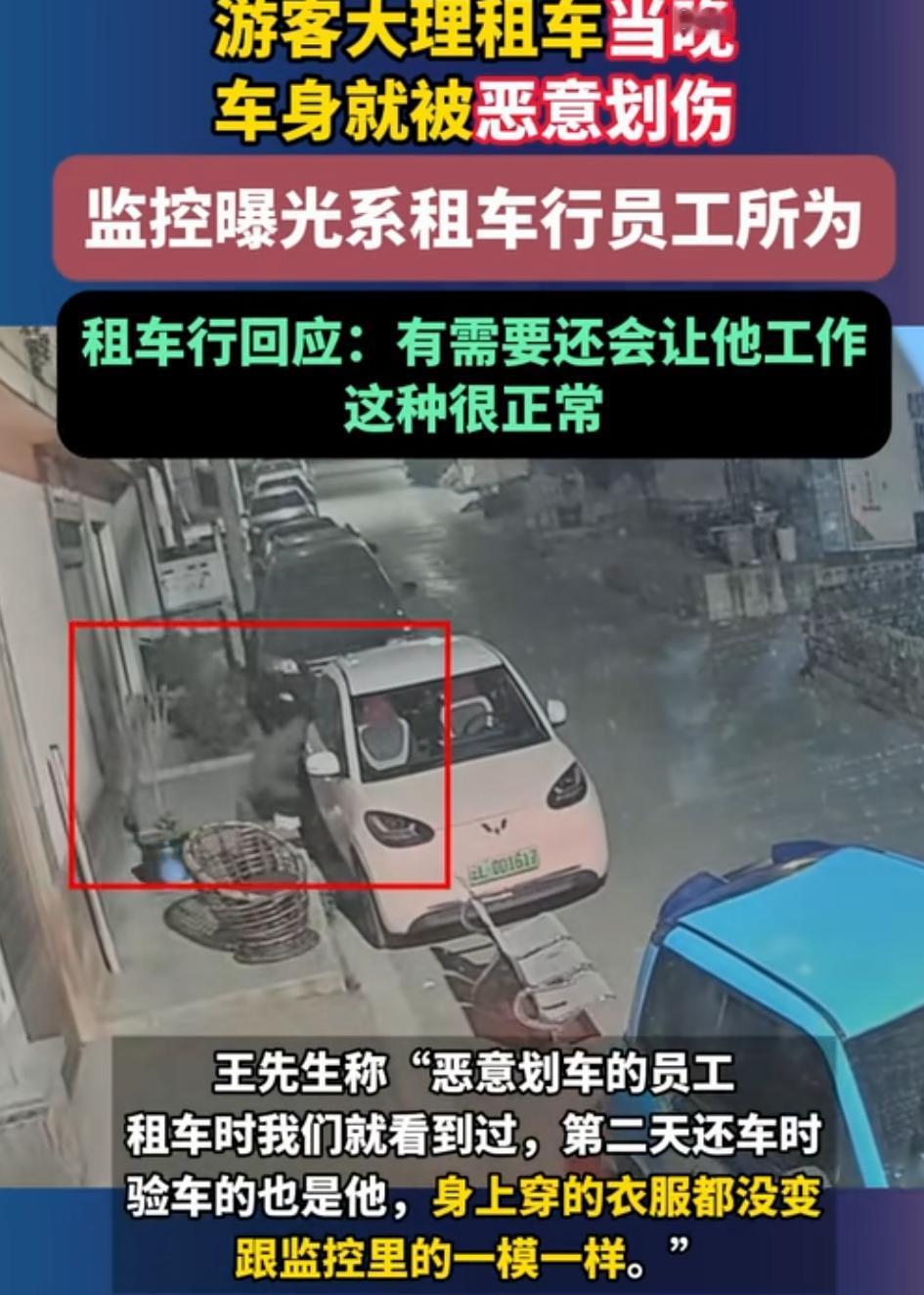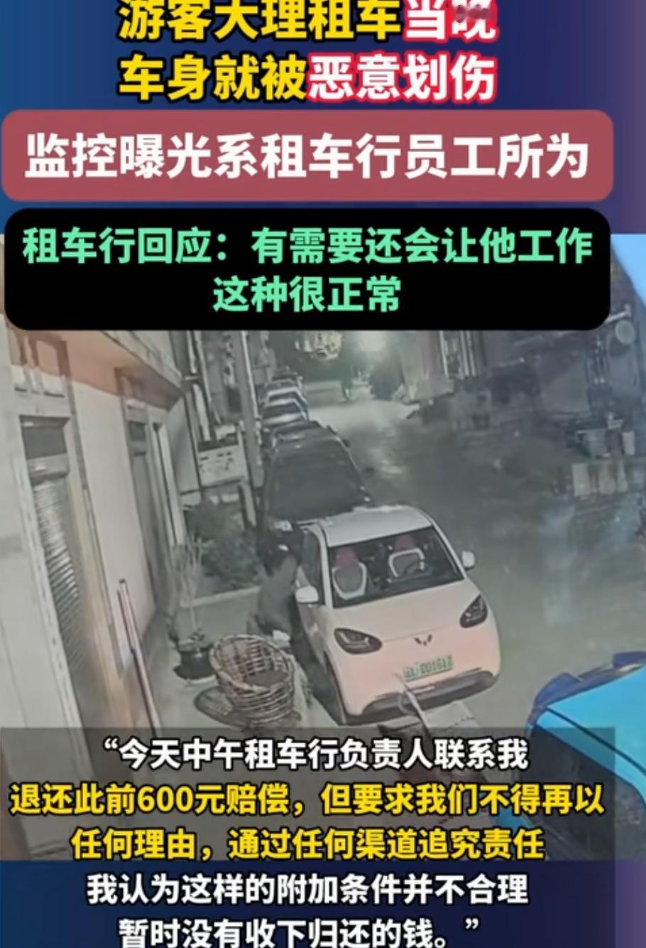 太坏了!奉劝大家停车一定要停在有监控的地方。 近日一网友曝料,其在大理某租车行租了一辆车,遇上了“仙人跳”,车就用了一天,还车时车行的人发现车尾处有划痕,索赔1008元,后砍价到600元。 该网友左想右想不对劲,找到当天停车不远处的一个监控,发现是有人刻意为之,监控中当晚一男子穿着卫衣戴着口罩,衣服帽子扣在头上,确认车牌后,溜到车尾把车划伤。 没看清人脸是怎么露馅的呢?原来该网友去还车时,验车男子就还穿着和监控里一模一样的衣服,一下就被认了出来,网友立马报了警。 于是该名男子被行政拘留,罚款800元,事后车行老板承认该男子确实是车行的一名代驾,同时把网友赔偿的600元钱原路返还了,但有个要求,让不要再追究代驾的责任。 不过该网友并未收。车行这行为太无聊了,为牟利竟自导划车剧情,以此敲诈顾客,不仅砸了自家招牌,更寒了消费者的心,处罚太轻了。 还有网友说,车行肯定不是第一次干这事,不能一拘了之,要深挖,尤其是车行老板,敲山震虎,看看是不是有组织有团伙的作案。 若要人不知,除非己莫为,这要是没有监控租车人只能吃哑巴亏,大家租车有没有遇到过类似的事情? 租车安全隐患 租车黑幕
