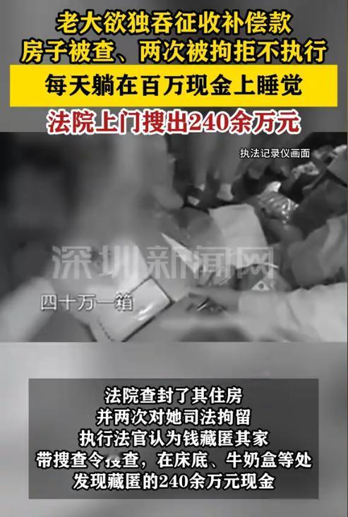“太贪心了!”上海,女子偷偷拿了父母的拆迁补偿款280万元,母亲知道后起诉女子还钱,但直到母亲去世,女子都没还钱。后女子的5个弟弟妹妹要求分割这笔拆迁款,但女子却找各种借口称钱花光了。执行法官见女子始终不履行义务,于是强行上门执行,这下女子慌了。(来源:深圳新闻网) 据悉,女子郑某家里共有6个兄弟姐妹,郑某是老大。2016年,郑某的父亲去世,而在父亲去世前,一直都是郑某在家照顾,所以她的户口落在了父母位于虹口区海宁路的老房子里。在父亲去世后,户口本上只有郑某和母亲的名字。 2019年6月份,这套老宅子被征收了,经过一番协商,补偿款共计280余万元还能分到福利房。 之后郑某选择了福利房。然而在领取补偿款时,郑某并未告知老母亲,偷偷把这280余万元全给转到了丈夫的银行账户内,然后再逐步换成现金藏了起来。 老母亲得知此事后,气不打一处来,她要求郑某把钱拿出来,因为还有5个弟弟妹妹要分,但郑某却不肯拿一分钱出来,称自己照顾父母这么多年,这是自己该得的。 见郑某不肯把钱拿出来,老母亲只得委托专业人士将郑某告上了法院。 法院经审理后认为,郑某的户口虽然在老宅子里,但这个补偿款并不是给郑某一人的,而且郑某已经取得了福利分房,所以这280万元应当归老母亲所有。 因此,法院判决郑某应当返还老母亲这280万元补偿款。 万万没想到,法院的判决结果出来有1年多了,郑某一直没有把钱拿出来,只要问了她,就是说把钱拿去理财亏完了,或者花光了。 2021年,老母亲直到去世,也没见到那280万元的补偿款。 郑某的5个弟弟妹妹早就知道了此事,但当时碍于老母亲在世,所以没和郑某闹僵,但现在老母亲去世了,他们便联合起来要求郑某把钱交出来。 之后,5个弟弟妹妹将郑某告上了法院,要求继承这280多万元遗产。 由于郑某的父母没有留下遗嘱,那么这笔遗产则需要按照法定继承来处理,而郑某等6个兄弟姐妹作为子女,自然可以继承这笔遗产。 法院最终判决郑某应当支付5个弟弟妹妹共计240万余元,可判决虽然生效了,但郑某还是拒绝支付。 无奈之下,5个弟弟妹妹只得申请强制执行。可郑某仍然没当回事,认为法院不会来强的,自己只要守口如瓶,法院就不能拿她怎么样。 即便法院两次对郑某实施了司法拘留措施,还查封了郑某的房子,郑某都没有交代钱的下落。 后执行法官持搜查令强行进入郑某家中搜查,这下郑某慌了。可还没等她有所行动,执行法官就从郑某的床底下,以及牛奶盒中找到了100多万元的现金。 但是总共执行的是240万元,还有140万的空缺。执行法官询问郑某其他钱藏哪了,郑某却还是不承认藏了钱,只说其他的都花完了。 不过,执行法官并未听信郑某的说辞,最终在其家里的各个角落找到了其余的现金,足足有240多万元。但即便如此,郑某还在说谎,称这些钱是自己一家人的积蓄。 其实面对郑某这种顽固分子,法院只是对其实施司法拘留已经是十分客气的了。 在5个弟弟妹妹起诉之前,老母亲就起诉过郑某还钱,而郑某在法院判决还钱后仍拒不还钱,这就已经违法了。 而且在法院因郑某拒不履行生效判决后,对其实施了两次司法拘留,且查封了房产,仍然不肯还钱,这就表明了一种态度,不想履行法院的判决,视法院判决如无物。 既然如此,对于郑某的这种行为就可以上升到刑事处罚了。 《刑法》第313条规定,对人民法院的判决、裁定有能力执行而拒不执行,情节严重的,处3年以下有期徒刑、拘役或者罚金;情节特别严重的,处3~7年有期徒刑,并处罚金。 这里的情节严重的情形,一般是指具有拒绝报告或者虚假报告财产情况、违反人民法院限制高消费及有关消费令等拒不执行行为,经采取罚款或者拘留等强制措施后仍拒不执行的。 其实正是因为有郑某这种人,所以才会出现执行难、执行复杂的问题。 后在执行法官的强制手段下,郑某只得眼睁睁看着执行法官把这240万元现金都拿走了。不过,郑某还是提出希望看在她照顾父母多年的份上,减免一些本金和利息。 最终,5个弟弟妹妹同意了郑某的请求,只需要郑某返还230万余元即可。 最后,郑某作为家里的老大,做事情应该有个好的表率,可她却把贪得无厌展现得如此淋漓尽致。就算郑某照顾了父母多年,那她可以申请多分遗产,而不是侵吞全部遗产。 对此,您怎么看?欢迎留言交流。