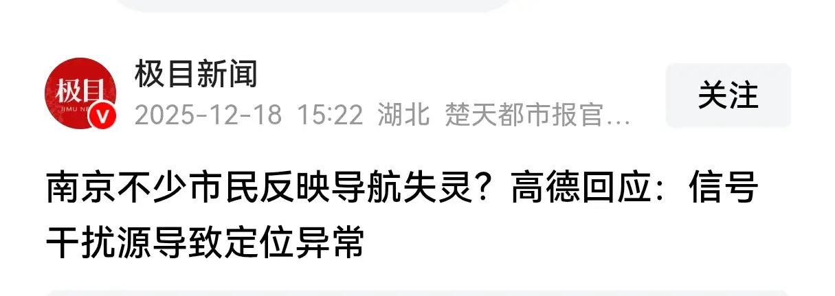 南京导航集体失灵,这绝不是小事! 17号傍晚,高德回应信号干扰源导致定位异常 民用导航系统是咱们日常出行、城市运转的基础保障,这次南京集体失灵直接给物流快递按下暂停键,也让网约车司机和乘客陷入手足无措的困境。 事件发生之前没有任何预警,没有任何部门提前发布提示或者做好应急预案,老百姓只能被动承受导航失灵带来的麻烦,应急管理部门表示当天没有相关活动会干扰信号,电信公司也查不到信号异常的源头,这就说明干扰来源大概率是有特殊的原因。 这件事绝不是偶然的小插曲,而是给我们敲响了一记警钟,提醒我们必须重视导航系统的抗干扰能力建设,不能等到出大事了才追悔莫及。
