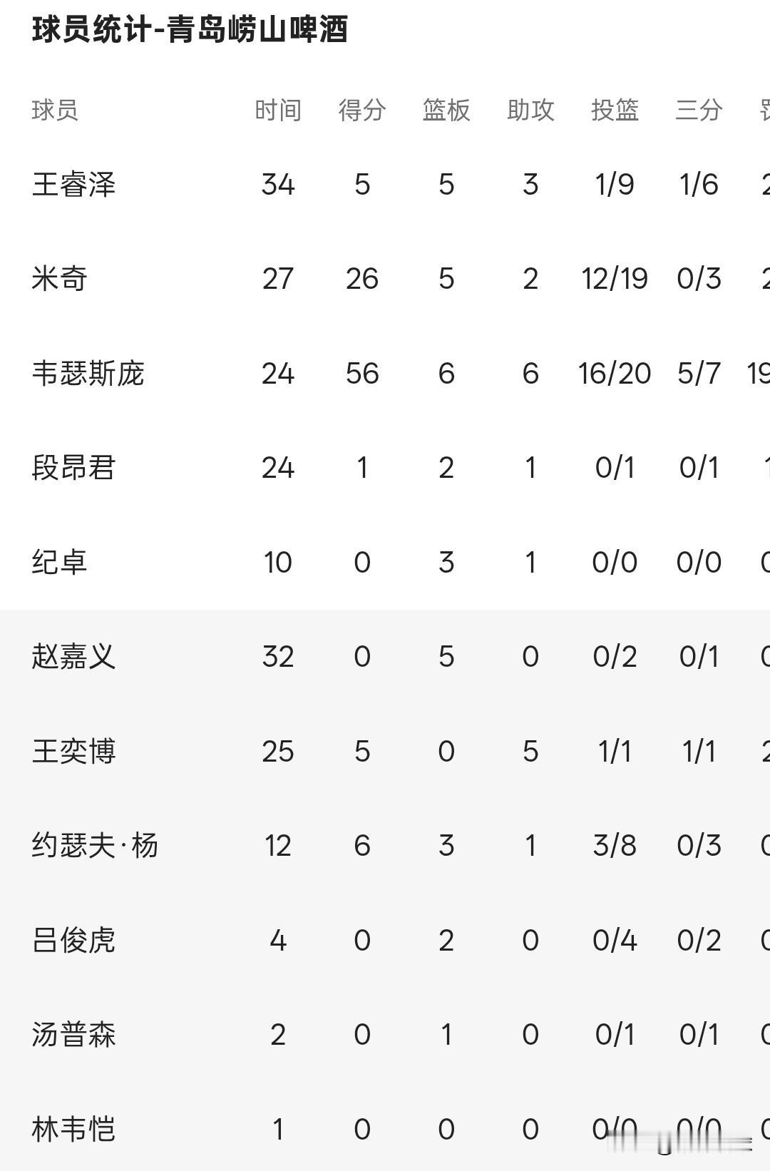 青岛队本土球员只得11分,青岛队拿到一波三连胜,青岛队是真靠外援在打,人家这外援也确实好用,威瑟斯庞20投16中砍下55分6板6助,要是让这哥们打满全场,有机会打破cba得分记录。