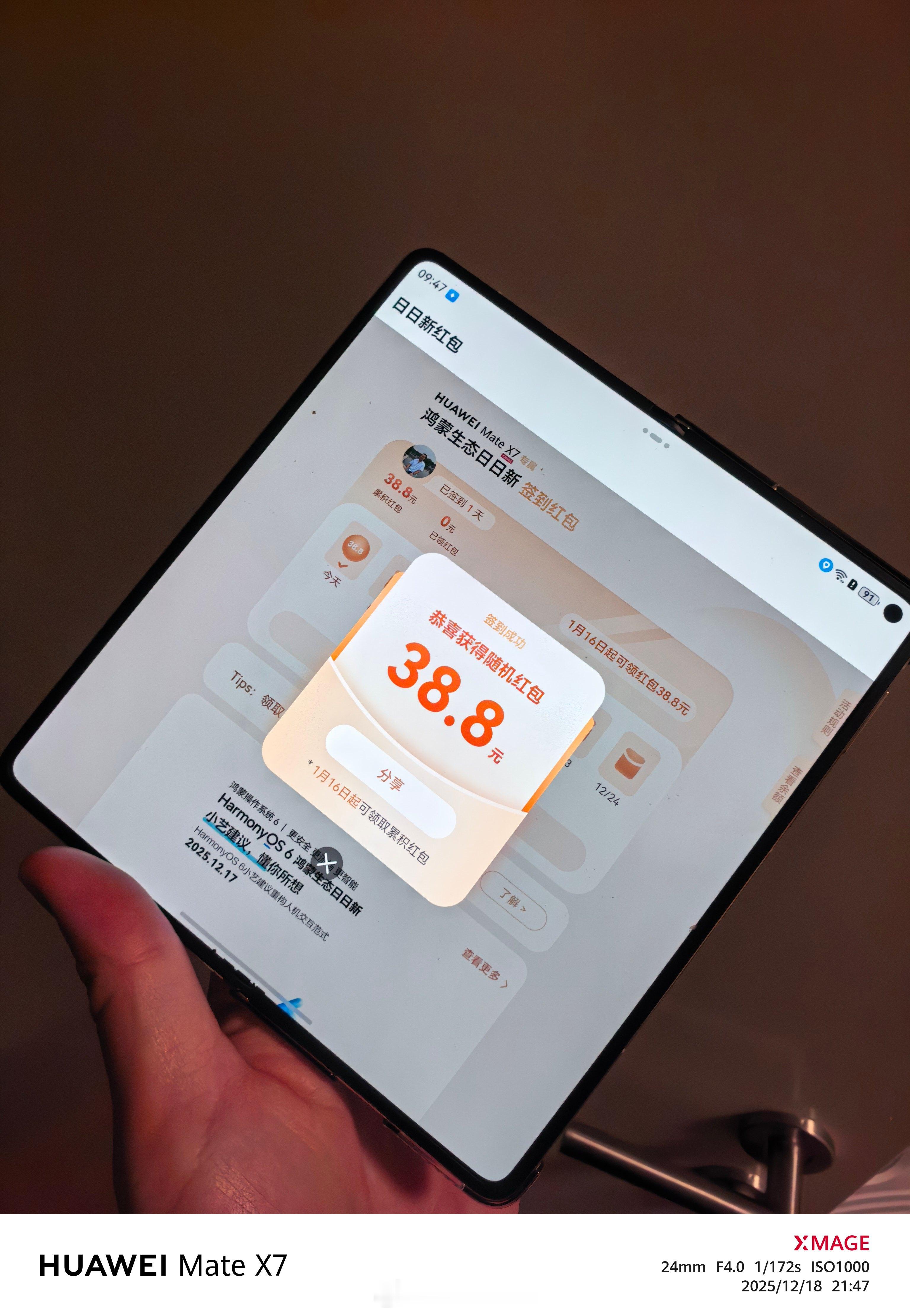 用了几天Mate X7,确实好用,折叠屏字大,对眼睛也好。 就给我爸又买了一个,作为新年礼物,他收到之后可开心了。教他领了红包,红包已经从88元退坡到了38.8元了,不过还是比的18.8元多一些 华为MateX7