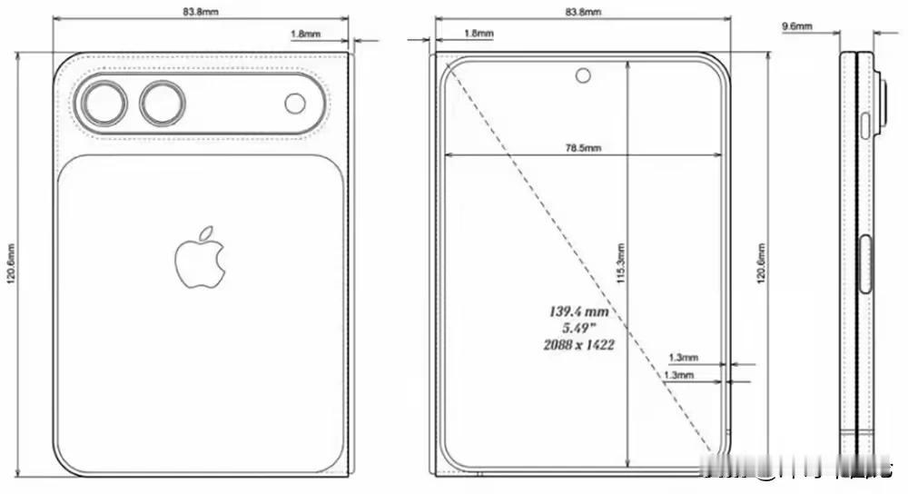 苹果首款折叠 iPhone 渲染图再曝:外 5.49 / 内 7.76 英寸屏幕,厚 4.8mm/9.6mm。 屏幕的比例类似于3比2 你们期待吗?