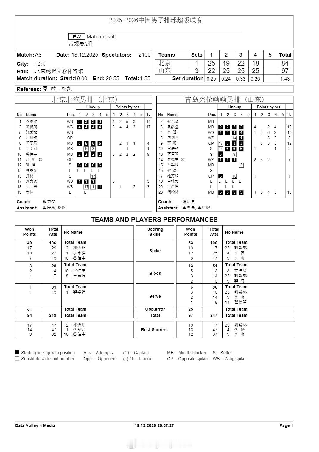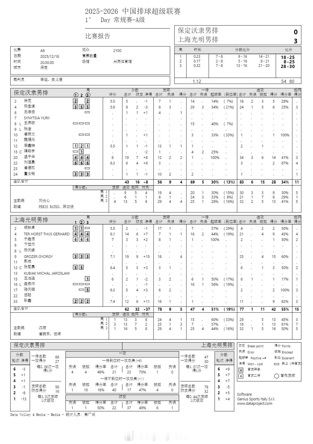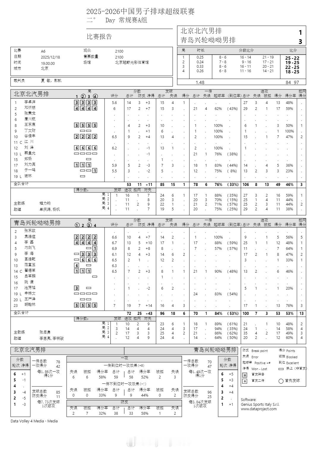 排超联赛12月18日,男排联赛第二轮七场比赛技术统计。