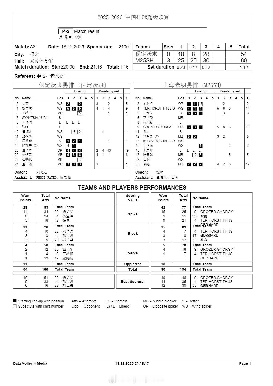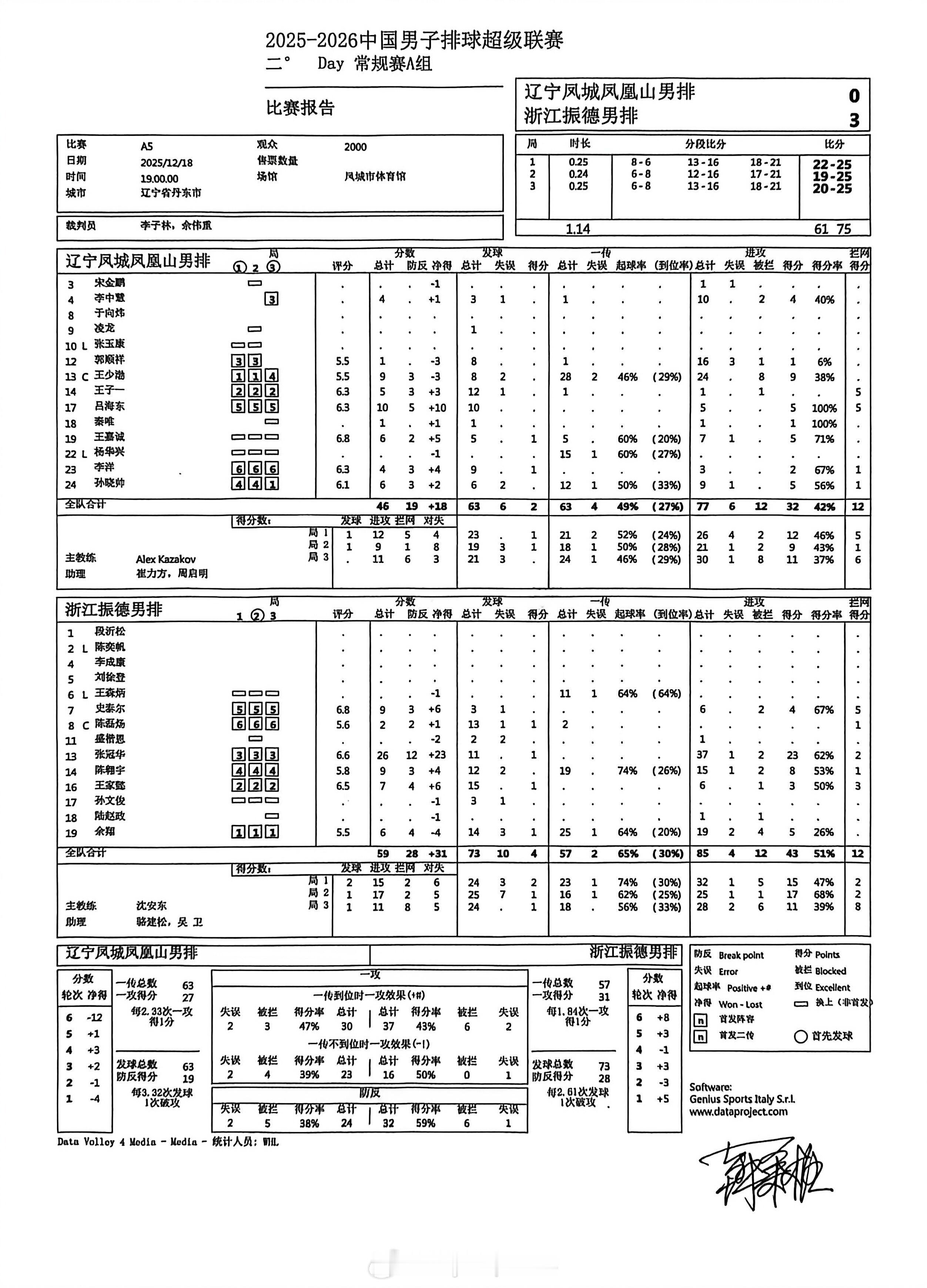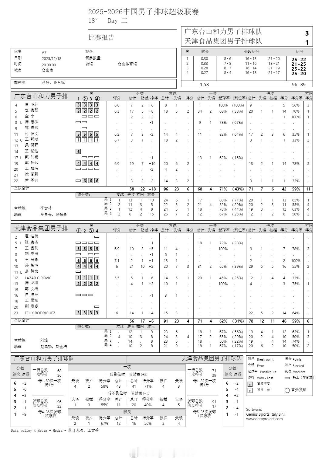 排超联赛12月18日,男排联赛第二轮七场比赛技术统计。