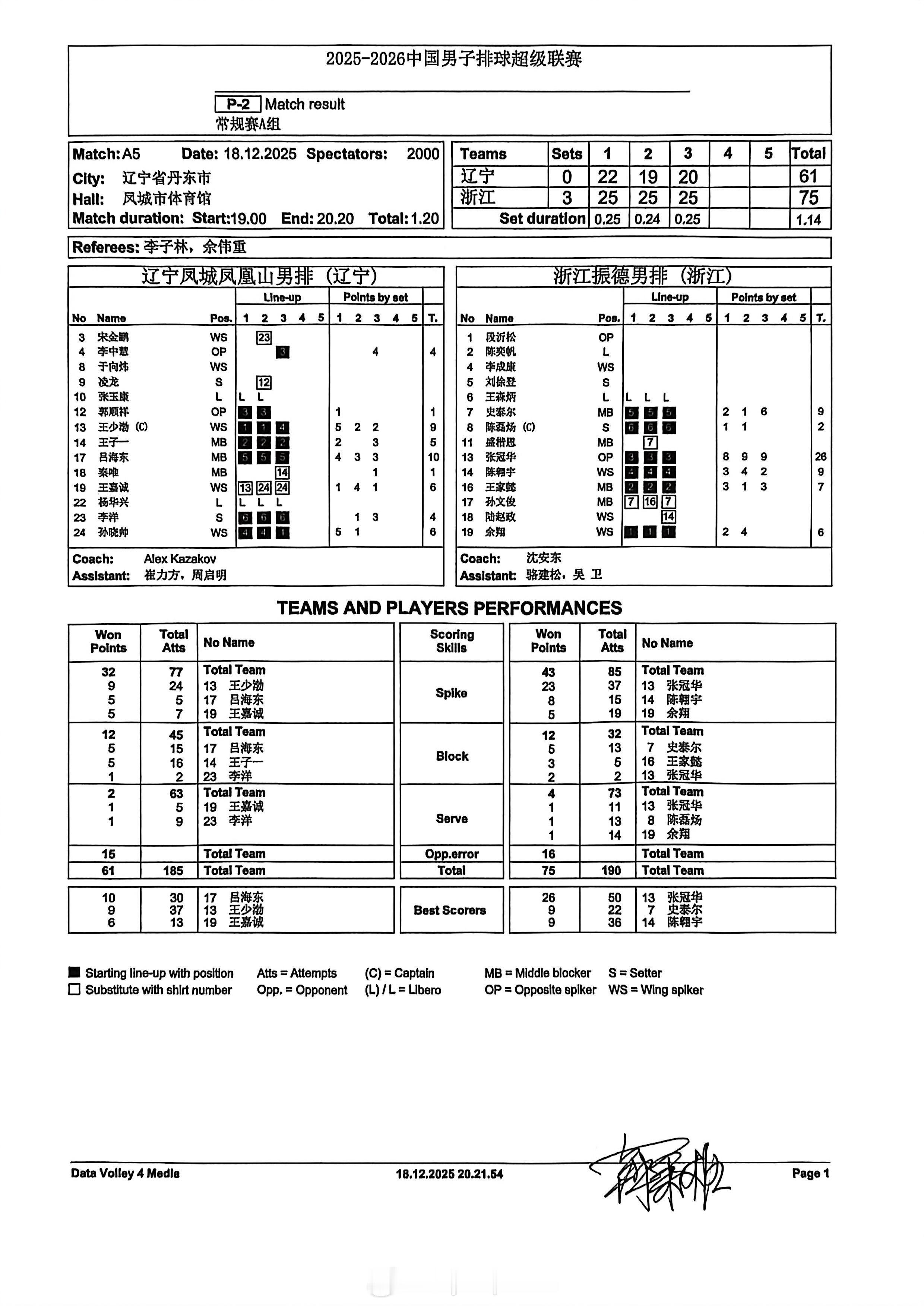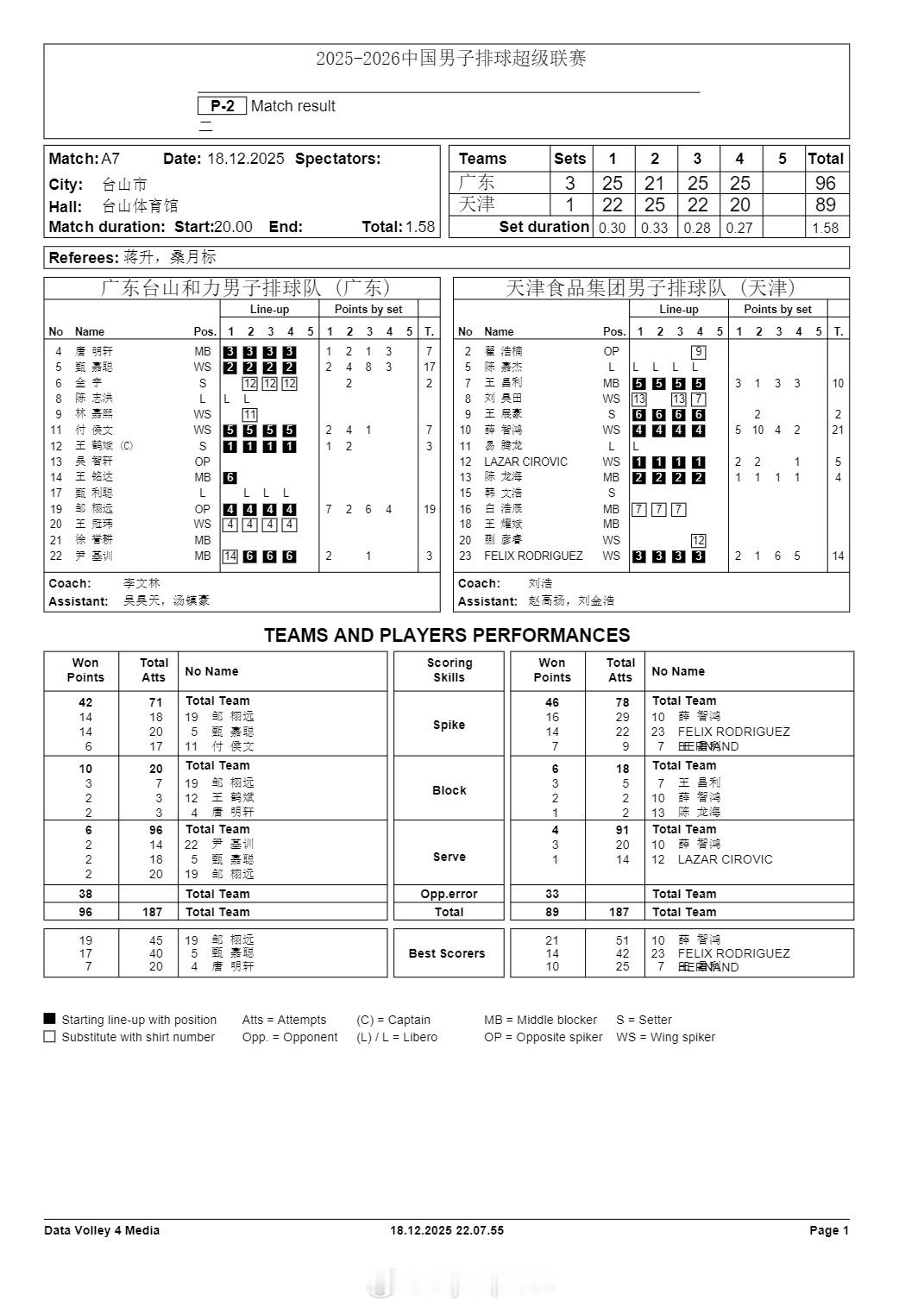 排超联赛 12月18日,男排联赛第二轮七场比赛技术统计。