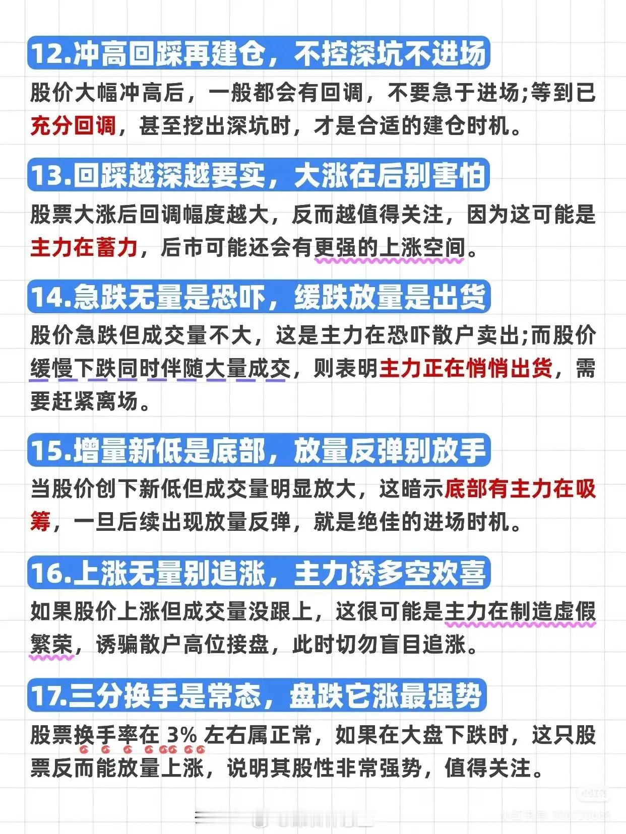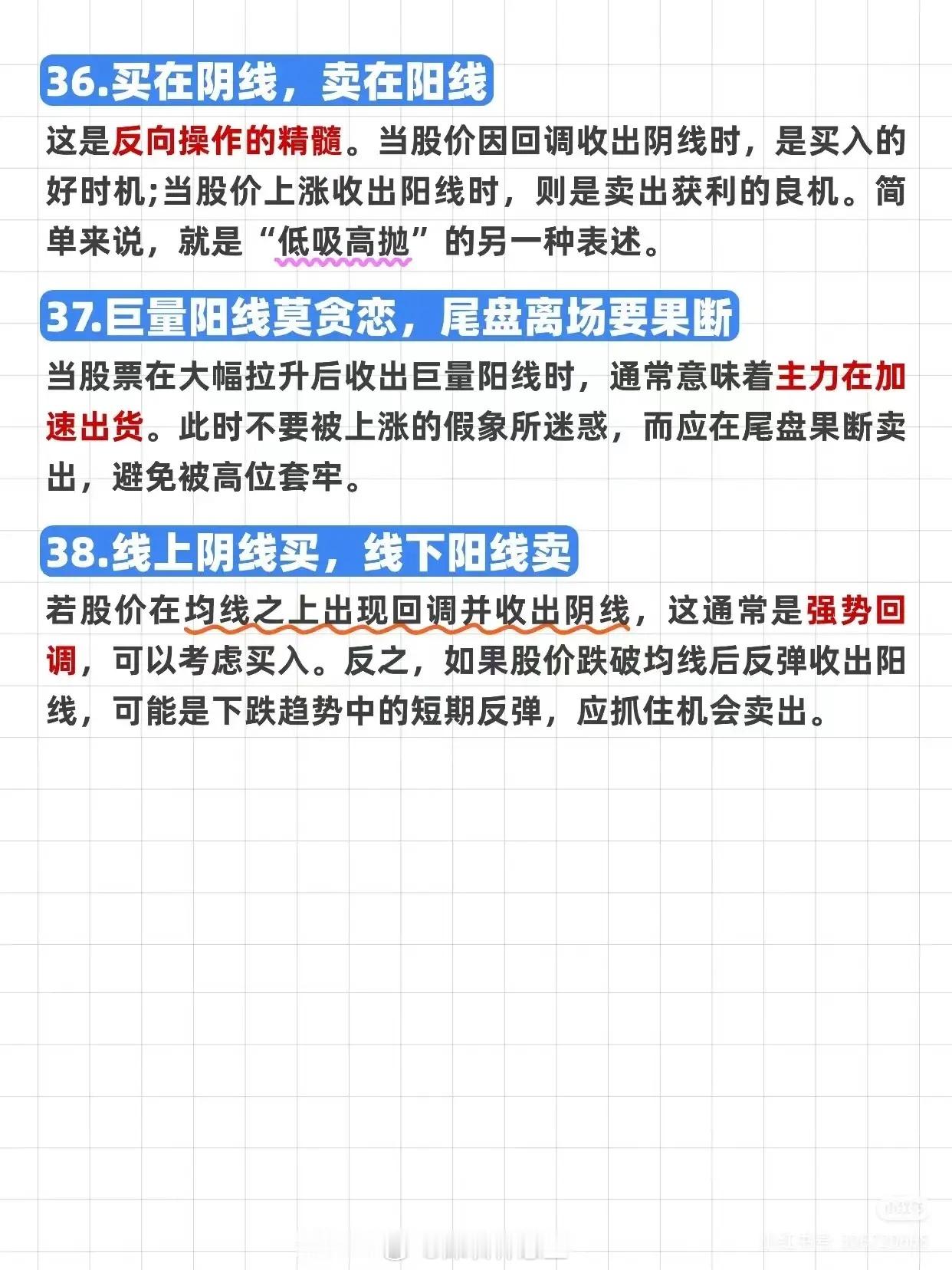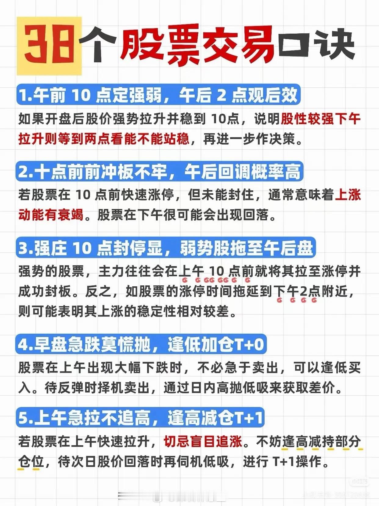 总结了38条股票交易口诀,涵盖短线、中线操作及买卖时机判断,核心围绕股价走势、成交量、主力行为与移动平均线的应用,具体如下:一、时段与股价强弱判断(1-5条)聚焦早盘、午前、午后及尾盘的关键时间点:午前10点是判断股价强弱的重要节点,强势股10点前能封停,弱势股涨停常拖延至午后;早盘急跌可逢低加仓做T+0,上午急拉切忌追高,适合逢高减仓做T+1;10点前冲板不牢的个股,午后回调概率高。二、午后、尾盘与主力行为(6-11条)午后股价飙升宜减仓锁定利润,骤跌则待次日找反弹机会;临近收盘十连板,次日低开可能性大;尾盘五分钟急杀跌多为洗盘,次日高开概率高。此外,急跌缓涨是洗盘信号,急涨缓跌是出货信号;买点选横盘筑底或低位探坑时,卖点在市场情绪鼎沸处;急跌无量是洗盘,缓跌放量需果断离场。三、回调与建仓时机(12-17条)冲高后需等充分回调甚至挖深坑再建仓;大涨后回调越深越可能是主力蓄力,后市或更强。急跌无量是主力恐吓散户,缓跌放量是出货信号;增量新低(新低且放量)暗示底部吸筹,放量反弹是进场时机;上涨无量多为诱多,勿追涨;大盘下跌时个股放量上涨(三分换手常态)显强势。四、换手率与量价关系(18-23条)换手率超5%时交易活跃但追高风险大,建议等回踩买入;换手率超30%的个股风险极高,非妖即坑需谨慎。放量不涨是顶部信号,缩量不跌是底部信号;缩量筑底成功后,放量上涨可进场;顶部放量下跌或开启漫长跌势,缩量下跌可能是洗盘,后市或反弹。五、横盘位置与趋势线应用(24-29条)高位横盘再冲高多为最后拉高出货,需及时抛售;低位横盘再新低可能是主力制造恐慌吸筹,可加仓;低位盘整藏杀机,警惕突然放量下跌。年线(MA250)抬头向上时,回踩年线是低吸机会;年线向下则处于长期下跌趋势,勿轻易接刀。六、移动平均线(MA)操作(30-35条)股价踩季线(MA60)是支撑点,可做波段;跌破季线预示中期转弱需警惕。月线(MA20)金叉季线是中期转强信号,可买入持有;股价跌至月线且月线走平,底部或已探明。短线强弱看五日线(MA5),回调不破可尝试买入。核心策略“不冲高不出,不跳水不进,横盘不动等信号”,即冲高卖、跳水买,横盘观望。七、阴阳线与均线买卖(36-38条)反向操作精髓:买在阴线(回调时),卖在阳线(上涨时)。巨量阳线多为加速出货,尾盘需果断离场;线上(均线之上)阴线是强势回调可买入,线下(均线之下)阳线是下跌反弹应卖出。