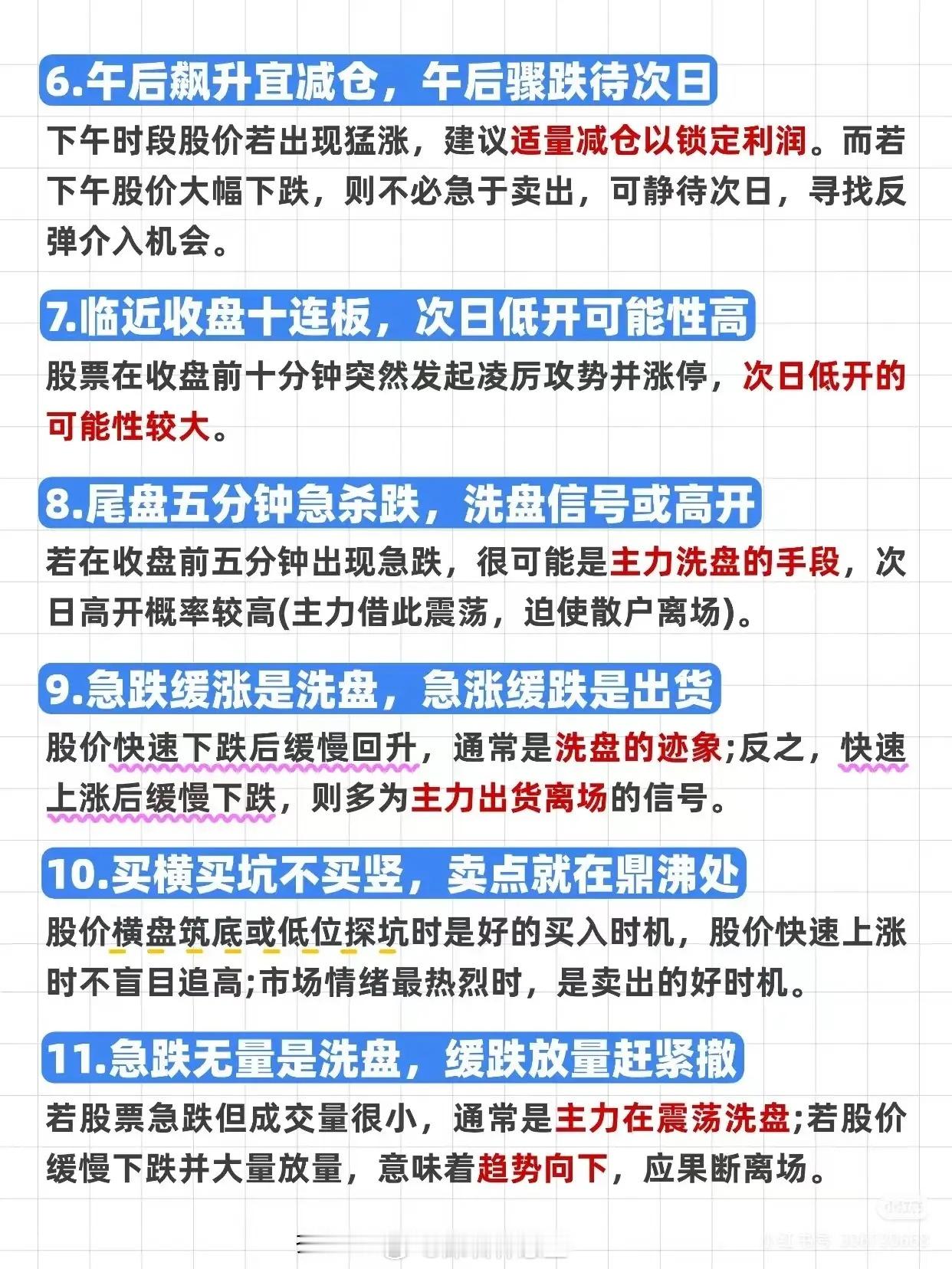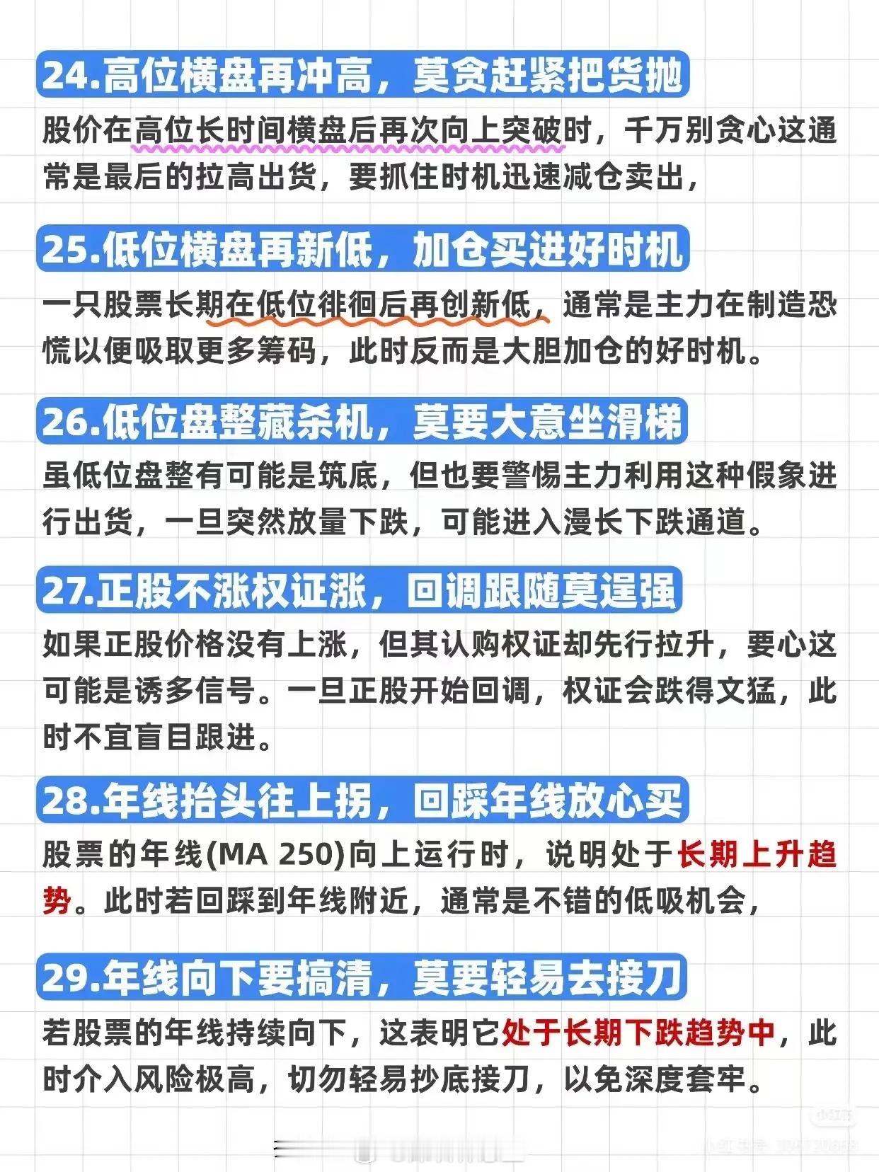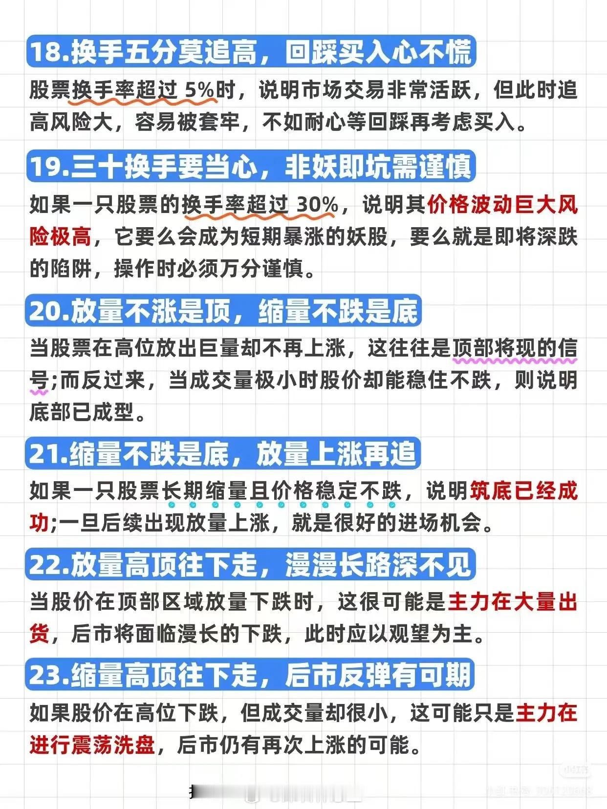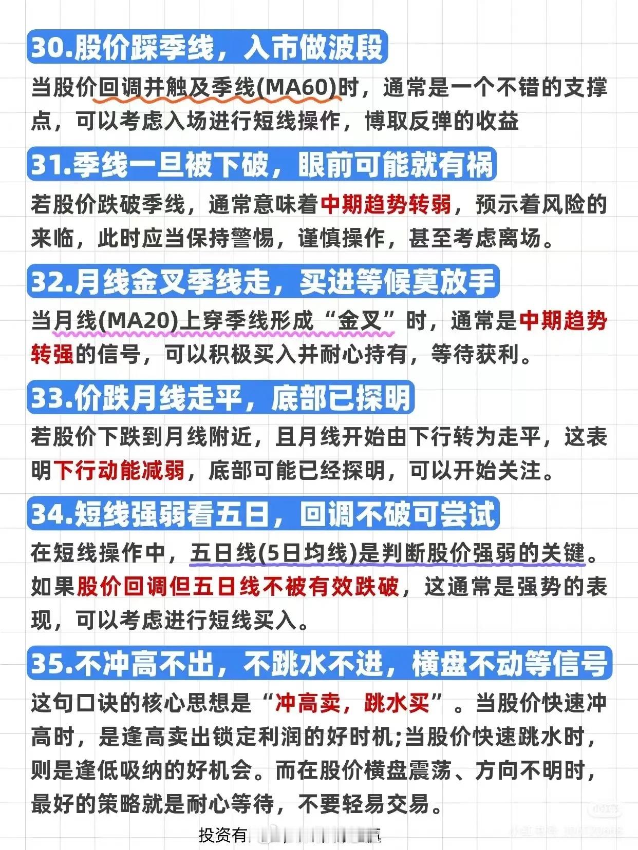 总结了38条股票交易口诀,涵盖短线、中线操作及买卖时机判断,核心围绕股价走势、成交量、主力行为与移动平均线的应用,具体如下:一、时段与股价强弱判断(1-5条)聚焦早盘、午前、午后及尾盘的关键时间点:午前10点是判断股价强弱的重要节点,强势股10点前能封停,弱势股涨停常拖延至午后;早盘急跌可逢低加仓做T+0,上午急拉切忌追高,适合逢高减仓做T+1;10点前冲板不牢的个股,午后回调概率高。二、午后、尾盘与主力行为(6-11条)午后股价飙升宜减仓锁定利润,骤跌则待次日找反弹机会;临近收盘十连板,次日低开可能性大;尾盘五分钟急杀跌多为洗盘,次日高开概率高。此外,急跌缓涨是洗盘信号,急涨缓跌是出货信号;买点选横盘筑底或低位探坑时,卖点在市场情绪鼎沸处;急跌无量是洗盘,缓跌放量需果断离场。三、回调与建仓时机(12-17条)冲高后需等充分回调甚至挖深坑再建仓;大涨后回调越深越可能是主力蓄力,后市或更强。急跌无量是主力恐吓散户,缓跌放量是出货信号;增量新低(新低且放量)暗示底部吸筹,放量反弹是进场时机;上涨无量多为诱多,勿追涨;大盘下跌时个股放量上涨(三分换手常态)显强势。四、换手率与量价关系(18-23条)换手率超5%时交易活跃但追高风险大,建议等回踩买入;换手率超30%的个股风险极高,非妖即坑需谨慎。放量不涨是顶部信号,缩量不跌是底部信号;缩量筑底成功后,放量上涨可进场;顶部放量下跌或开启漫长跌势,缩量下跌可能是洗盘,后市或反弹。五、横盘位置与趋势线应用(24-29条)高位横盘再冲高多为最后拉高出货,需及时抛售;低位横盘再新低可能是主力制造恐慌吸筹,可加仓;低位盘整藏杀机,警惕突然放量下跌。年线(MA250)抬头向上时,回踩年线是低吸机会;年线向下则处于长期下跌趋势,勿轻易接刀。六、移动平均线(MA)操作(30-35条)股价踩季线(MA60)是支撑点,可做波段;跌破季线预示中期转弱需警惕。月线(MA20)金叉季线是中期转强信号,可买入持有;股价跌至月线且月线走平,底部或已探明。短线强弱看五日线(MA5),回调不破可尝试买入。核心策略“不冲高不出,不跳水不进,横盘不动等信号”,即冲高卖、跳水买,横盘观望。七、阴阳线与均线买卖(36-38条)反向操作精髓:买在阴线(回调时),卖在阳线(上涨时)。巨量阳线多为加速出货,尾盘需果断离场;线上(均线之上)阴线是强势回调可买入,线下(均线之下)阳线是下跌反弹应卖出。