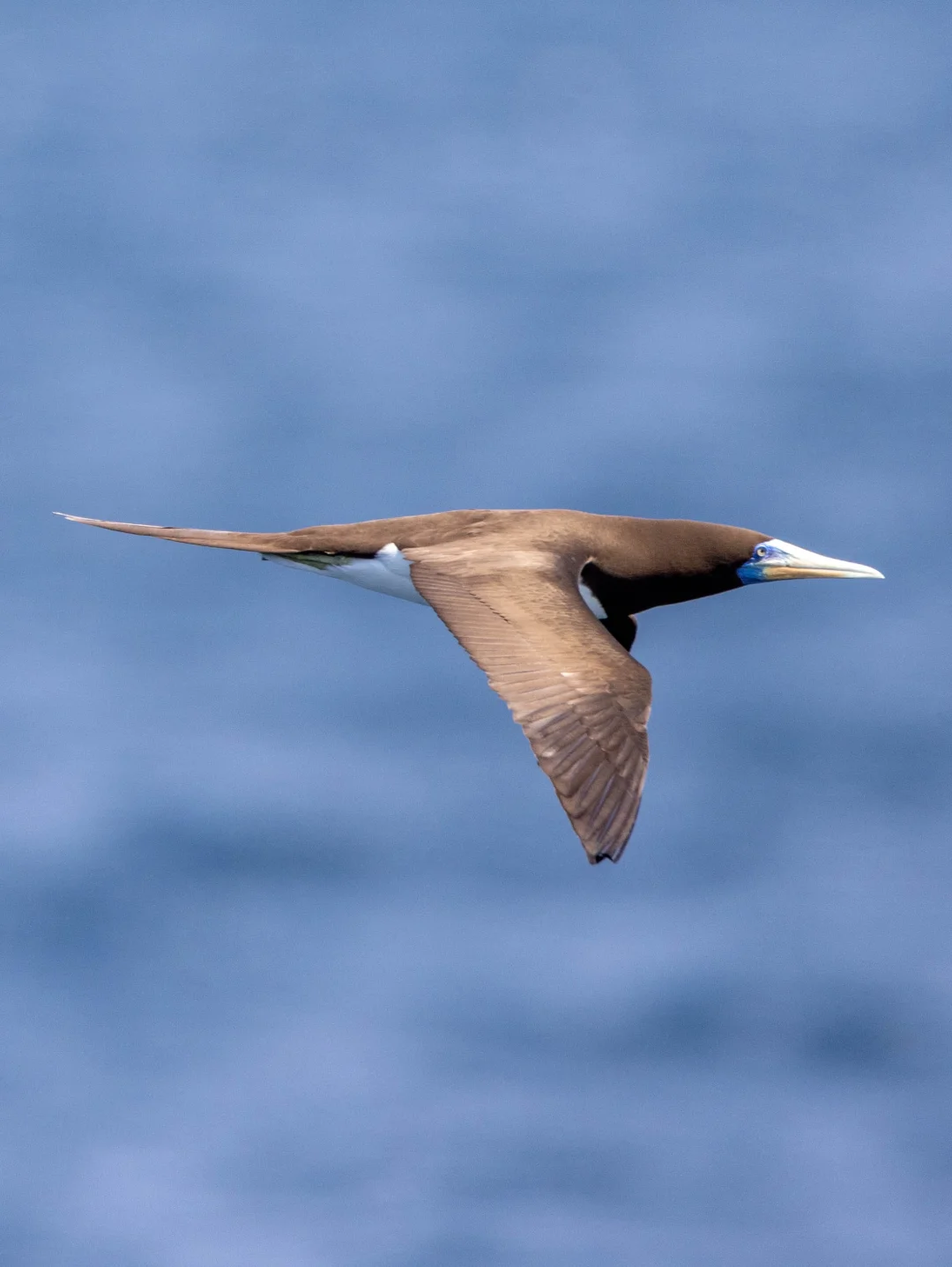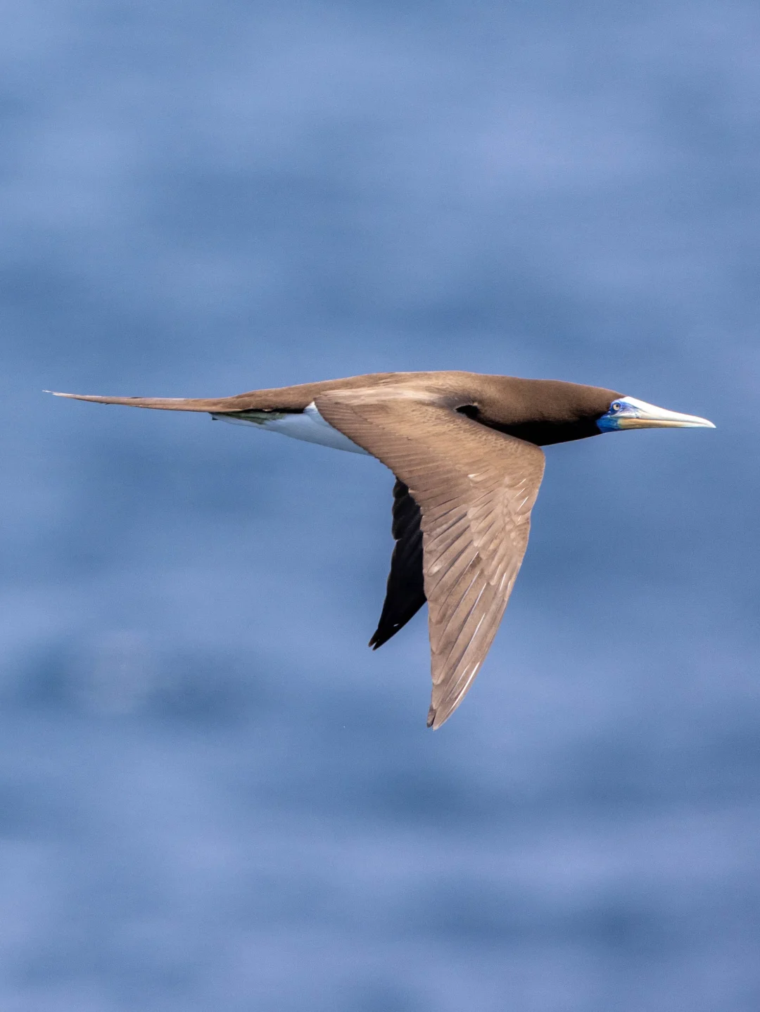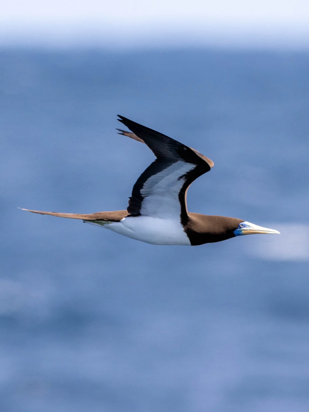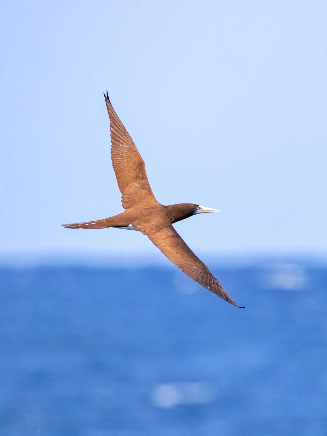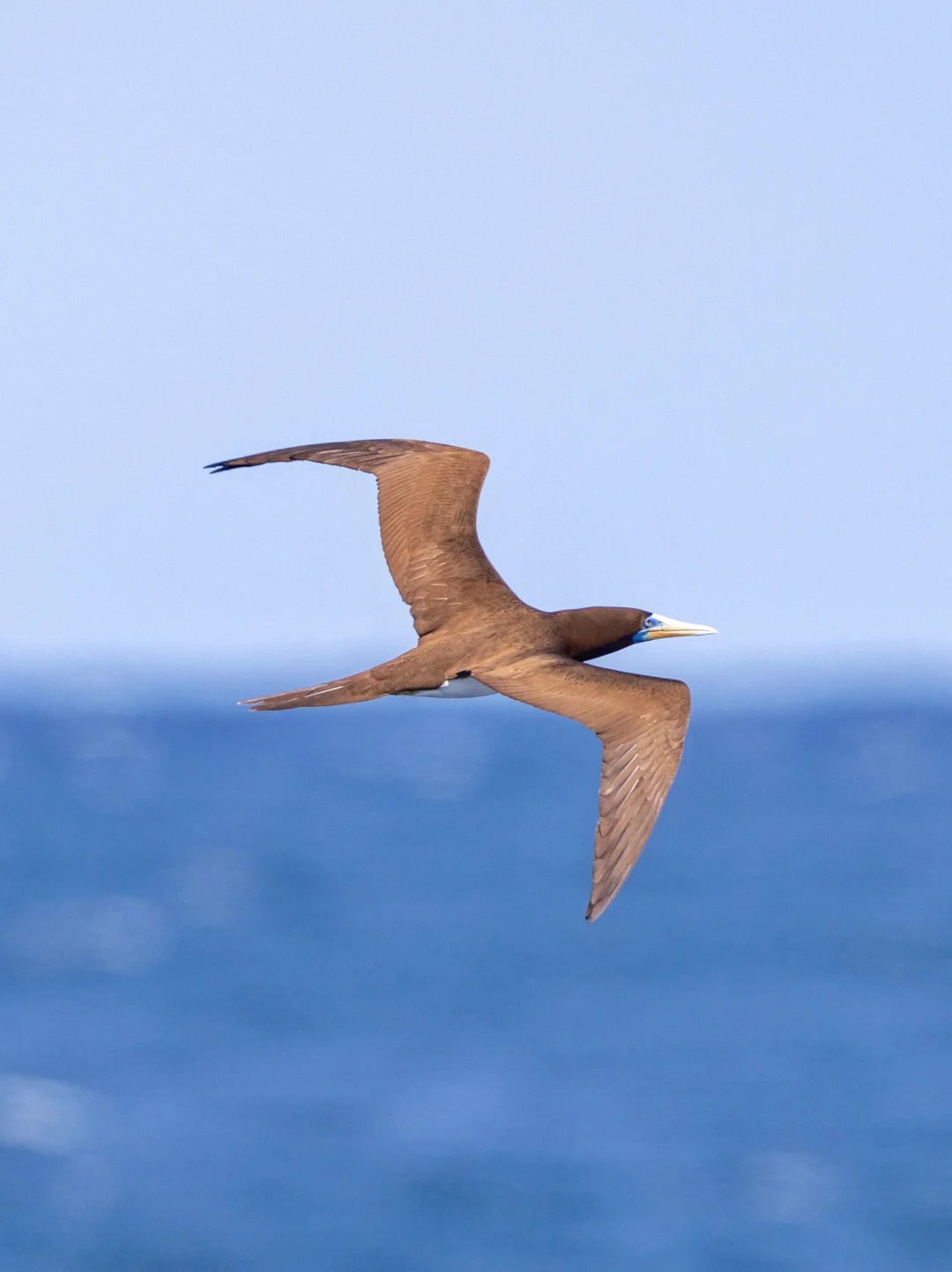 原创拍摄于2025.03 褐鲣鸟,Brown Booby,鲣鸟目鲣鸟科鲣鸟属。褐鲣鸟是全球热带海域常见的大型海鸟,但是在我国通常要航行出离岸较远的海上才能看到,所以对于国内的观鸟者来说相对比较少见。 我非常喜欢鲣鸟的体型和曲线,非常丝滑,丝滑到喙和头部的曲线连续,没有明显的界线。褐鲣鸟颜色和其他鲣鸟相比比较特别,成鸟有明显的暗棕色胸盾和白色腹部。 褐鲣鸟在本次东海出海还是见到多次的,相比去年出海就见到一次,相当给面子了。