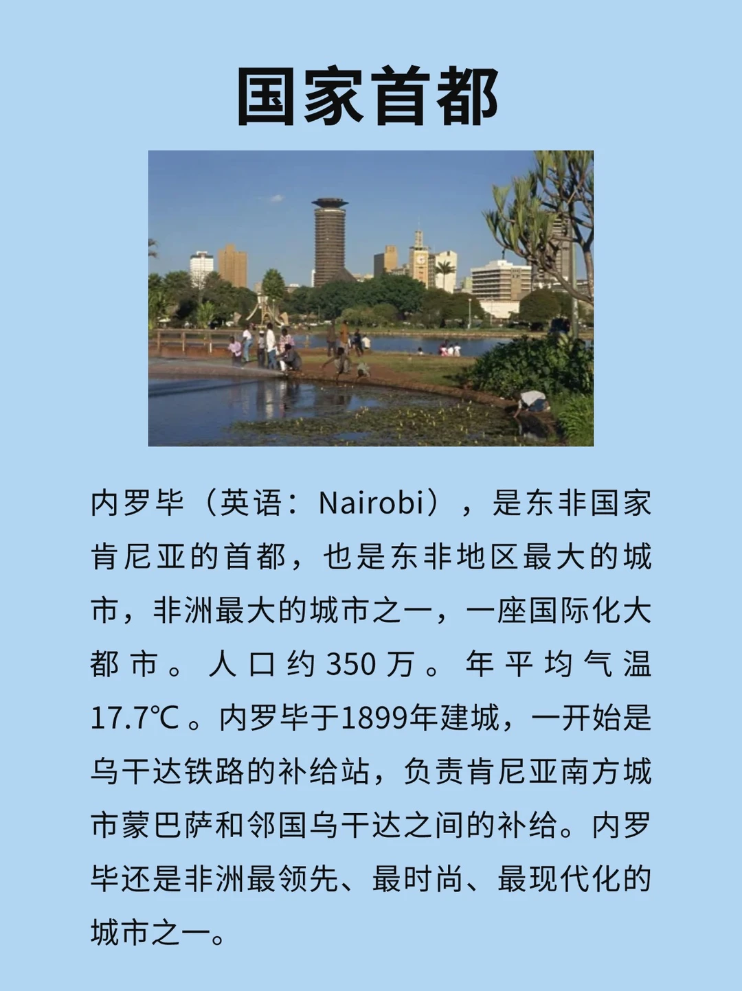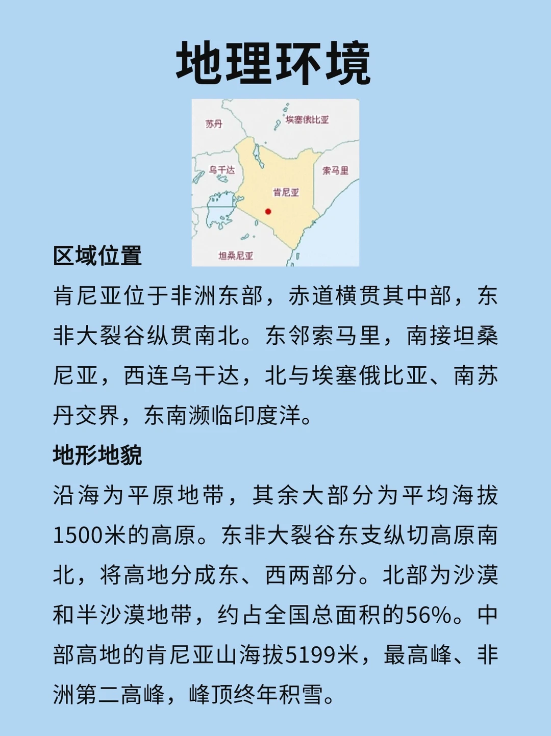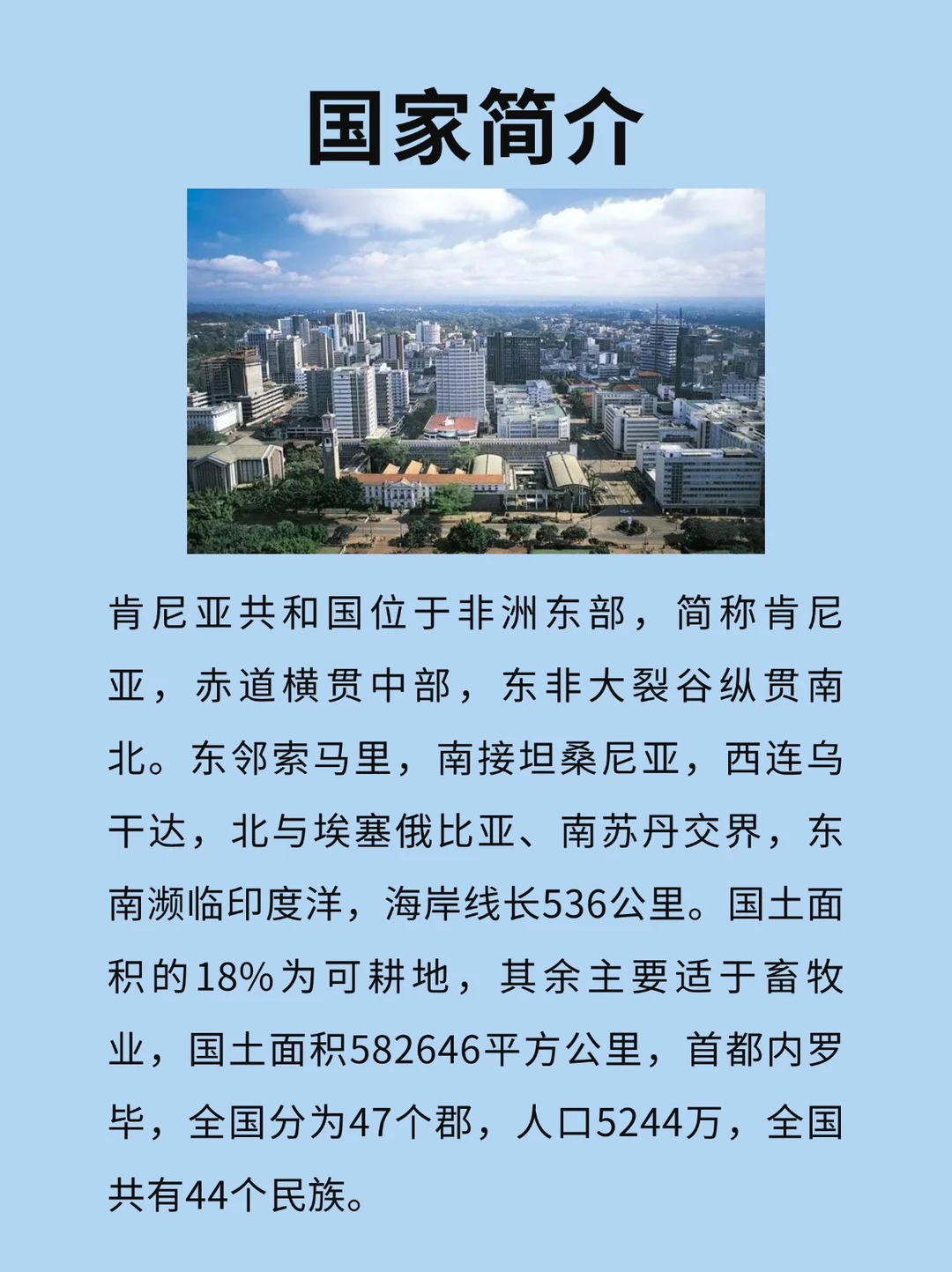 [打卡R]肯尼亚共和国位于非洲东部,简称肯尼亚,赤道横贯中部,东非大裂谷纵贯南北。 [向右R]东邻索马里,南接坦桑尼亚,西连乌干达,北与埃塞俄比亚、南苏丹交界,东南濒临印度洋,海岸线长536公里。 [向右R]国土面积的18%为可耕地,其余主要适于畜牧业,国土面积582646平方公里,首都内罗毕,全国分为47个郡,人口5244万,全国共有44个民族。