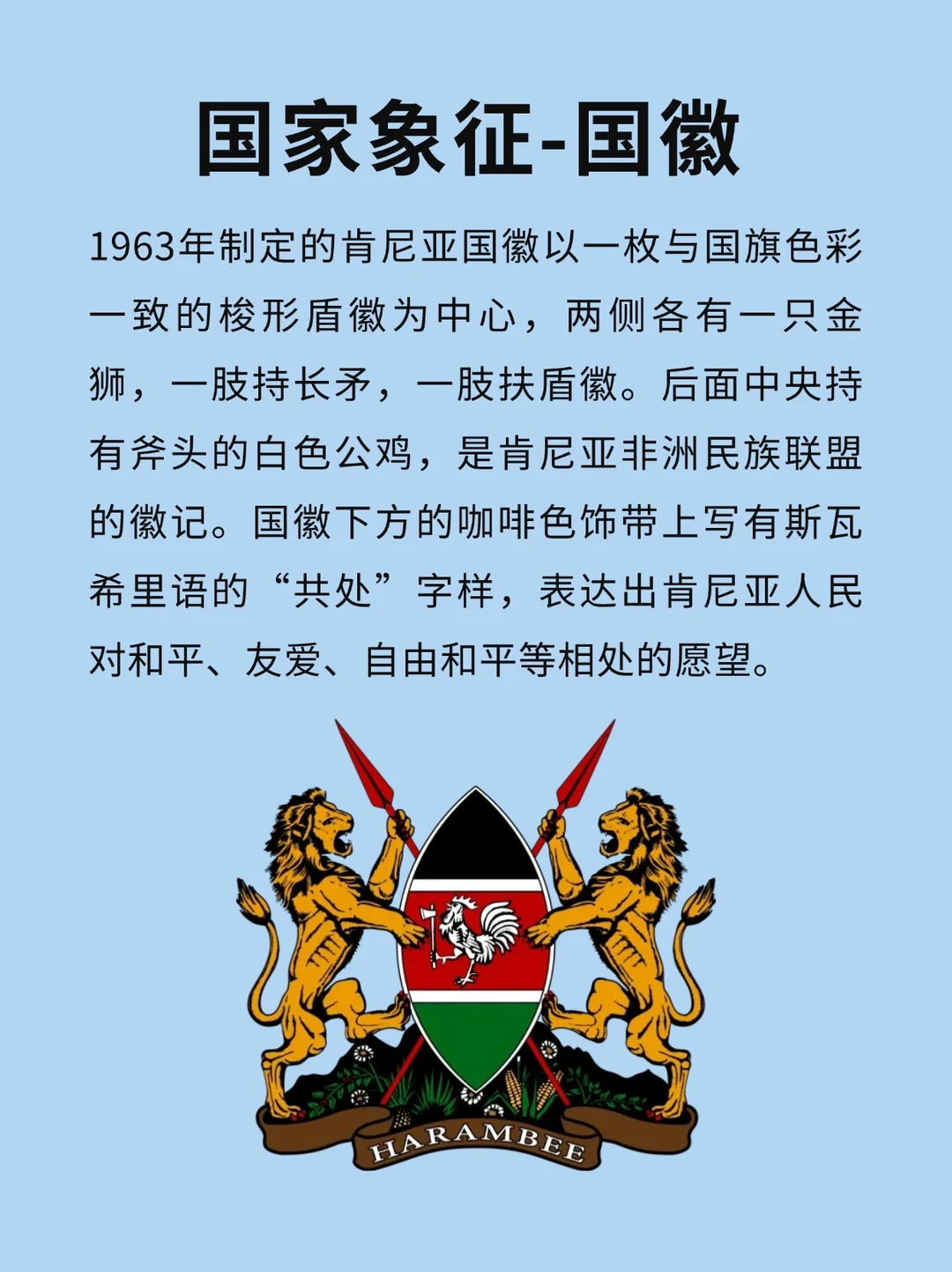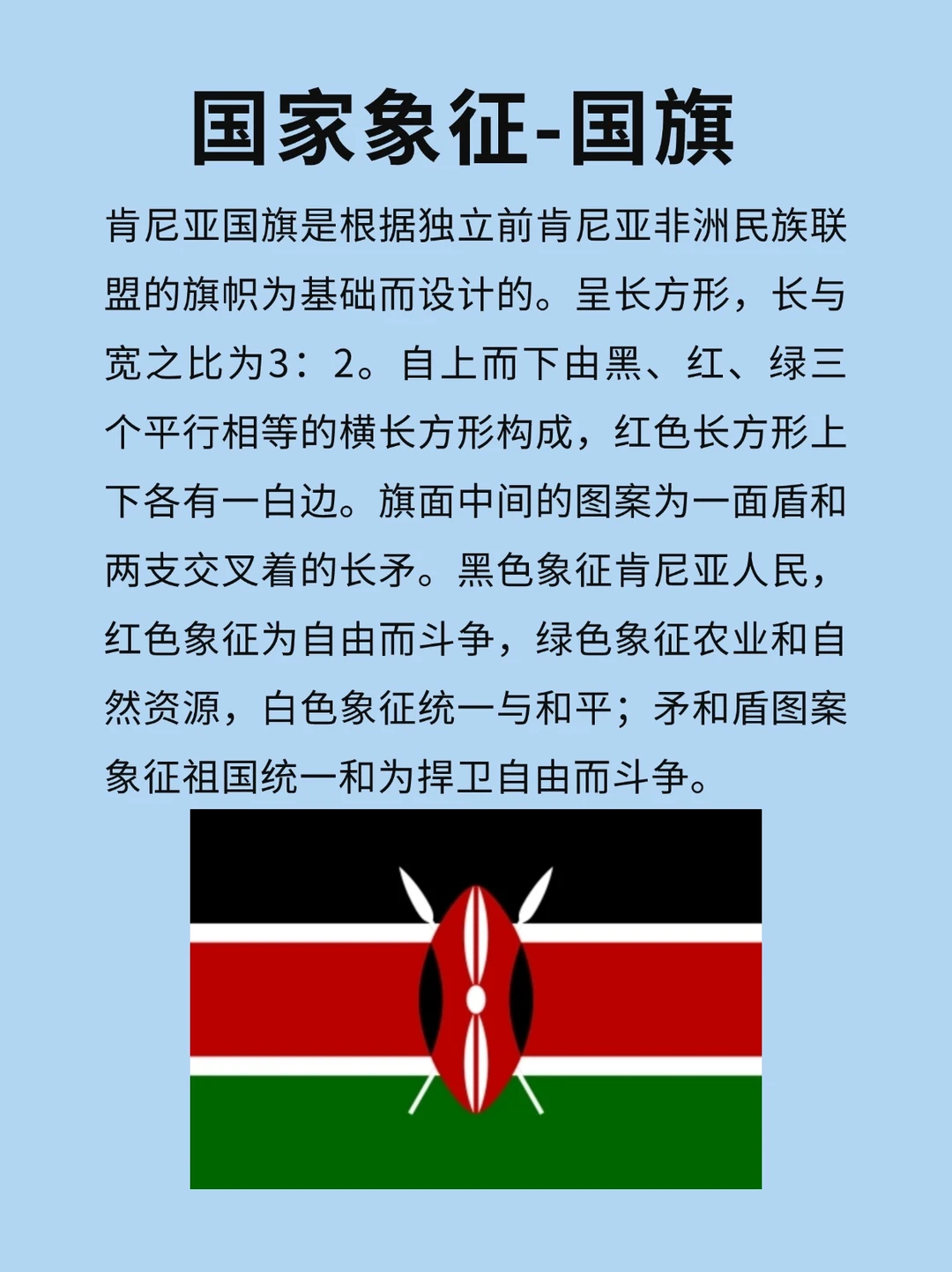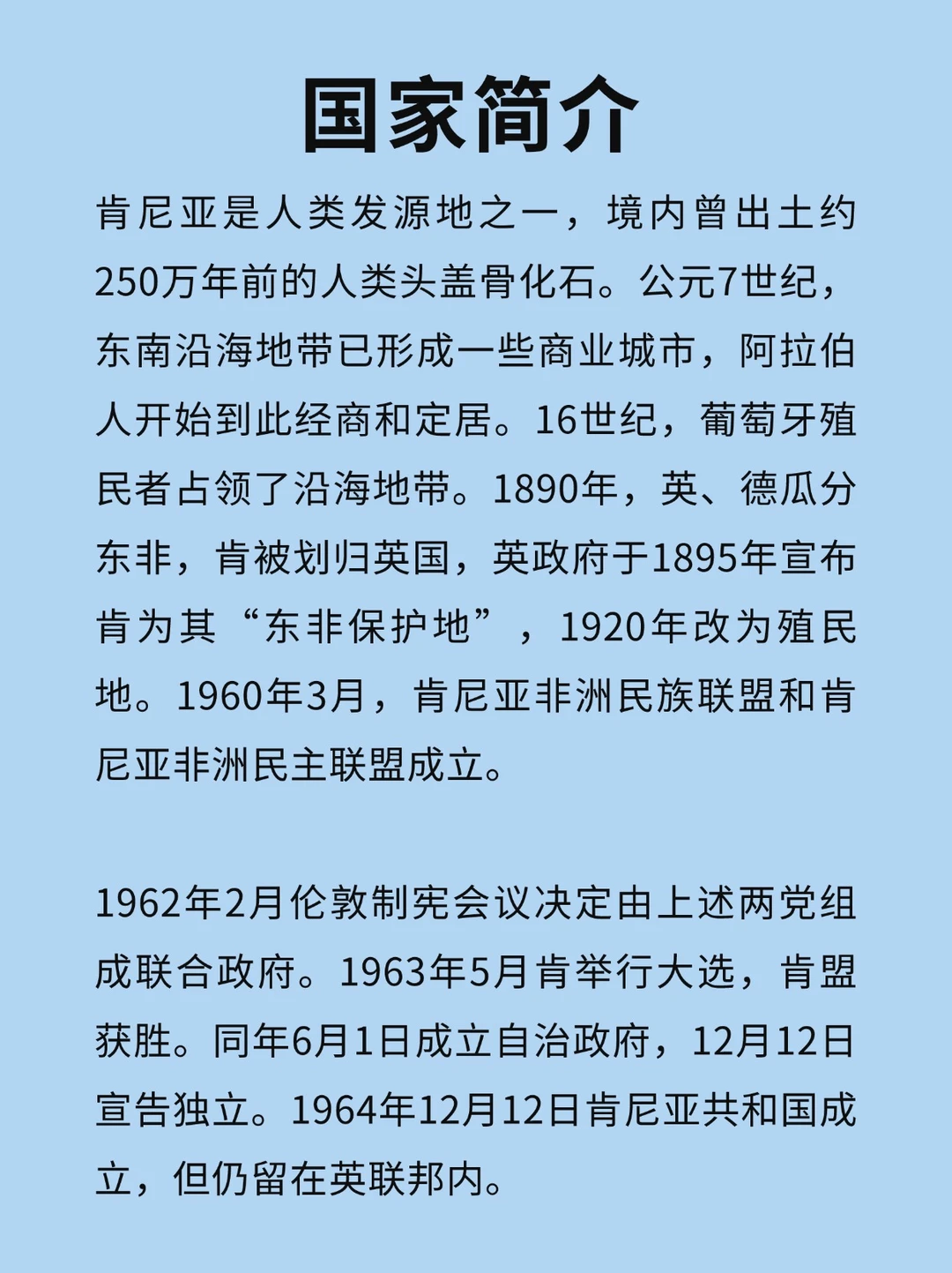 [打卡R]肯尼亚共和国位于非洲东部,简称肯尼亚,赤道横贯中部,东非大裂谷纵贯南北。 [向右R]东邻索马里,南接坦桑尼亚,西连乌干达,北与埃塞俄比亚、南苏丹交界,东南濒临印度洋,海岸线长536公里。 [向右R]国土面积的18%为可耕地,其余主要适于畜牧业,国土面积582646平方公里,首都内罗毕,全国分为47个郡,人口5244万,全国共有44个民族。