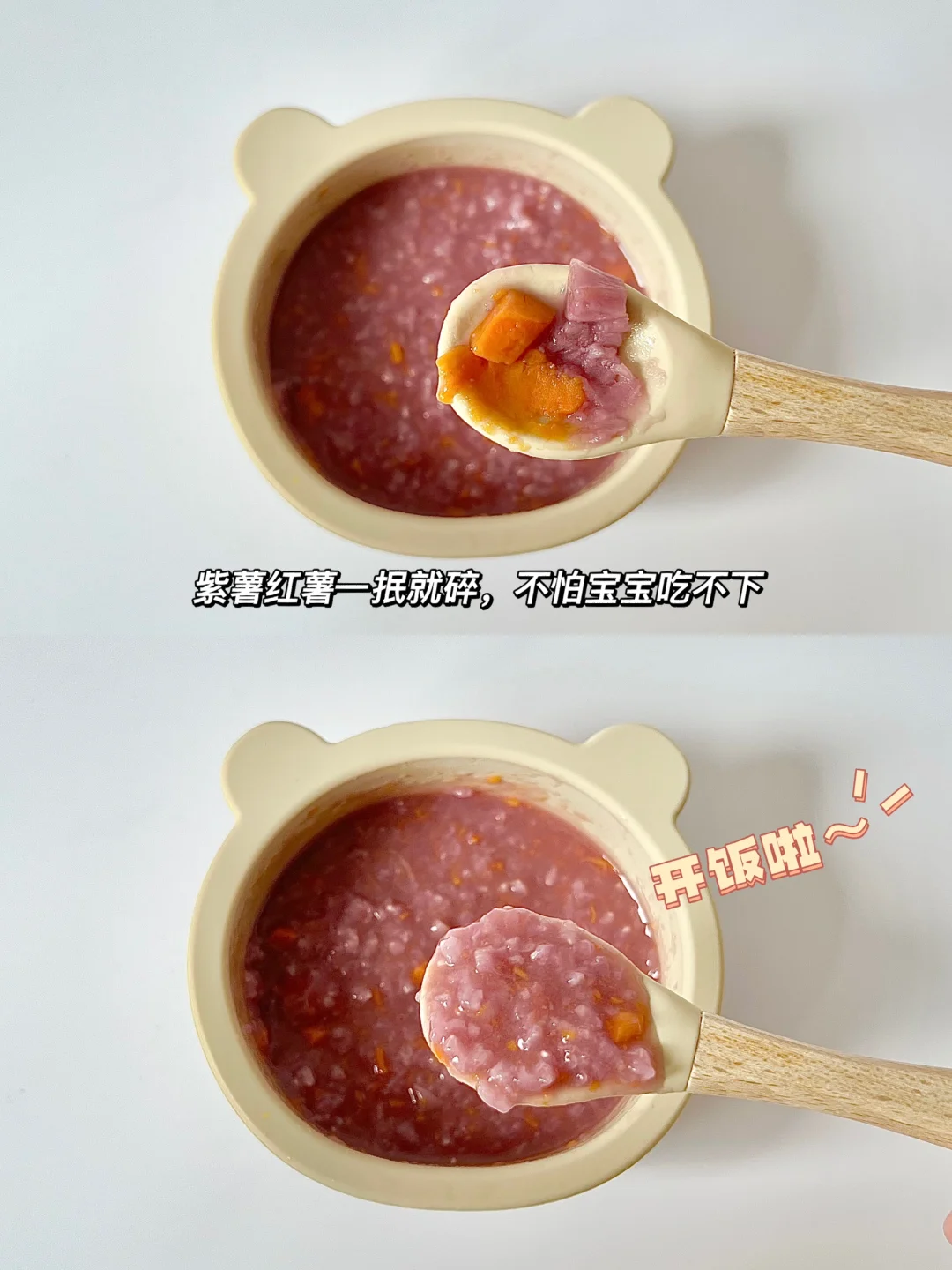 今天吃双薯十倍粥~紫薯红薯去皮切成小块跟胚芽米一起放下去电炖锅两个半小时,出锅紫薯红薯颗粒有点大,大宝宝可以直接吃,一抿就碎,小宝宝可以跟我一样用勺子压一下再吃,昨天的紫薯粥同理…