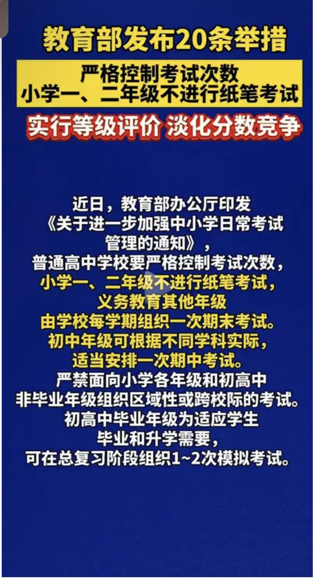 教育部发布最新通知,主要有四条 1、小学一二年级不得使用纸笔考试; 2、不得向任何组织和个人购买考试试卷和其他考试内容; 3、高中阶段学校要合理设置考试科目和次数,严格控制考试次数,不得组织各类联考; 4、义务教育阶段日常考试结果只可用等级表示,不得排名,不得公布具体分数。 看到这个消息后,有部分网友表示支持,认为可以遏制幼小衔接的过度竞争。 也有家长担心,中考、高考的压力依然存在,只是转移了,可能会出现课堂教学与考试内容不一致,学生的学生时代会变得更加难以理解,隐形的竞争更可怕,更难处理。 不过也有部分人认为,减负的核心在于不让学生背负家长焦虑的沉重,不让学生成为家长焦虑的工具。至于减负能不能落实,见仁见智,但至少在家长焦虑没有消失之前,减负这件事做不好也不奇怪。 网友说:只有通过考试,老师和家长才知孩子学习成绩的好坏。孩子读书的终极目的是高考定前程