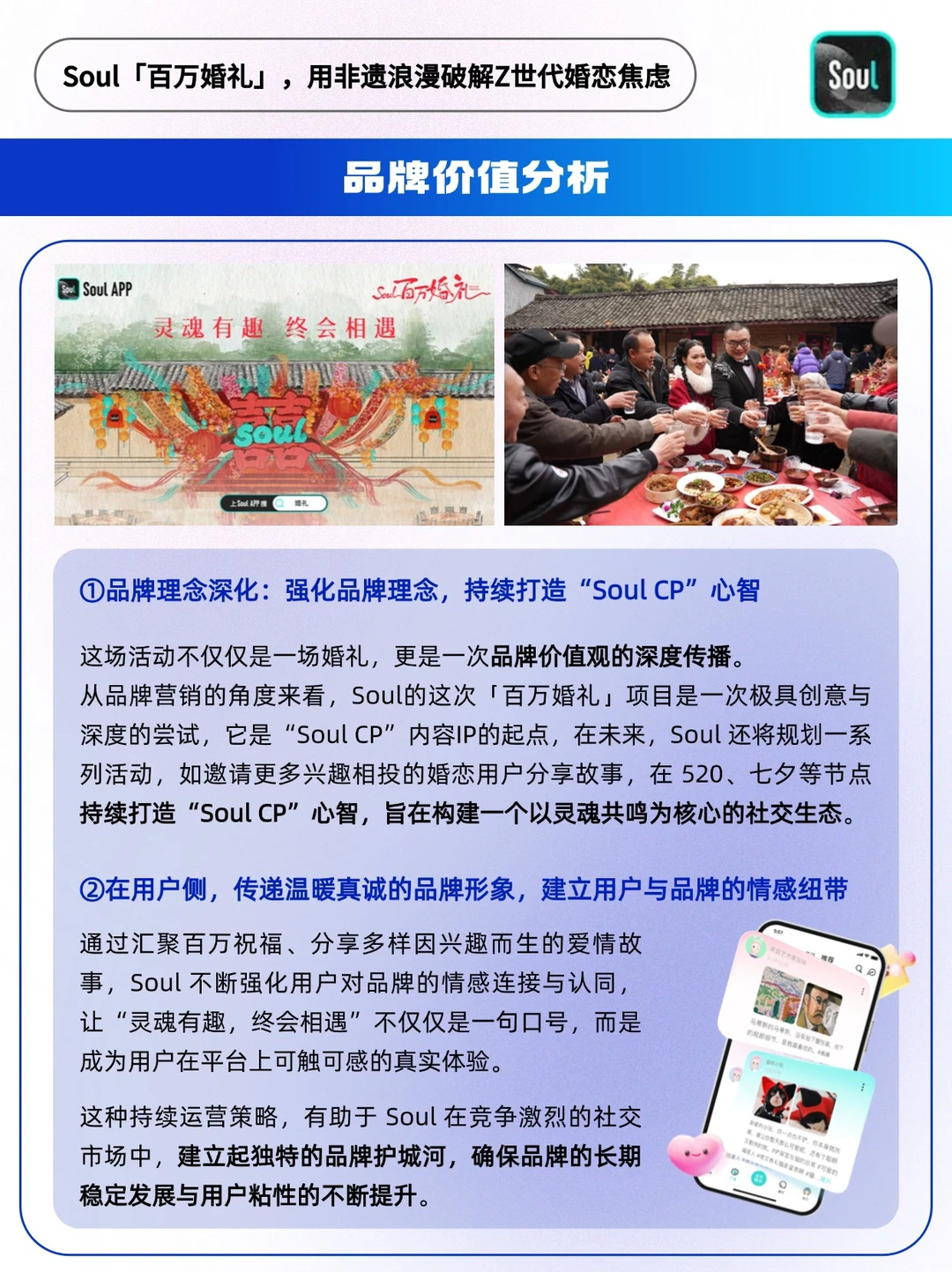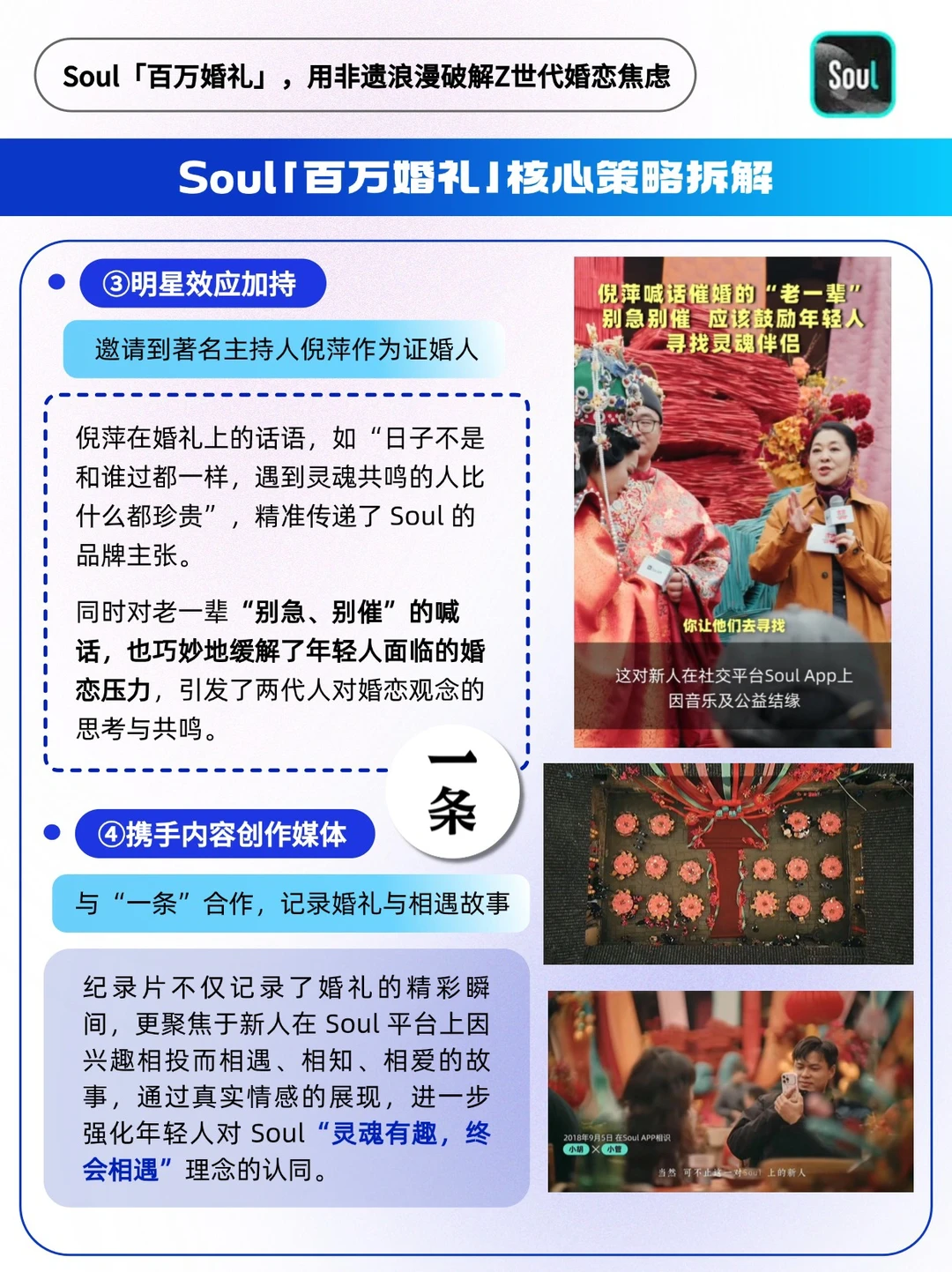 ❤️这场「百万婚礼」不仅仅是一对新人幸福的起点,更是一次Soul品牌价值观的深度传播。通过Soul上真实美好的爱情故事,鼓励更多年轻人去勇敢相遇,在个人主义狂奔消费主义盛行的时代下,在Soul上被网线牵起的灵魂相遇,依然是生命中的奇遇,依然可以相信灵魂有趣终会相遇。