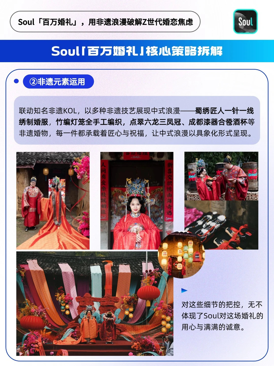 🔵同时为了满足这对Soulcp的心愿,Soul还联动蜀绣匠人,以多种非遗技艺展现中式浪漫——蜀绣匠人一针一线绣制婚服,竹编灯笼全手工编织,点翠六龙三凤冠、成都漆器合卺酒杯等非遗婚物,每一件都承载着匠心与祝福。非遗的加入,也让这场婚礼更具备仪式感[赞R]
