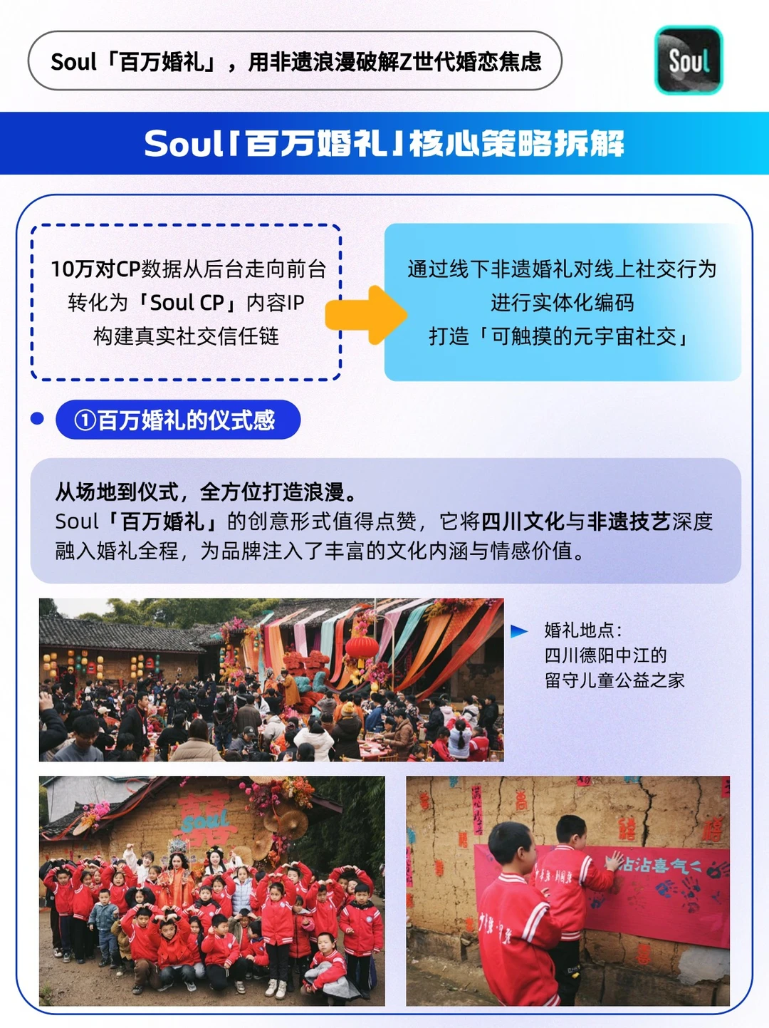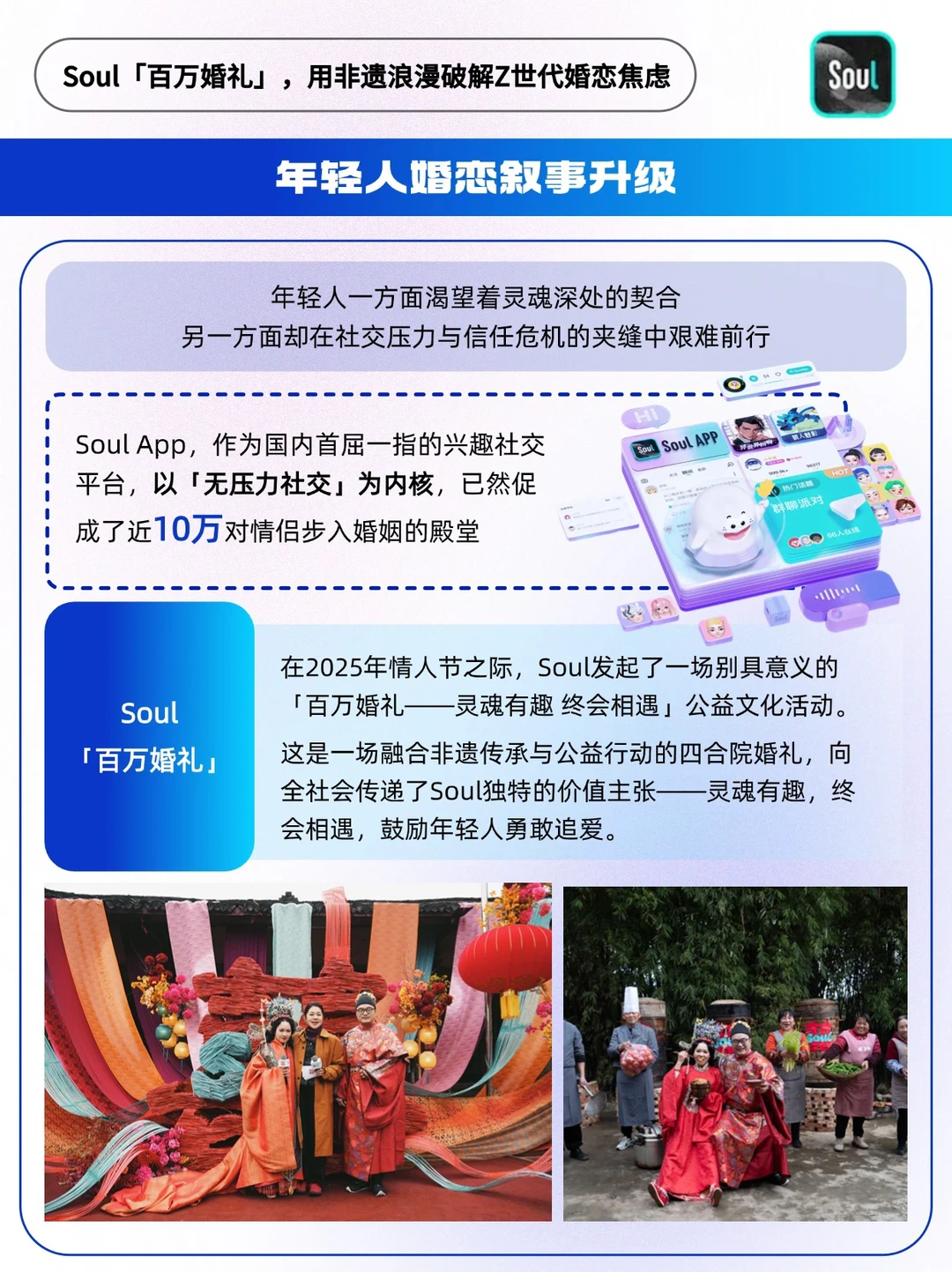 🔵在2025年情人节之际,Soul发起了一场别具意义的「百万婚礼」。这是一场融合非遗传承与公益行动的四合院婚礼,向全社会传递了Soul独特的价值主张——灵魂有趣,终会相遇,鼓励年轻人勇敢追爱。