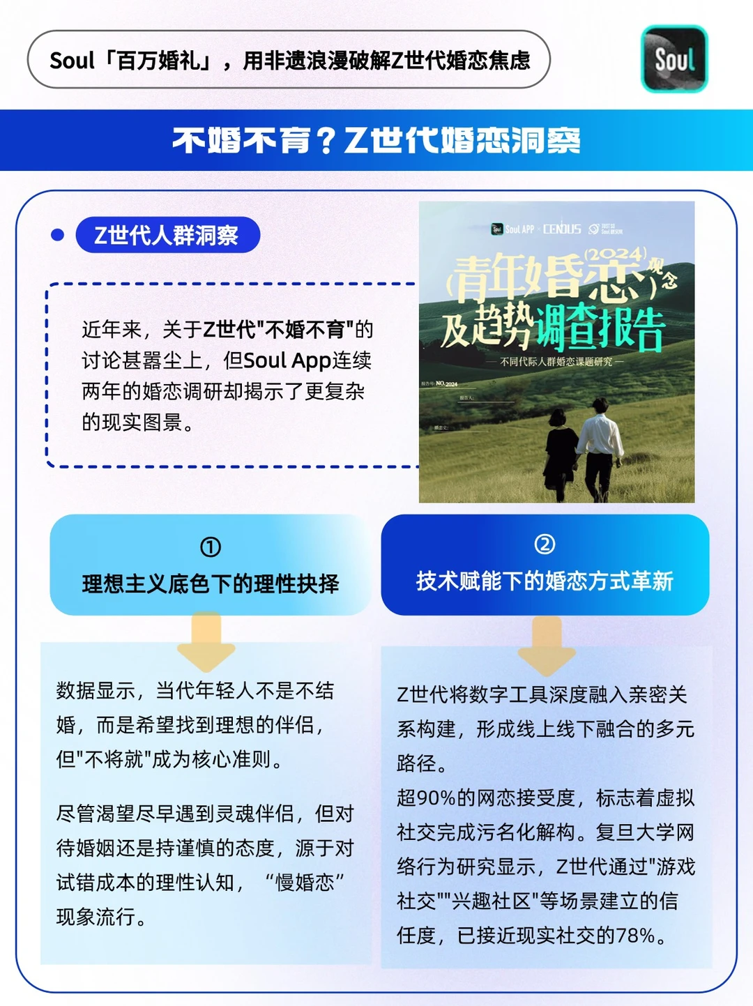 近年来,关于Z世代"不婚不育"的讨论甚嚣尘上,但Soul App连续两年的婚恋调研却揭示了更复杂的现实图景——年轻人不是“不婚主义”,而是“渴望爱情”🫡