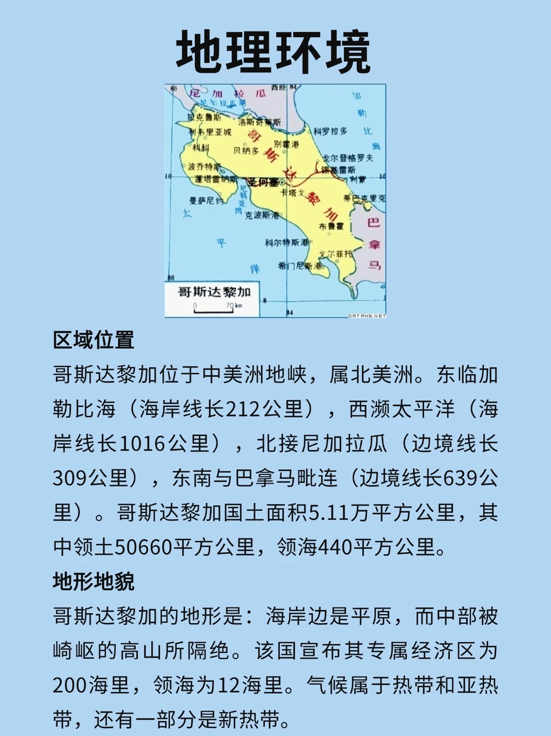 [仙女R]哥斯达黎加共和国(The Republic of Costa Rica,La República de Costa Rica),简称哥斯达黎加,是位于拉丁美洲的一个总统共和制国家,北邻尼加拉瓜,南与巴拿马接壤。