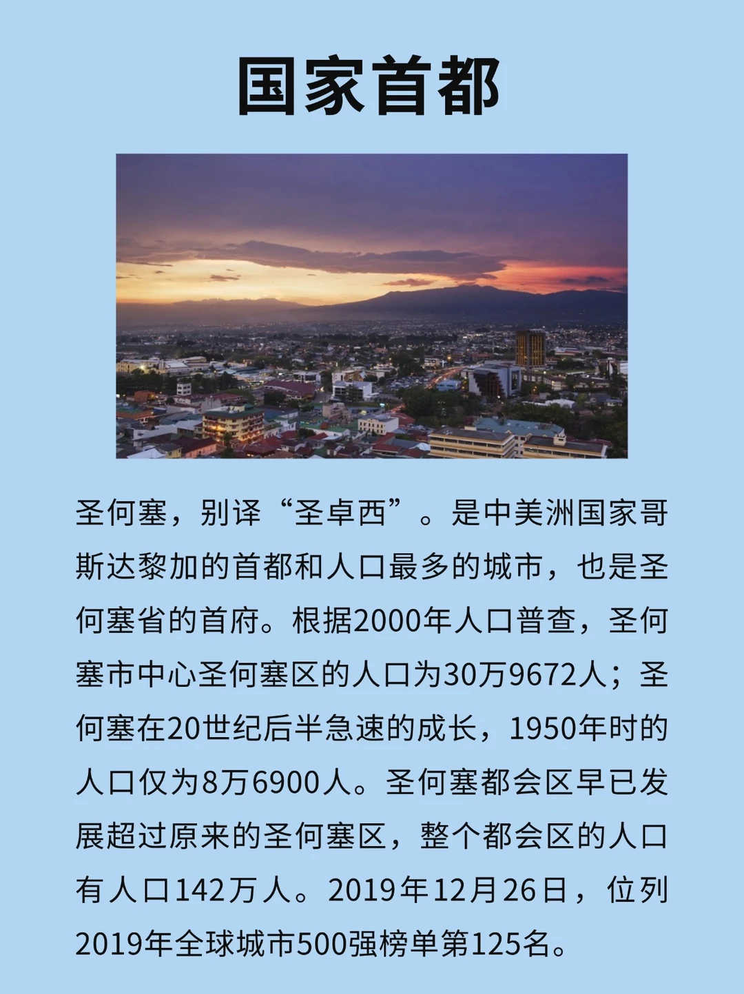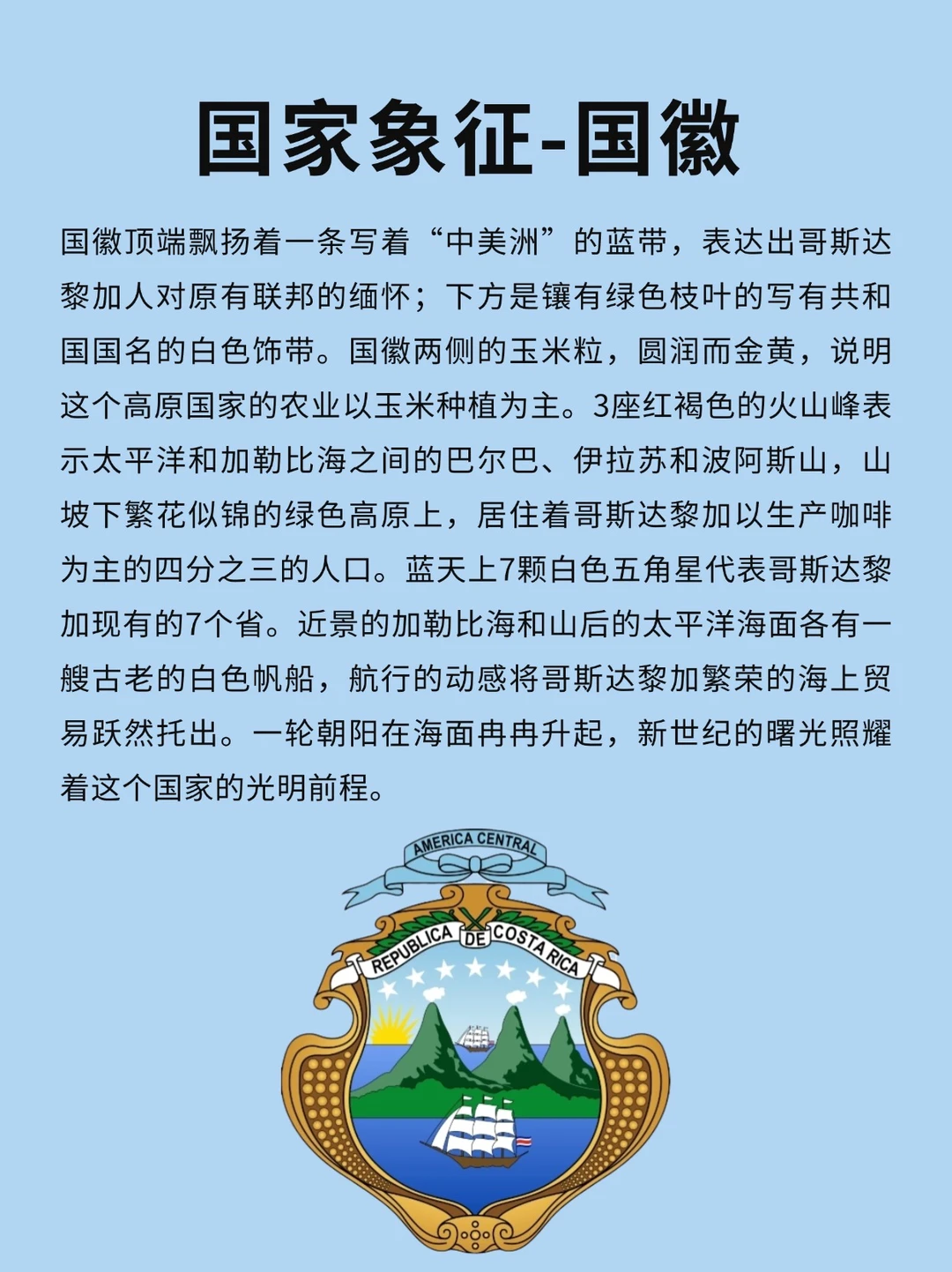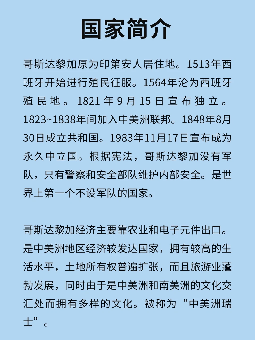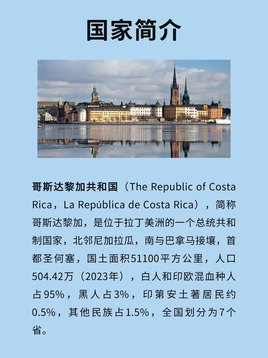 [开箱R]首都圣何塞,国土面积51100平方公里,人口504.42万(2023年),白人和印欧混血种人占95%,黑人占3%,印第安土著居民约0.5%,其他民族占1.5%,全国划分为7个省。