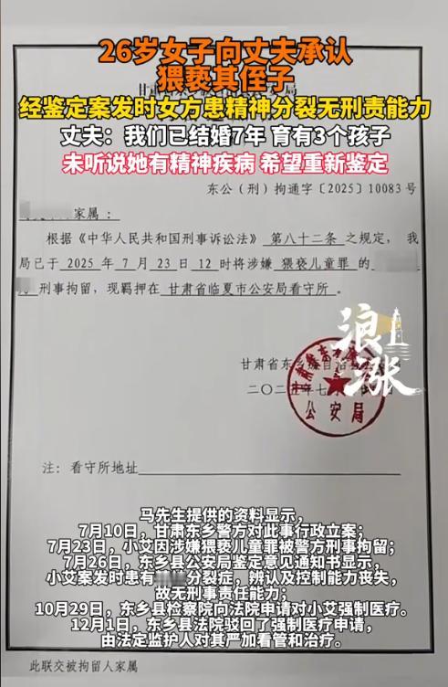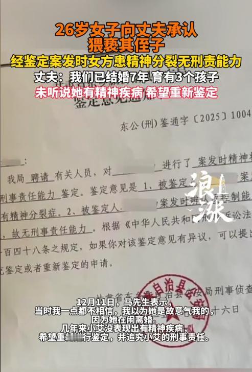 “必须查清楚!”甘肃东乡族自治县,女子亲口告知丈夫,她在3天前猥亵了12岁的侄子,这让丈夫头都炸了。随后丈夫去找侄子求证,侄子虽然感到恐惧和害羞,但还是承认了此事。女子的丈夫和侄子的父亲气得报了警,但警方却鉴定出女子患有精神分裂症。女子丈夫不认可这个鉴定结果,认为女子从未表现出任何异常,只是最近再闹离婚,所以提出了重新鉴定,要求追究女子的刑事责任。(来源:浪涨新闻) 据悉,女子艾某今年26岁,她和丈夫马先生已经结婚7年多,二人共生育了3个孩子。可原本幸福的一家五口人,却因为侄子的到来,发生了翻天覆地的变化。 马先生的侄子小马才12岁,是他大哥的儿子,一直跟着大哥大嫂在外地上学。2025年6月份,小马回老家看看爷爷奶奶,这让马先生和两位老人十分高兴。 由于屋内房间多,马先生就让妻子艾某收拾了一间房出来,让小马居住。6月30日晚上10点多。当时小马已经睡着了,谁知艾某突然进入了小马的屋内,很久后才出来。 马先生当时并未发现异常,因为家里的3个孩子尚小,每天都需要他来哄睡。 直到7月3日晚上11时,马先生和往常一样先将3个孩子哄睡,然后回到自己屋内准备睡觉,结果发现艾某不在房间,而侄子小马却坐在了客厅沙发上,一副不知所措的样子。 马先生询问小马为何不睡觉,小马支支吾吾不知道如何解释,他只是头往房间里看了看。马先生顺着小马的目光看向房间内,发现艾某正睡在小马的床上。 随后马先生将艾某拽回了房间,并询问其为何会睡在小马的床上。可谁知艾某接下来的话,让马先生震惊当场。 艾某将自己前几天晚上猥亵小马的事一五一十的说了出来,这让马先生气愤不已,自己的侄儿小马才12岁,艾某怎么下得去手? 一开始马先生还不太相信,认为是艾某故意气他的,因为最近艾某突然在闹离婚。直到马先生找小马亲自确认过,得到小马的承认后,马先生才相信了此事。 次日一早,马先生就气得打电话给岳父,要求其将艾某带回家。同时马先生向艾某正式提出离婚,并要求艾某赔偿小马的精神损失。 小马见自己回来后,导致叔叔马先生一家闹散了,心里也很不是滋味,于是离家出走。马先生等人找了一天,后在镇上的一家宾馆找到了小马。马先生并未责怪小马,他发誓要让艾某付出代价。 之后,马先生连同小马的父亲一起报了警,指控艾某的猥亵儿童罪罪名。 可是警方经过鉴定,发现艾某在案发时患有精神分裂症。 《刑法》第18条规定,精神病人在不能辨认或者不能控制自己行为的时候造成危害结果,经法定程序鉴定确认的,不负刑事责任,但是应当责令他的家属或者监护人严加看管和医疗;在必要的时候,由政府强制医疗。 尚未完全丧失辨认或者控制自己行为能力的精神病人犯罪的,应当负刑事责任,但是可以从轻或者减轻处罚。 现在警方只是鉴定出艾某在案发时精神分裂症发作了,但并未确定其在案发时属于无刑事责任能力,还是限制刑事责任能力。 直到7月23日,警方才对艾某作出了刑事拘留措施。 在7月26日,警方出具了一份鉴定意见,显示艾某在案发时无法辨认以及控制自己的行为,属于无刑事责任能力人。之后,艾某便被送到医院接受治疗。 马先生和大哥对于这个鉴定结果不满,认为艾某从未有过精神病史,平时看起来也十分正常,怎么犯案后就出现了精神分裂?这也太巧合了吧。 10月29日,当地检察院申请对艾某进行强制医疗措施,但被法院给驳回了,理由是艾某的病情已经稳定,且艾某的家属均不同意强制医疗,所以按照规定将艾某交由监护人严加看管。 目前,马先生与大哥再次申请重新做精神能力鉴定,誓要追究艾某的刑责。 从法律上来讲,如果是男性侵犯女性,会有两种结果,一种是强奸罪,一种是强制猥亵罪。而女性侵犯男性,只有强制猥亵罪。 《刑法》第237条第3款规定,猥亵儿童的,处5年以下有期徒刑。 如果重新鉴定结果后,艾某在案发时没有还精神疾病的,那她将面临5年以下有期徒刑的处罚。 既然马先生和大哥已经申请重新鉴定,那为何迟迟没有做鉴定呢? 据马先生表示,警方那里传来的消息是,艾某不配合做鉴定,导致重新鉴定程序始终无法进行。 由此可见,这艾某是否患有精神分裂症,还是个未知数。 《刑事诉讼法》明确规定,对于一切案件都要重证据轻口供,而且证据要到达到排除合理怀疑的程度。 既然艾某在刚立案的时候配合做了精神能力鉴定,现在又不同意做了,这就不得不让人怀疑这个鉴定的结果存在作假的情形。 希望公安机关和公诉机关能明察秋毫,不错抓一个好人,也不要放过任何一个坏人。 对此,您怎么看?欢迎留言交流。