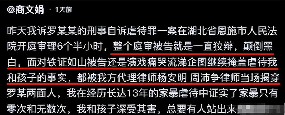 女子被家暴13年后续:穿纸尿裤上庭,老公痛哭叫屈,律师语出惊人。 每一个受害者的沉默,都是对暴力的纵容;每一次忍耐,都是对生活的妥协。然而,商文娟用自己的行动告诉我们,勇敢站出来,拒绝沉默,就是对家庭暴力最有力的反击。从13年的痛苦到如今的坚强,她用生命在摇曳的火光中点燃了一盏希望的灯。 然而,令人愤怒的是,面对铁证如山的事实,嫌疑人罗某某竟敢在法庭上哭诉自己是“被家暴的一方”,还试图用“普通家庭矛盾”来遮掩罪行。这种狡辩,究竟只是法律的无奈,还是人性的扭曲?当法律的天平倾斜时,为什么还是有人试图用谎言和偏见来模糊真相?这不仅仅是一个家庭的悲剧,更是我们社会对“家庭暴力”认知的反思。 从商文娟的故事中,我们看到了一个母亲的坚韧,也看到了法律制度的不断完善。新出台的“自诉转公诉”机制,像一束曙光,为受害者撑起了保护伞。过去,许多受害者因为恐惧、威胁或经济压力,不敢为自己发声。而现在,法律正逐步成为他们最坚实的后盾,让“被动忍受”变成“主动反抗”。 更令人震撼的是,商文娟在面对自身的身体和精神双重创伤时,没有选择放弃自己。她用抖音平台发声,用真实的故事唤醒更多人的关注。她的行动不仅是对施暴者的控诉,更是对所有潜藏在暗处、等待救赎的受害者们的一份鼓励。她用行动告诉我们:没有人应该忍受家庭暴力,没有人应该被伤害后依然沉默。 这场官司,或许还要一段时间才能见到最终判决,但它早已在社会的心中拨下一颗种子。我们期待法律的正义,期待那些被压抑的声音能够被听到,也希望每一个家庭都能远离阴影,迎来真正的和谐与幸福。 家暴不是家庭的小事,它关系到每一个人的尊严和生命安全。商文娟的故事,是一面镜子,映照出我们社会的责任,也提醒我们:正义或许会迟到,但永远不会缺席。让我们为像她一样的勇士点赞,也为未来的家庭环境努力,让每个角落都充满爱与温暖。