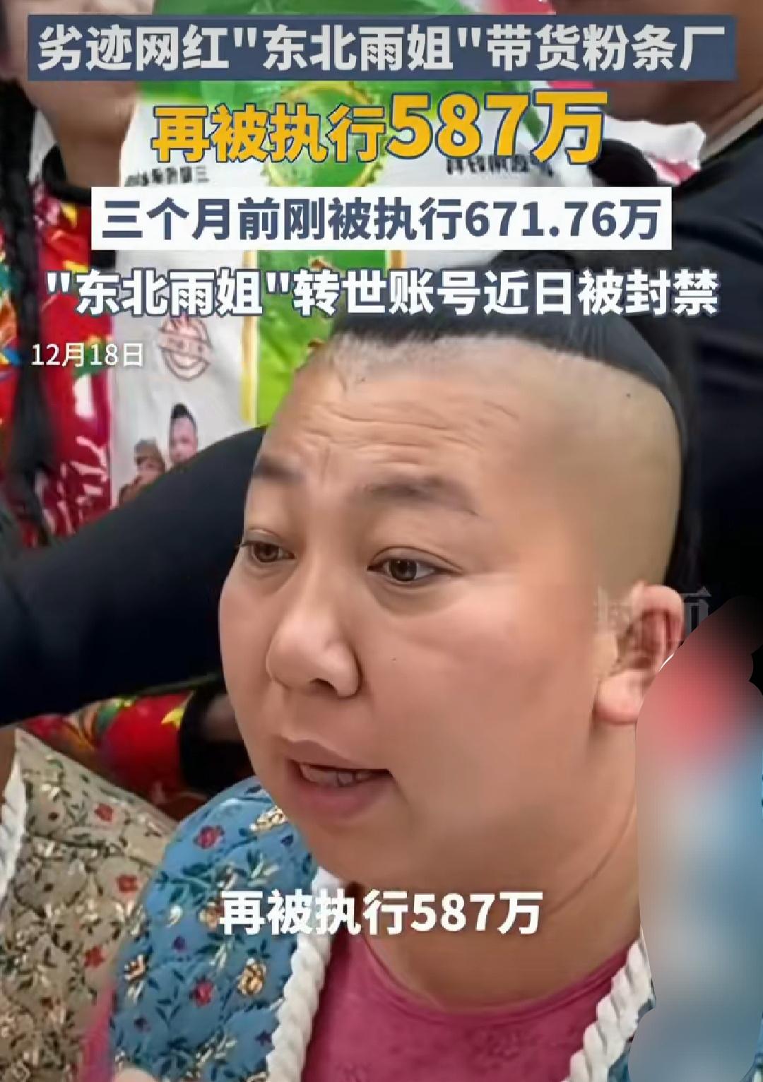 东北雨姐带货粉条厂再被执行 587 万。封面新闻从企查查发现,近日,朝阳县六合粉条制造有限公司被强制执行 587.79 万元。此前,该公司已被强制执行 671.76 万。2024 年 12 月,该公司因委托东北雨姐带货红薯粉条,红薯源性成分未检出,木薯源性成分检出事件,被罚款 587.7 七九万元并没收违法所得八十三点九七万元。12 月 12 日,北京市网信办通报,劣迹网红东北雨姐转世账号已被依法依约予关闭。