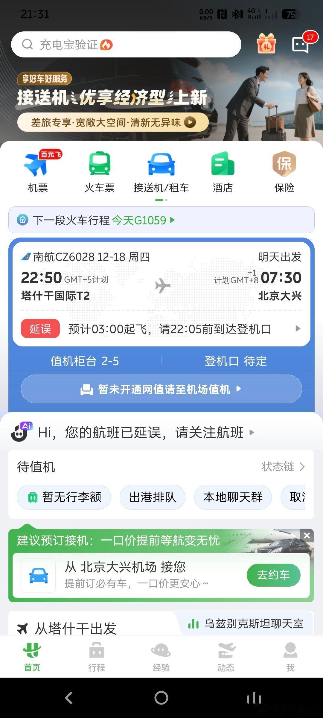 飞机延误三点起飞想去改签飞猪垃圾的很一直一个机器人给你回复携程他们客服直接改签到广州飞走了我还像个傻子一样要等到凌晨三点还不知道能不能起飞以后再也不用飞猪了幸好值机柜台有个中国人还能说话不然真要憋死了在外漂泊突然有点想家明天一天的行程安排全部打乱了电车老友记飞机延误 乌兹别克斯坦·塔什干