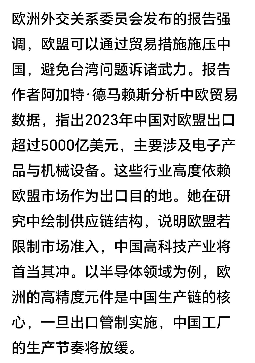看了这样的新闻,你肯定觉得难以理解,欧洲这帮人的脑子里装的是屎💩吗?他们为什么想这样做? 中国解放台湾关他们什么事? 唯一的问题就是中国变得更强大了,这就是影响到他们了。或者换个说法就是,中国人生活过得更好了。 这个问题的本质就是他们不想看到中国人过上好日子嘛。 中国解放台湾是中国在结束内战,这是在走向和平。 美国现在在威胁对委内瑞拉发动战争呢,你们怎么不去考虑用经济手段让美国放弃战争手段? 欧洲这帮二极管,满脑子想到都是可以让中国经济下滑17%,他们没有想到对欧洲贸易占中国对外贸易的比重是多少,外贸占中国经济的比重是多少,欧洲国家对中国产品依赖度是多少,支持他们这种无脑做法的欧洲国家又有多少…… 中国解放台湾,只会考虑一个问题,如何少死人,其他你们怎么想怎么做我们其实并不在意。 有些时候看到这帮二极管真的会被气笑。你拿他们当人看,但是他们真不拿自己当人。 点右上角关注我,我们一起去看这个魔幻的世界