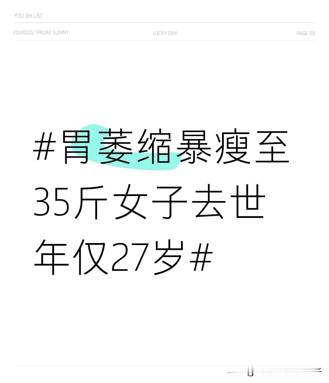 胃萎缩暴瘦至35斤女子去世 年仅27岁 太痛心了,27岁的广东女孩“巧巧”因胃萎缩暴瘦至35斤后离世。今年7月她发布求助视频时,就已瘦骨嶙峋。她命运多舛,自幼与父亲相依为命,父亲因胃癌去世,她也患上重度抑郁症,吃不下饭,最终确诊重度胃萎缩,只能靠营养液维持。 有说法称她是过度减肥致厌食症引发胃萎缩,也有说是重度抑郁症导致,前者似乎更可信。她从90多斤瘦到35斤,治疗还遭捐款质疑。年纪轻轻就走了,生命如此脆弱,大家一定要珍惜健康,别让悲剧重演。