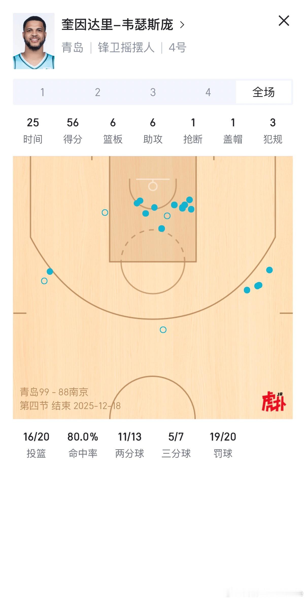 赛季第一个50+达成,来自于青岛男篮外援韦瑟斯庞,全场砍下56分6篮板6助攻cb