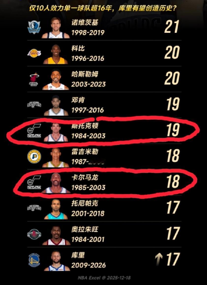 卡尔马龙和斯托克顿在这个“效力单一球队记录”的榜单上是不是显得特别的尴尬,其他八位球员再不济也能混到最起码一个总冠军,就像诺维茨基,到了职业末期,差不多要退役了拿到了一个总冠军。而“犹他双煞”最终还是没有拿到总冠军! 所以,官方把这两位巨星的历史排名排在20位左右,很多球迷是表示不服的,两个排名都在20左右的巨星,合作了十八九年,居然一个总冠军都没有拿到,好像总决赛就打过一两次吧! 而这个榜单上,仅有库里是现役球员了。只能说,现在这些球员们想要终身达成“一人一城”的难度是越来越大了,因为无论是nba官方还是球队老板,越来越急功近利了,球员一旦状态有起伏或者低谷期,就会被无情的交易了! 像小牛老板库班这样的老板越来越少了!