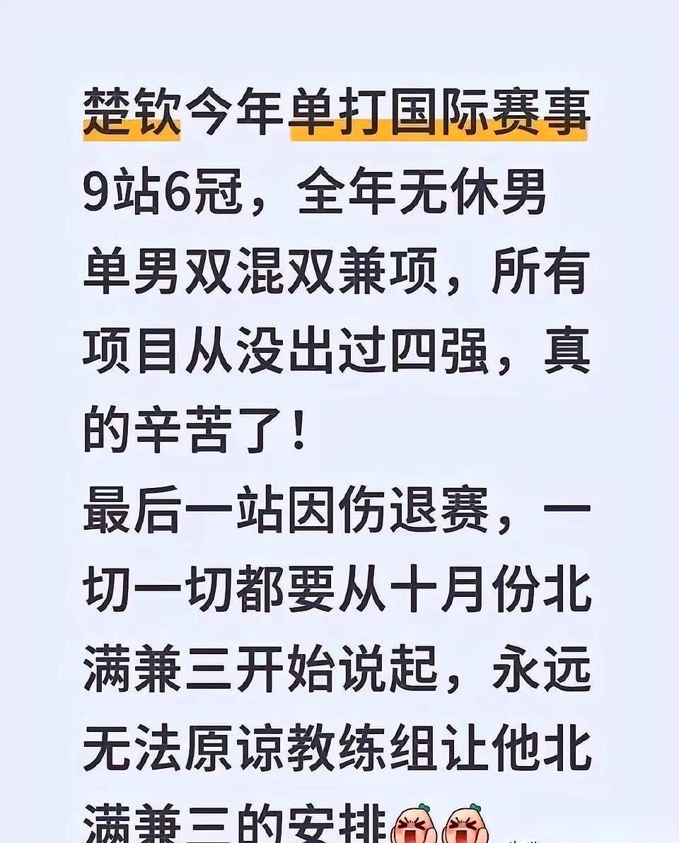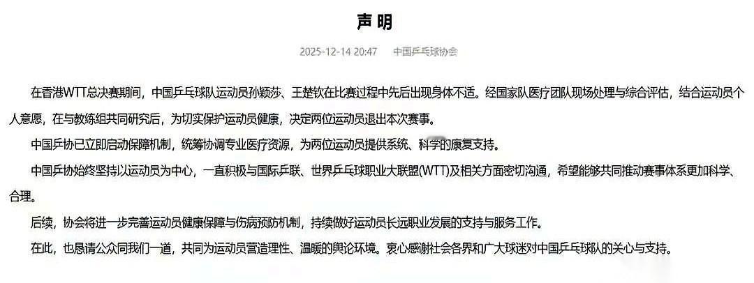 得,官方声明都出来了。 央视新闻也长篇大论了。 孙颖莎,王楚钦,伤了,退了。 我真的一点都不意外。 真的。 我就想问问安排赛程的人,你们晚上睡觉吗? 晚上10点才开始的比赛,你觉得很正常? 把人当铁打的?一天三赛,上午打完下午打,下午打完晚上接着打。 打完就完了? 后面还有采访,还有尿检,一套流程走下来,回到酒店几点了? 饭没吃,理疗没做,连复盘看个录像的时间都没有。 第二天睁眼,又是新的一轮消耗。 说句不好听的,咱国乒是没人了吗? 后备梯队呢?那些小将呢? 非得逮着这一对“王炸”往死里用? 这是打比赛,还是在榨油啊? 总有人觉得,乒乓球火了,票好卖了。 别天真了。 你看看“冠军之夜”的观众席,空得能跑马。为什么? 因为打球的那两个人,不在了啊。 邓亚萍大魔王早就把这事儿说透了:观众买票,是来看‘人’的,不是纯来看球的。 你把人给累垮了,把大家想看的那束光给掐灭了。 还谈什么以后,谈什么市场。 真是可笑。