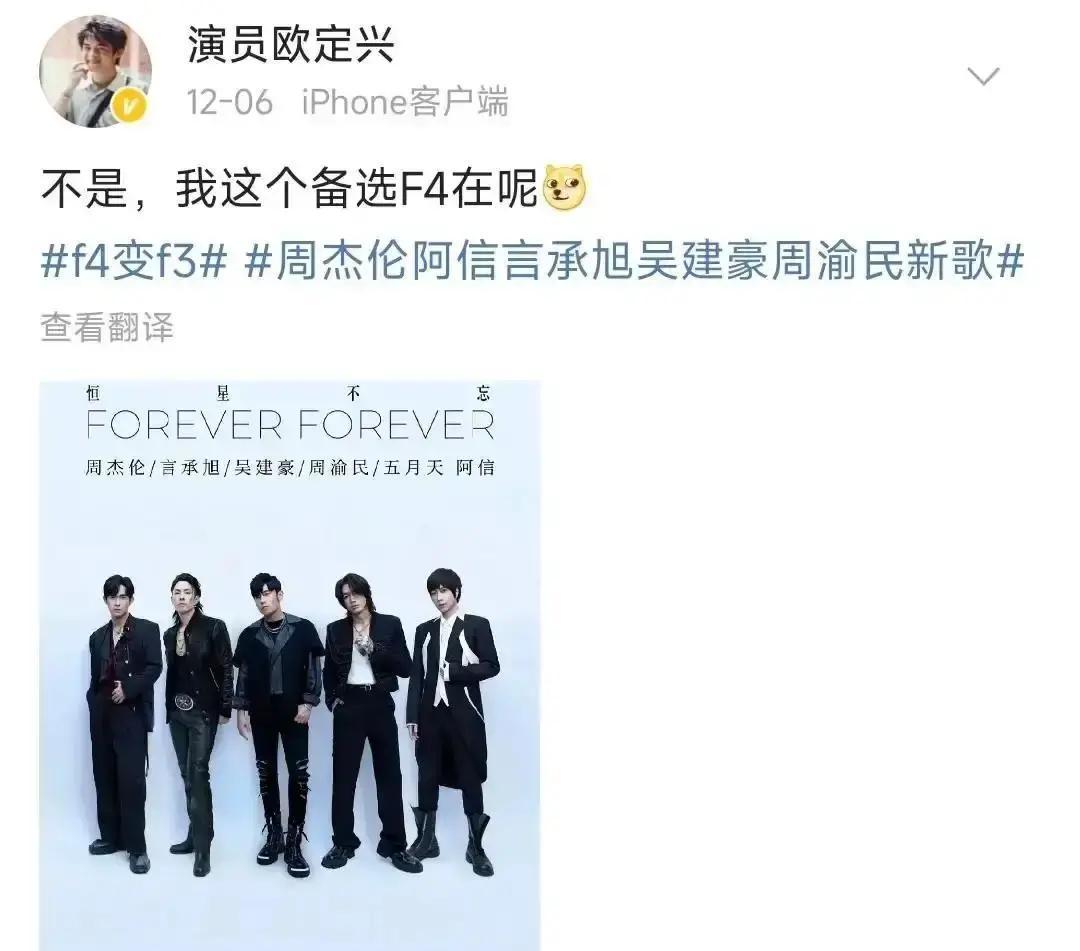 最狠的回应,不是写小作文,是直接让他从你的世界里消失。 朱孝天看到那条“某位F4早被除名”的微博,没评论,没反驳,只是抬手把欧定兴屏蔽了。动作干脆得像西门总二郎关上一扇不想再进的门。二十年前的同事,用一张旧剧照和含糊其辞,想撬开他今天平静生活的大门。 他屏蔽的不是一个人,是一种生存模式。欧定兴需要流量,商演报价和直播数据需要话题。但朱孝天早就不玩这个游戏了,他的收入来自茶具和太极课,他的价值不需要“西门”来背书。更关键的是,网友扒出欧定兴几年前点赞过嘲讽他的帖子——成年人的断交,往往源于无数个这样微小的不体面瞬间。 这件事哪是明星玻璃心?是你我都可能遇到的边界战。总有人想用“共同回忆”的名义,免费征用你的过去,为他的现在买单。娱乐圈天天收“情怀税”,但真正的体面人,早就关闭了支付通道。你看吴建豪还能和他喝茶,因为那是真朋友,从不消费他。 保护过去最好的方式,不是反复提起,而是安静翻页。你的世界,由你决定谁有门票。