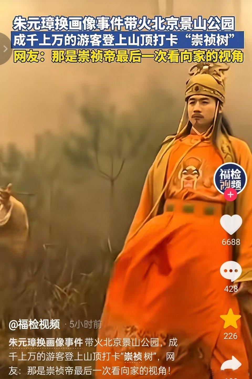 朱元璋换画像事件带火北京景山公园!成千上万的游客登上山顶打卡崇祯树。网友:那是崇祯帝最后一次看向家的视角。