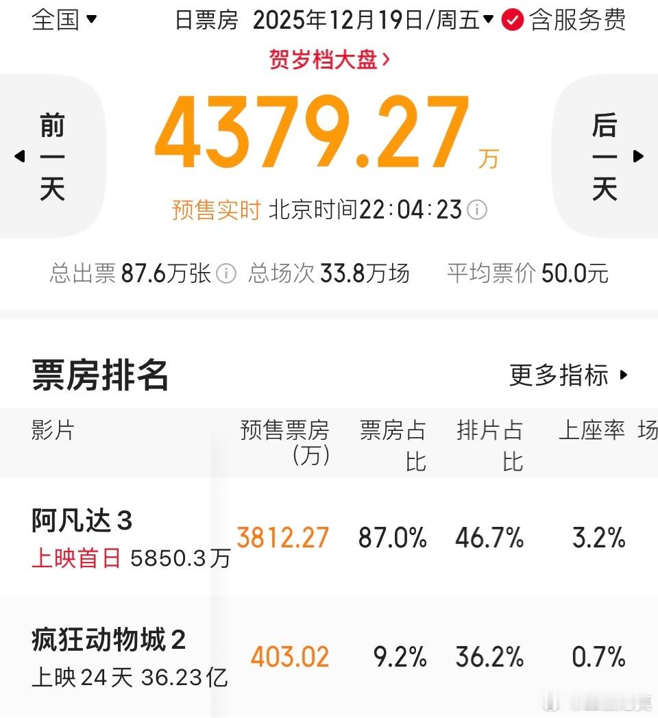 市场对《阿凡达3》真的是一点信心都没有。明天正式上映,早上看,预排片还有52%,但现在去看已经降到46.7%了。《阿凡达3》这一次真的是凶多吉少啊!