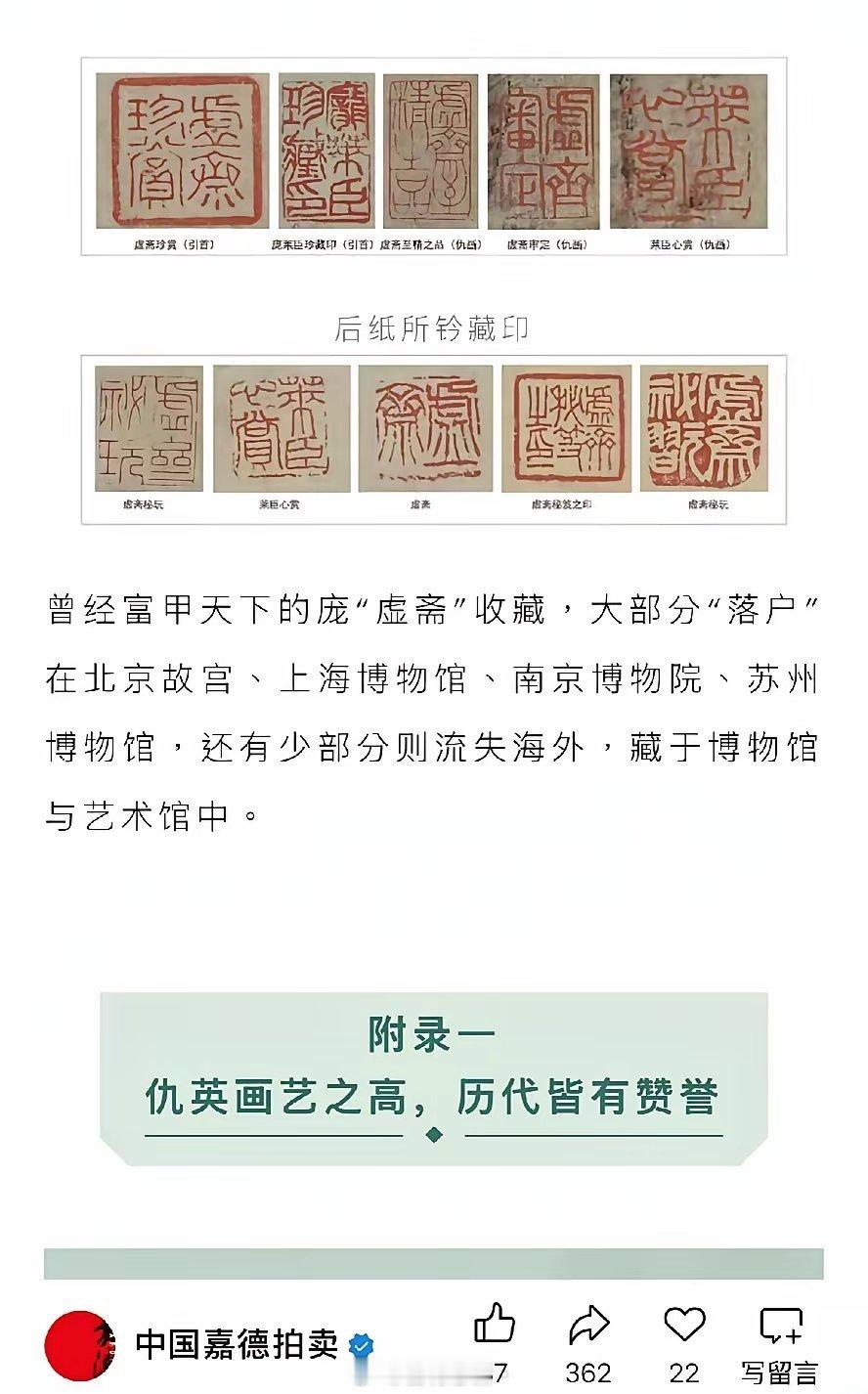 仇英《江南村图》如果拍卖为真迹,那8800万,属实捡漏了。后面还有文征明沈周等人题跋,嘉德拍卖 公众号发了,有虚斋印。中国画和外国画不一样,中国画传统就是收藏者会在画外围空白处盖章或写字来证明画的归属和传承。搞到现在,那些收藏章和收藏者的题字反而变成古画传承有序的证明了,且看南京博物院怎么收场了。
