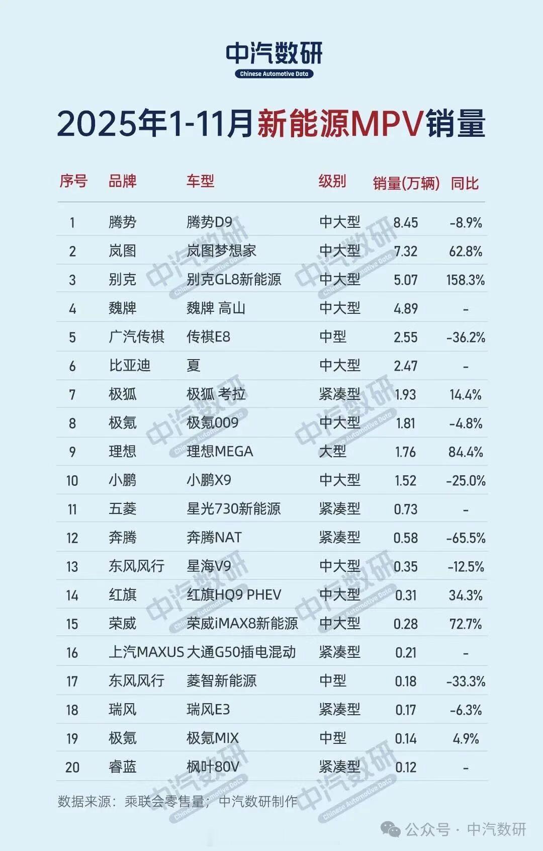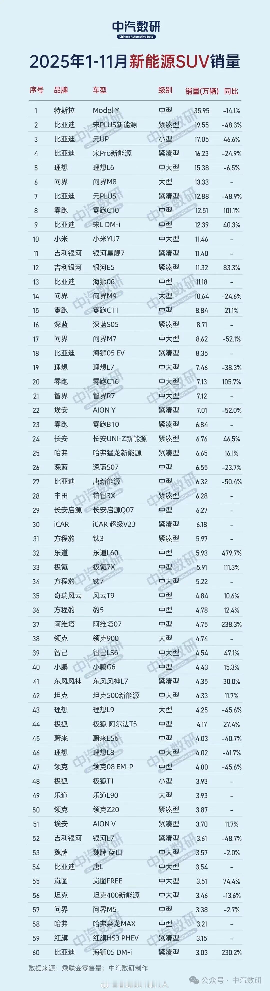 中汽数研统计2025年1-11月份各新能源车型累计销量的排行数据。轿车前10为:- 星愿,宏光MINIEV,秦PLUS,海鸥,秦L,小米SU7,海豹06,Model 3,小鹏MONA M03,熊猫SUV前10为:- Model Y,宋PLUS新能源,元UP,宋Pro新能源,理想L6,问界M8,元PLUS,零跑C10,宋L DM-i,小米YU7MPV前10为:- 腾势D9,岚图梦想家,别克GL8新能源,魏牌高山,传祺E8,夏,极狐考拉,极氪009,理想MEGA,小鹏X9