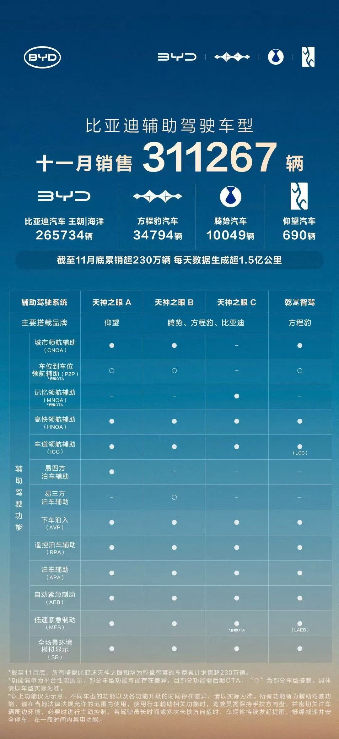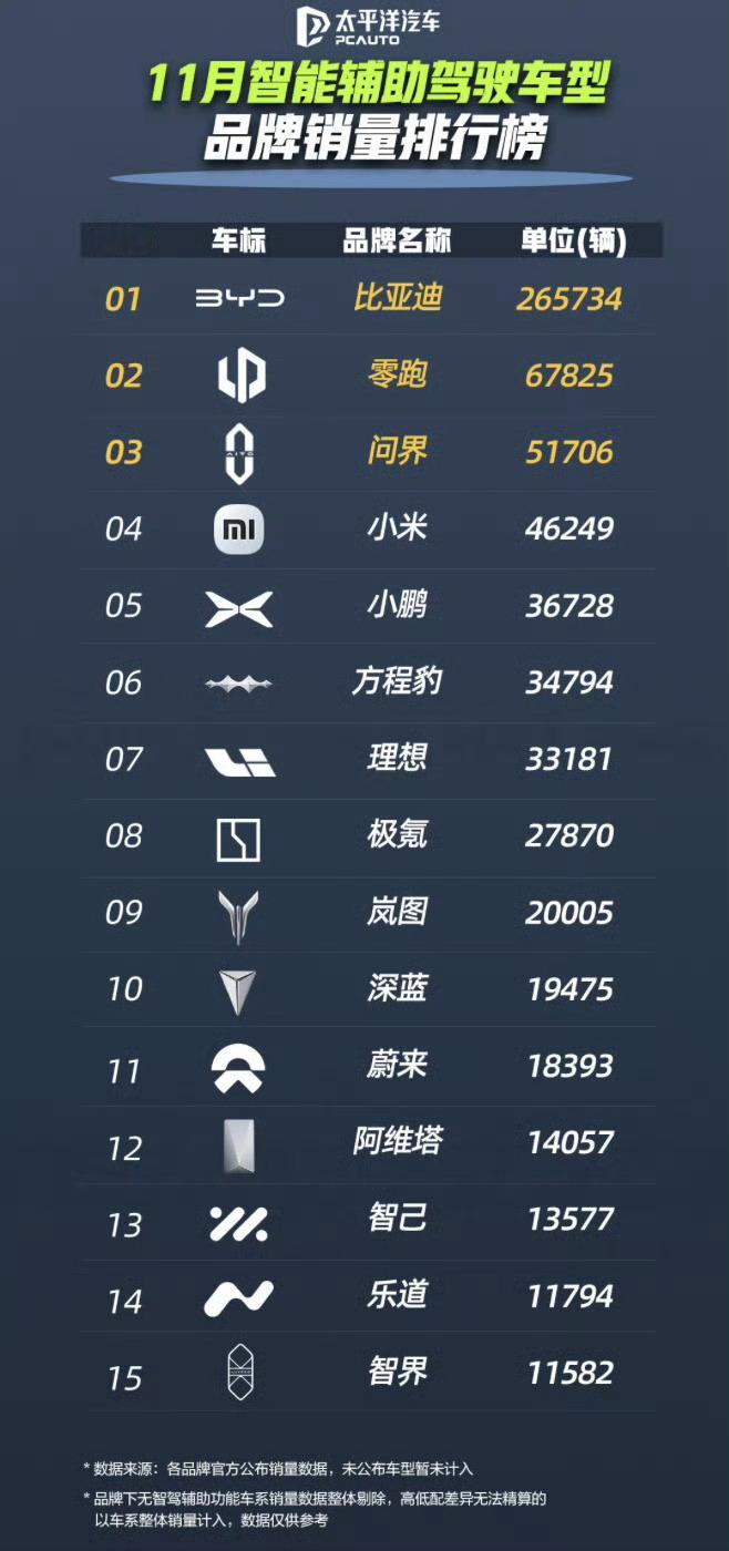 比亚迪是真的强,11月销量就达到了311267辆,累计突破230万的战绩,并且比亚迪这些车型还都具备智驾辅助能力,也就是说比亚迪在辅助驾驶推广方面非常强。如此庞大的销量,带来的必然是海量用户每日超1.5亿公里的路况数据,这能驱动系统不断优化迭代,实现“越用越好”的体验闭环。比亚迪更以硬核安全承诺与持续OTA升级,打消了用户顾虑、刷新驾乘体验。当智能辅助驾驶从“配置亮点”升级为“购车刚需”,智驾辅助必然也会成为未来的主流,会越来越多的人首选这类车型。
